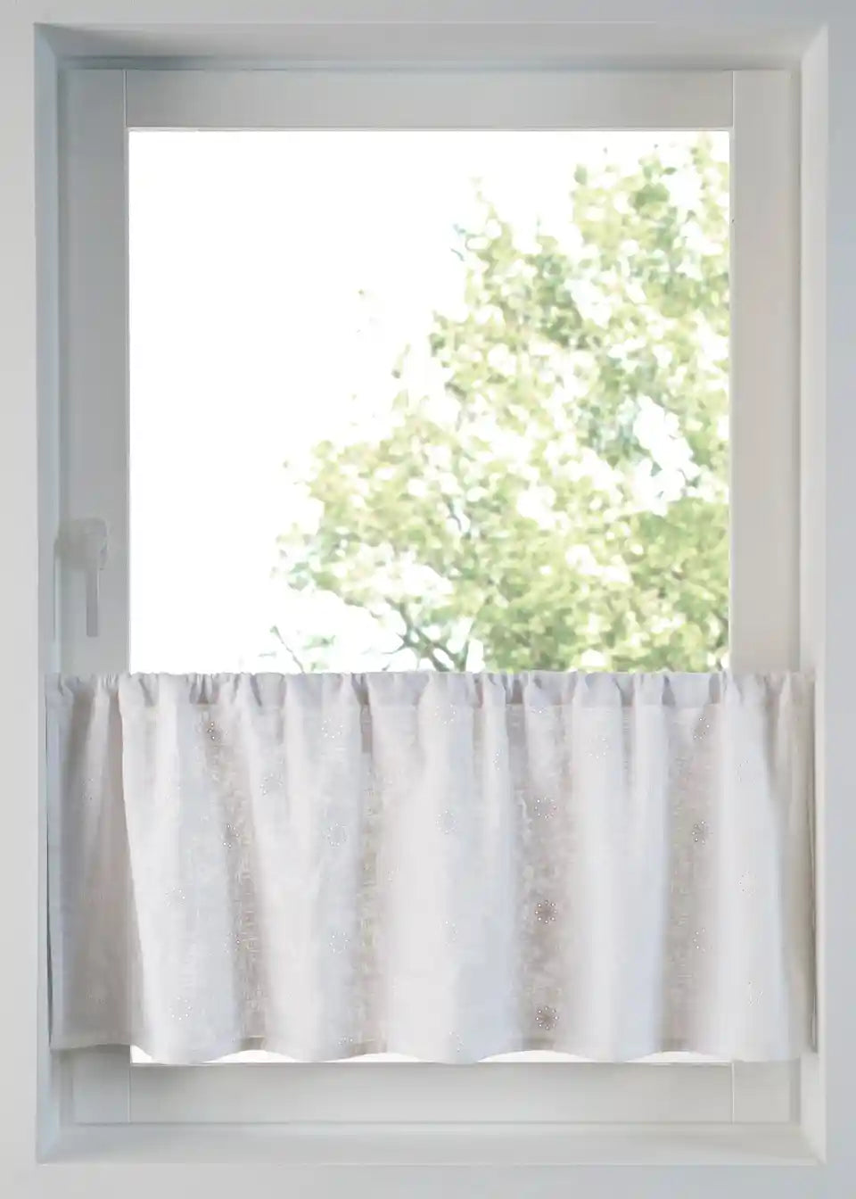 Kuhinjska zavjesa u modernom rustikalnom stilu nudi male detalje koji je čine posebnom. Izrađena je u dva sloja od visokokvalitetnog bio pamuka i ima nježan cvjetni vez. Idealna dekoracija za tvoj mali prozor.