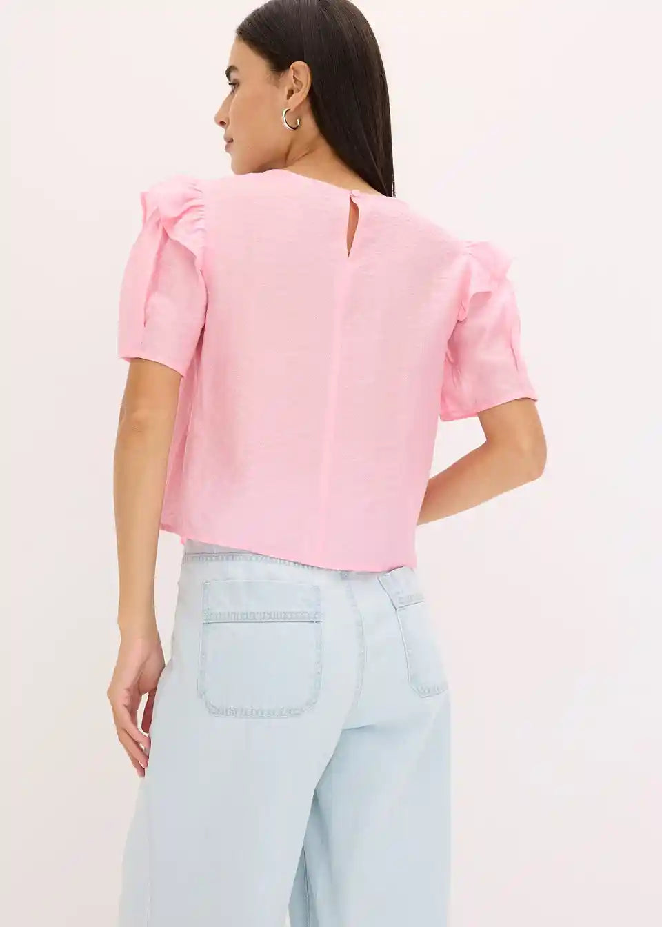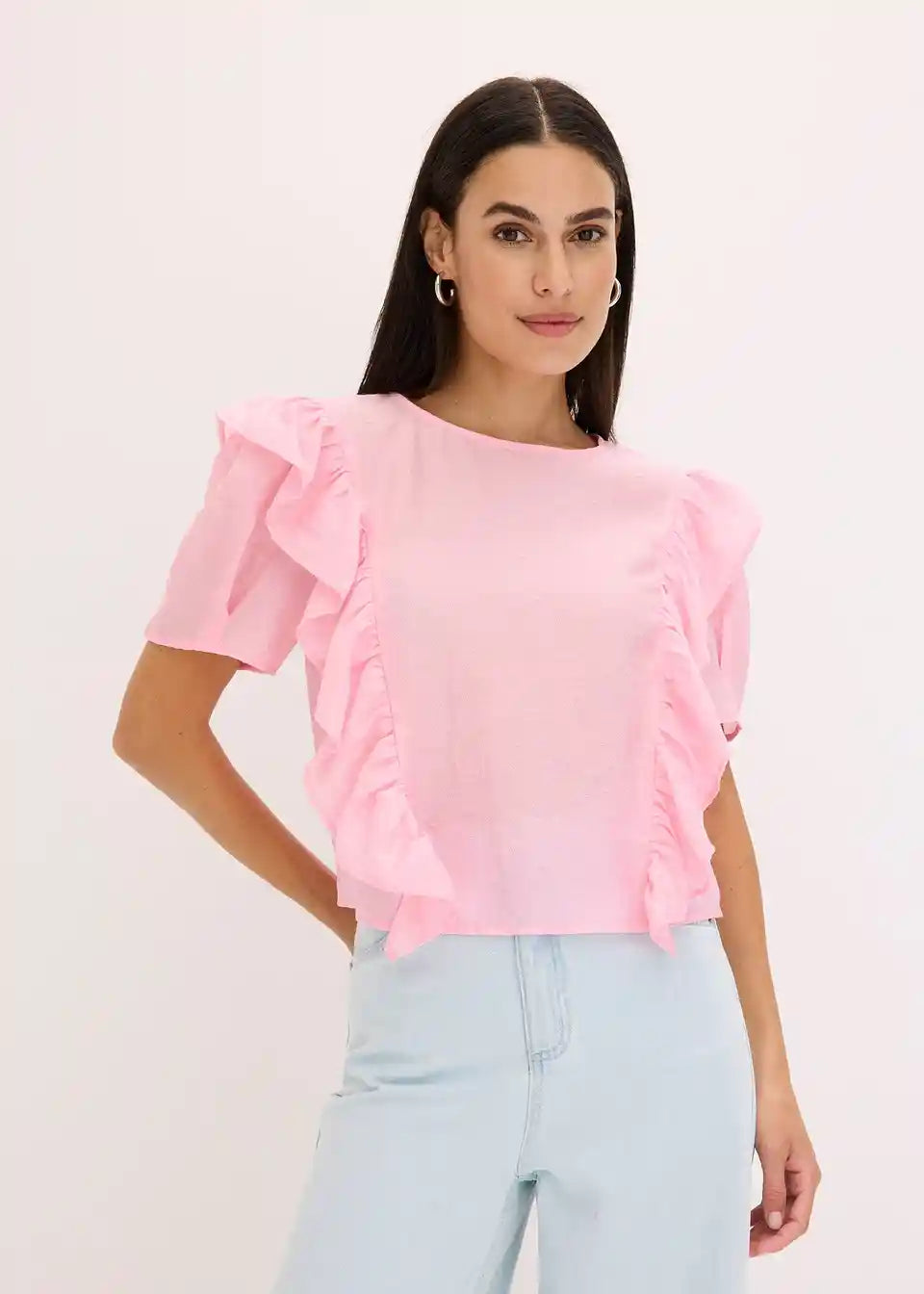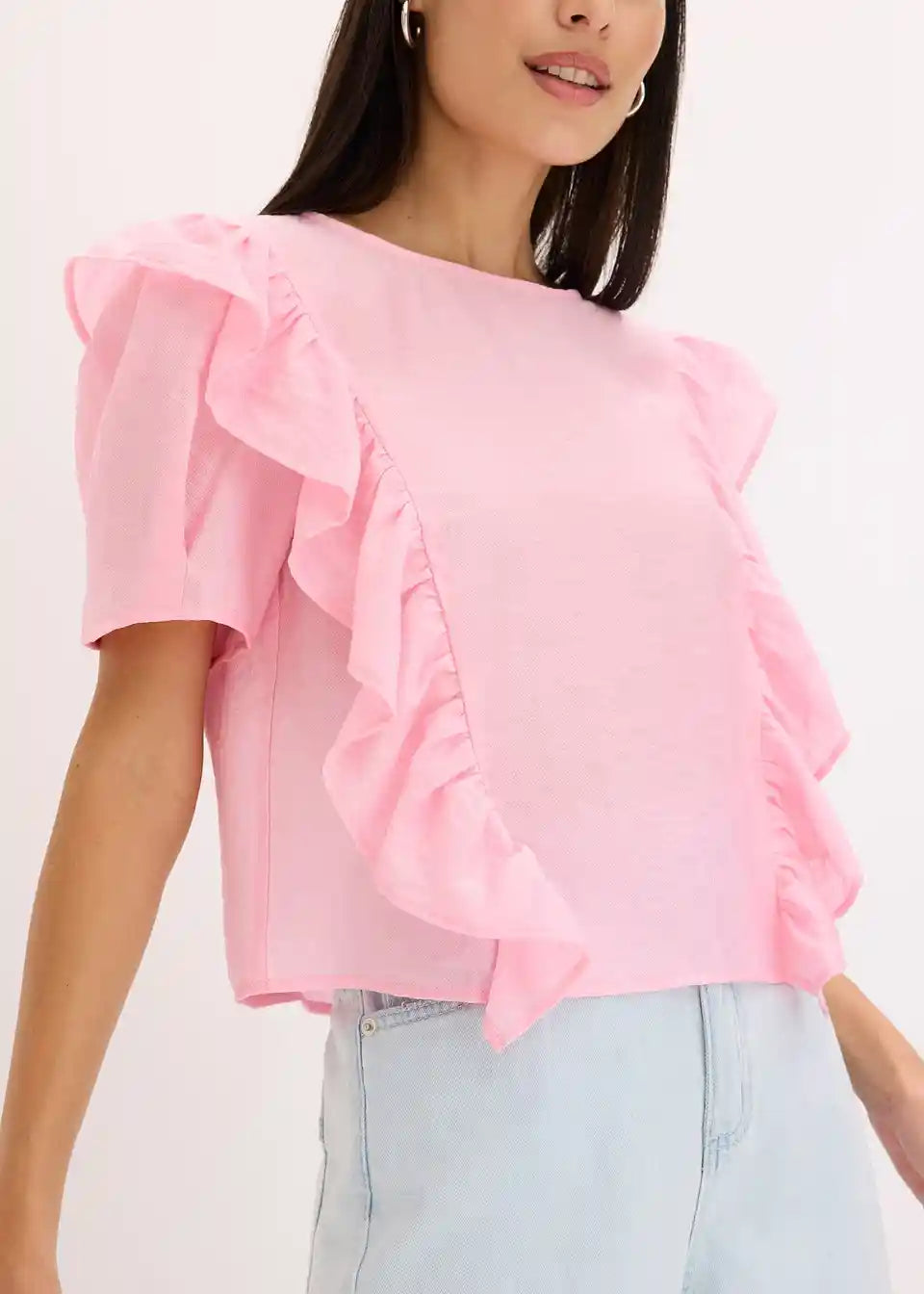 moderna bluza s volanima sprijeda i kopčanjem na gumb straga na izrezu