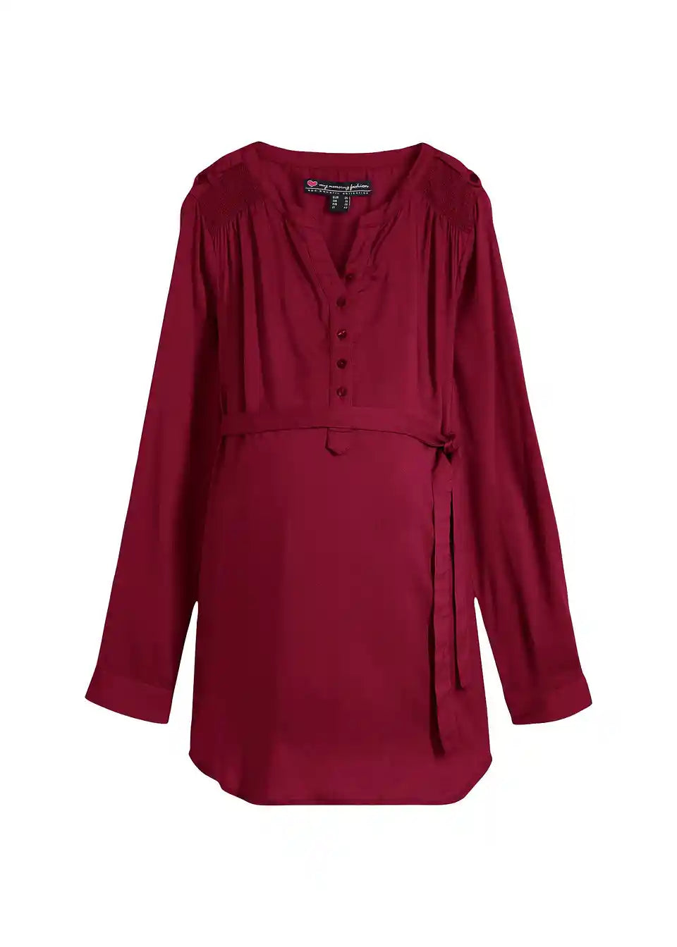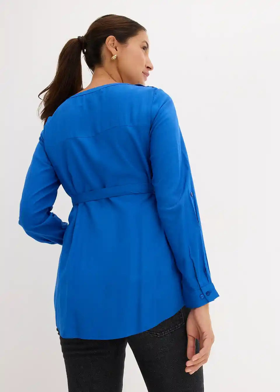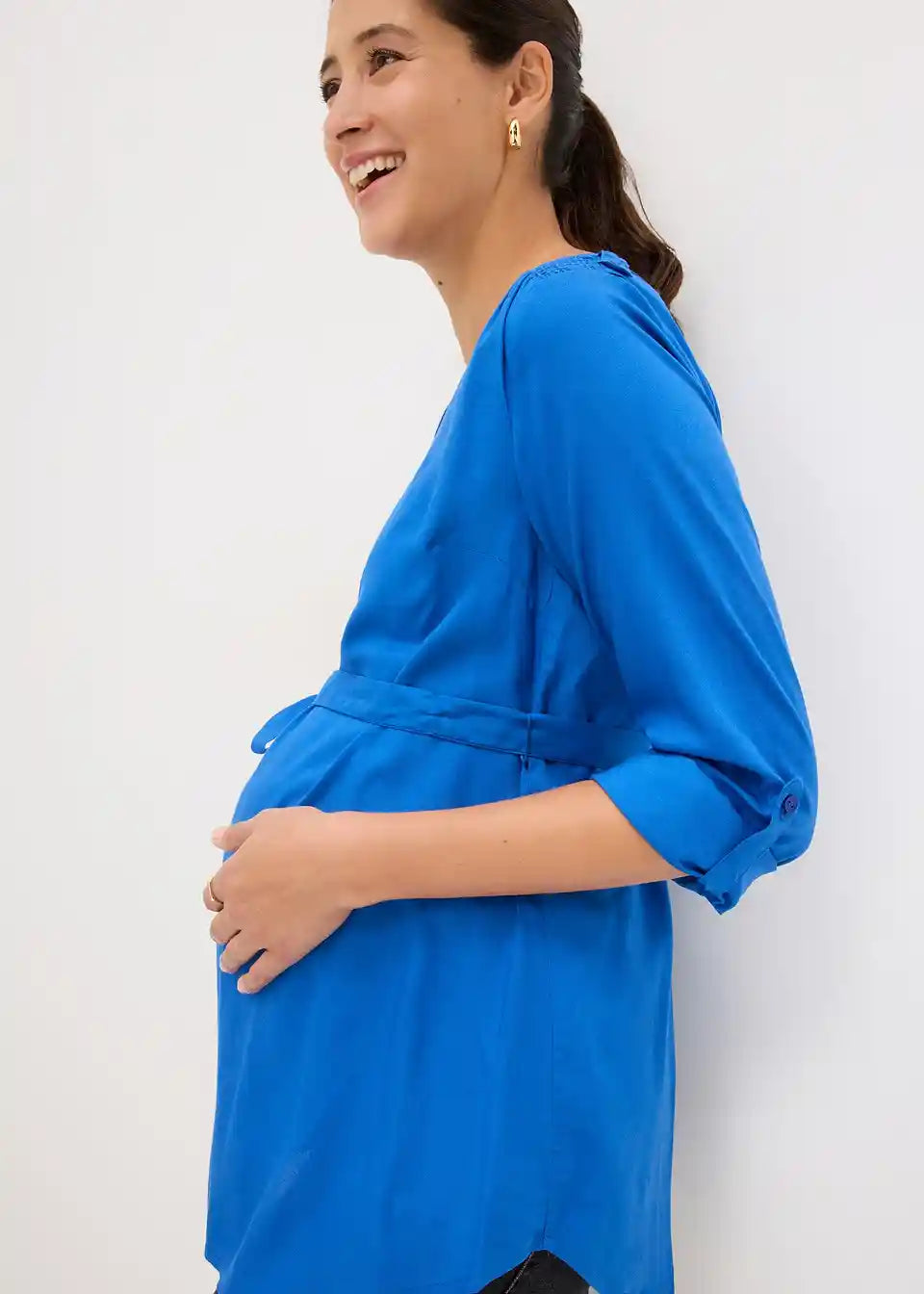 Bluza za trudnice prilagođava se rastućem trbuhu zahvaljujući laganom materijalu od viskoze i ugodno prianja uz kožu. Pojas za vezanje dodatno naglašava trbuh, ali se može i ukloniti. Nakon trudnoće, olakšano je dojenje preko prednjeg reda gumba.