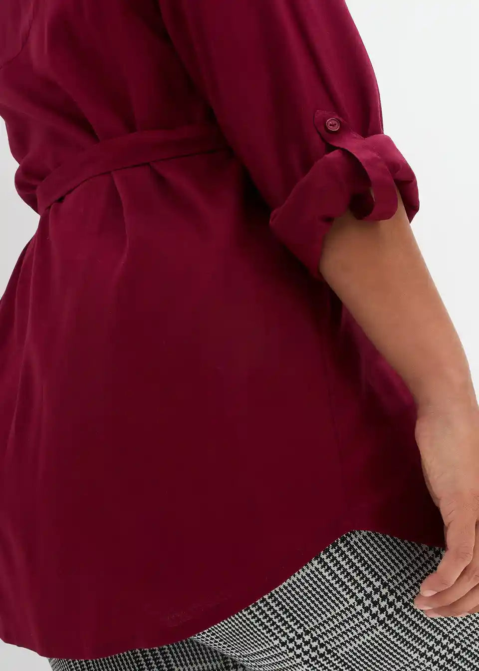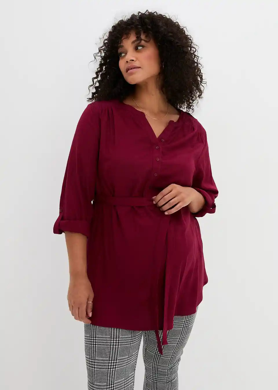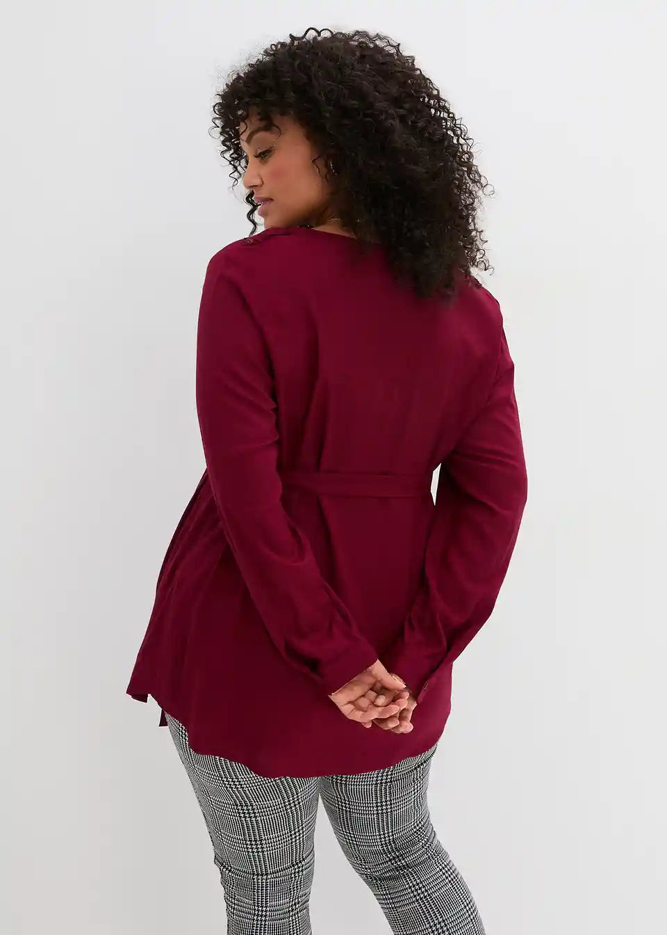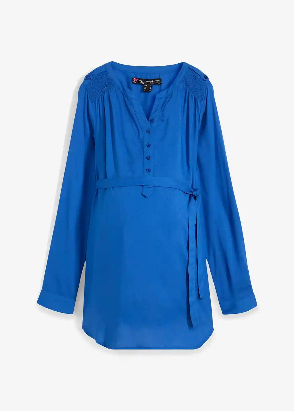 Bluza za trudnice prilagođava se rastućem trbuhu zahvaljujući laganom materijalu od viskoze i ugodno prianja uz kožu. Pojas za vezanje dodatno naglašava trbuh, ali se može i ukloniti. Nakon trudnoće, olakšano je dojenje preko prednjeg reda gumba.