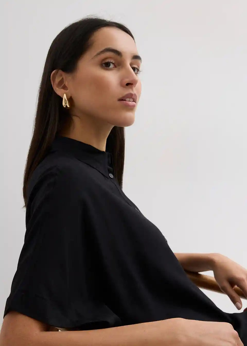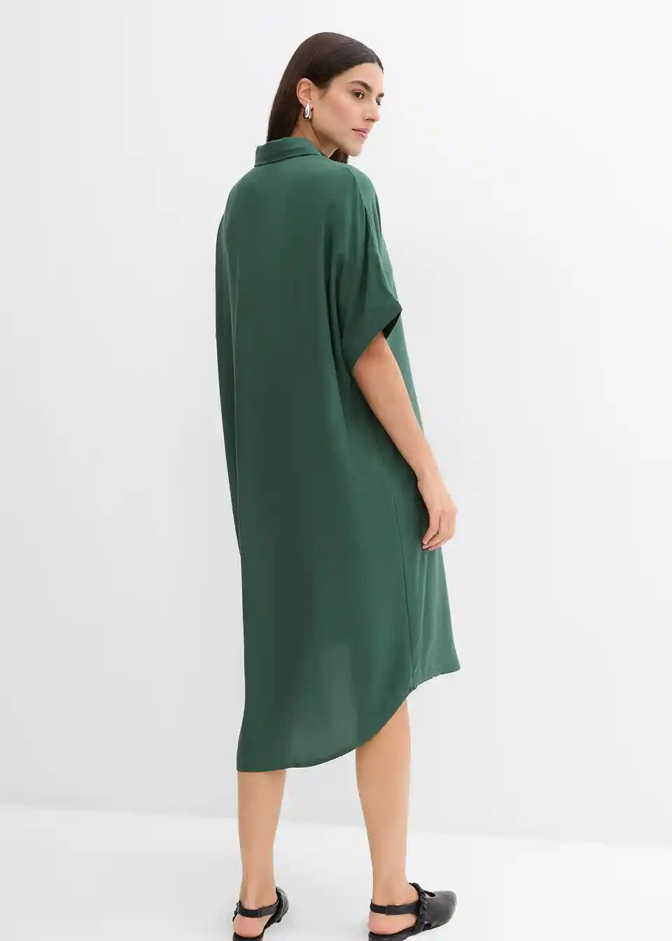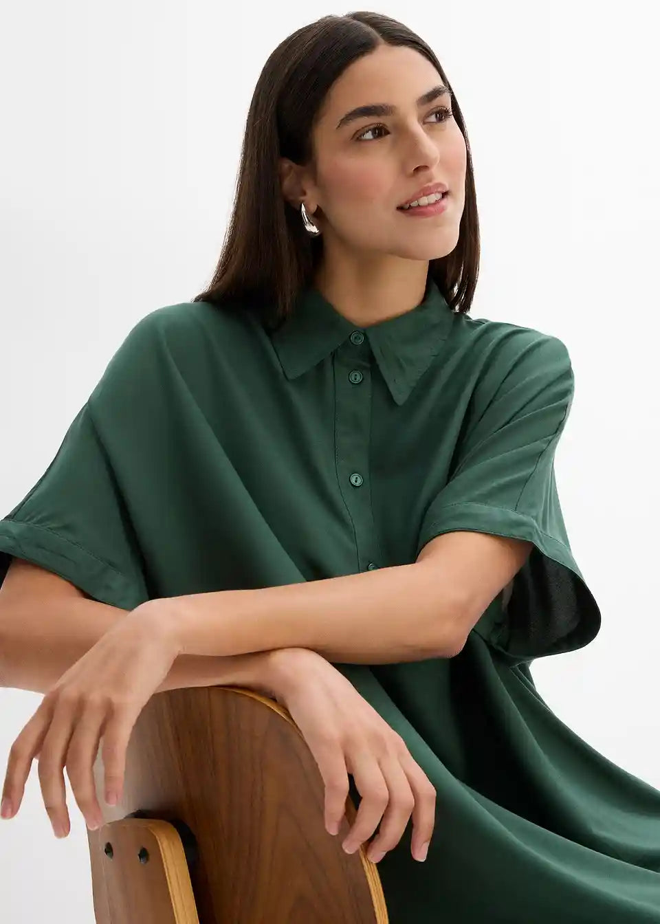 Bluzasta haljina sa stajaćim ovratnikom, kopčanjem sprijeda i zaobljenim rubom
