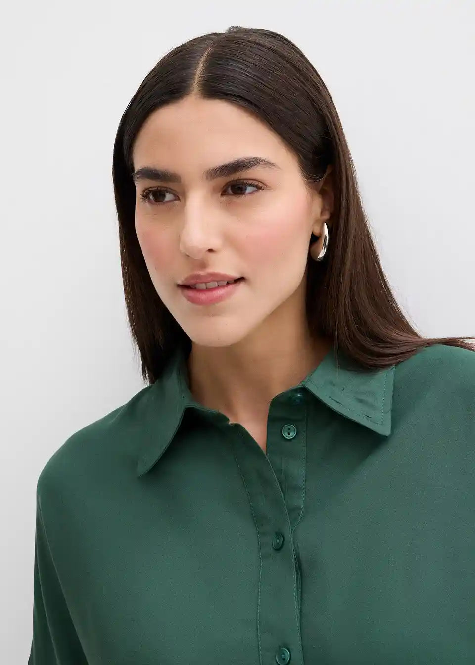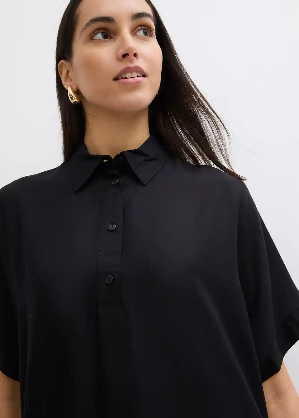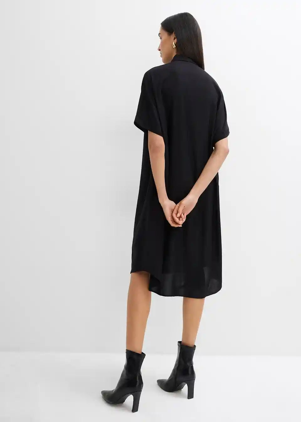 Bluzasta haljina sa stajaćim ovratnikom, kopčanjem sprijeda i zaobljenim rubom