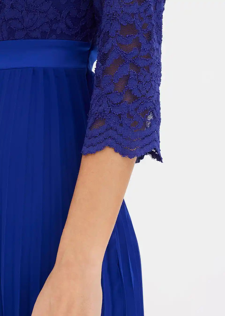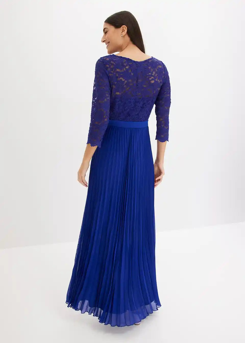 Elegantna i ženstvena: večernja haljina od plisiranog šifona u maksi duljini s čipkom na gornjem dijelu i obrubom u obliku školjke na rukavima