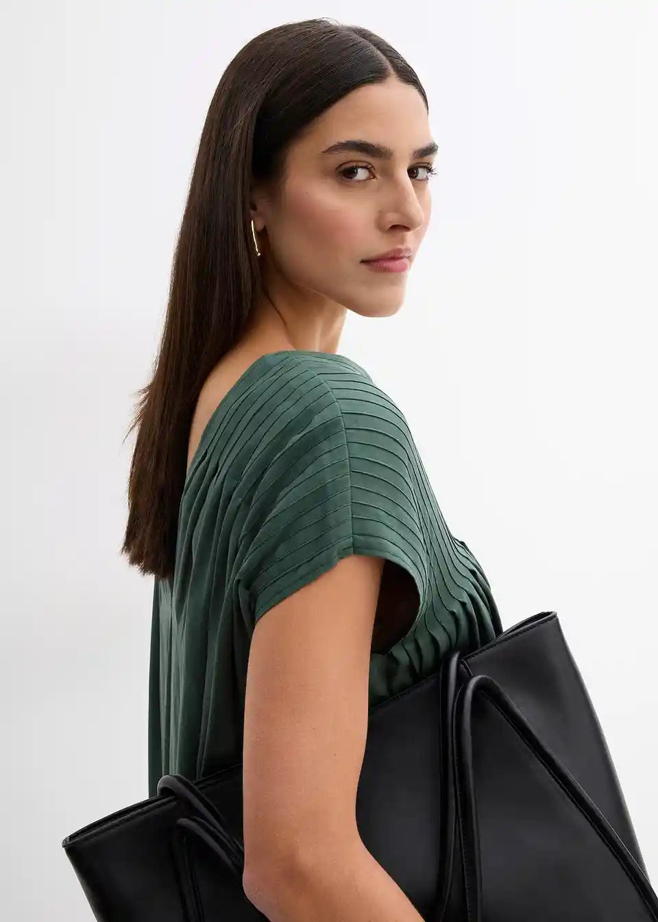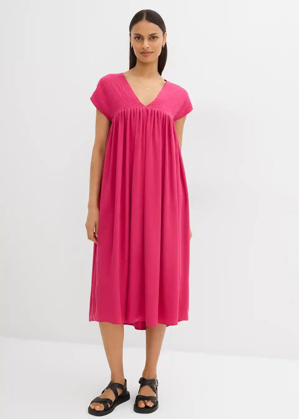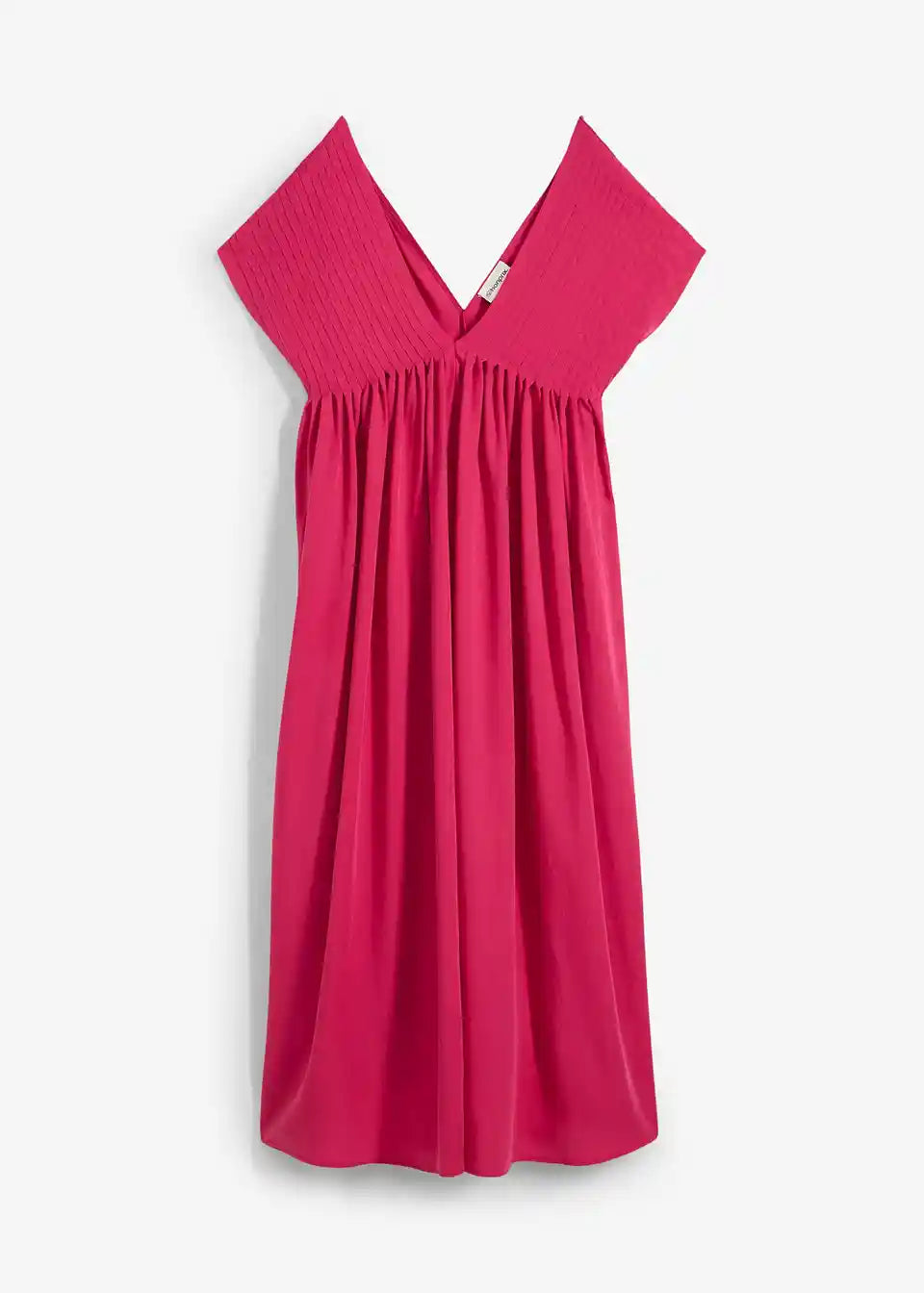 Haljina s V-izrezom sprijeda i straga, ukrasnim naborima i kratkim rukavima te krojem koji prati liniju tijela