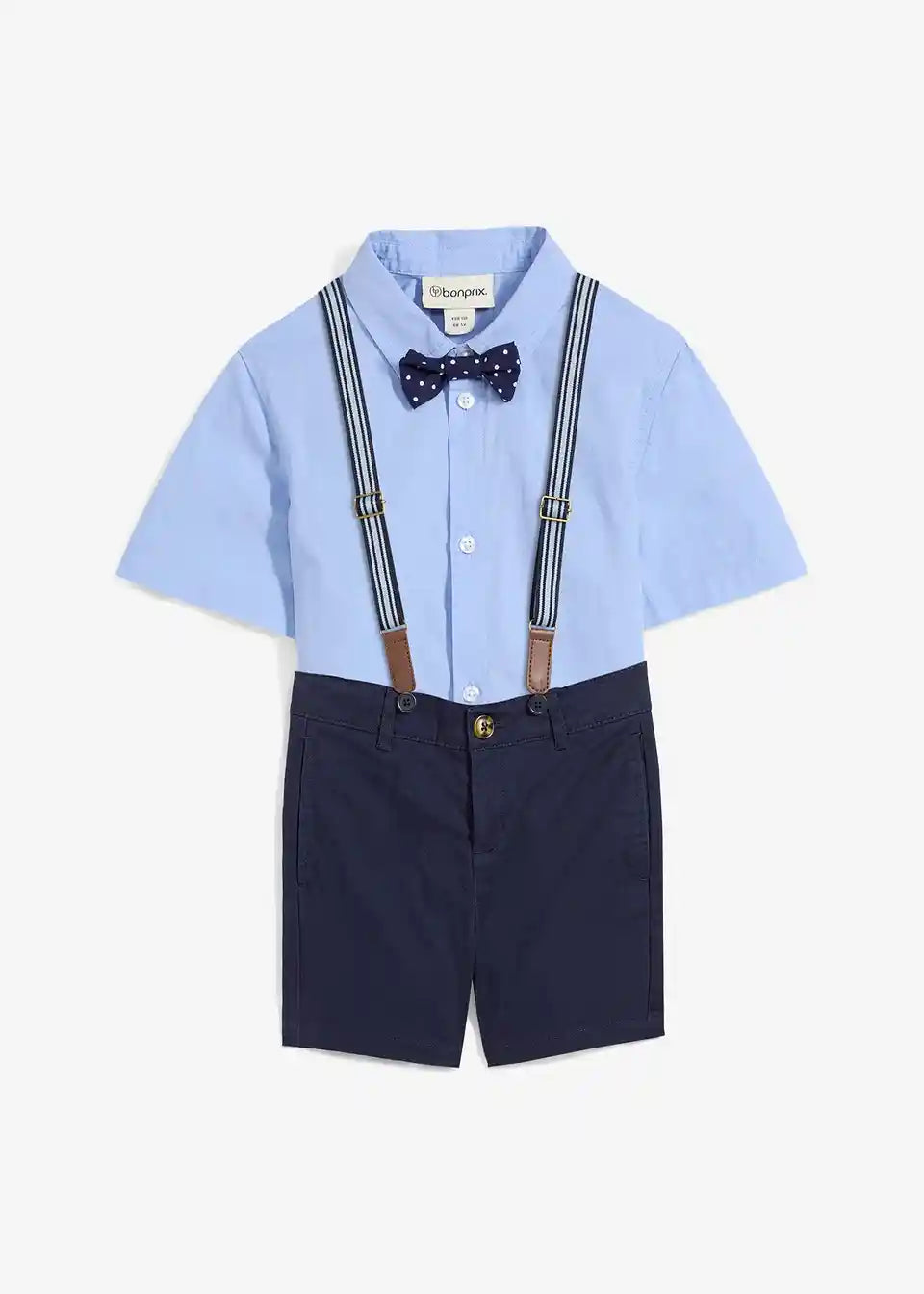 Cool set za dječake, sastoji se od košulje s kratkim rukavima, chino bermuda, podesivih tregera i leptir mašne s točkicama