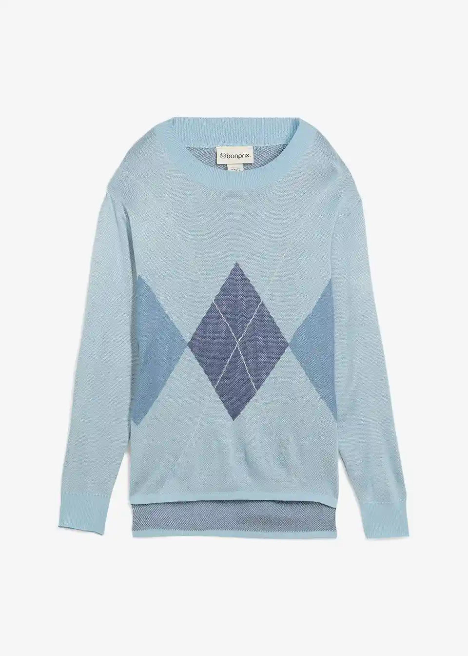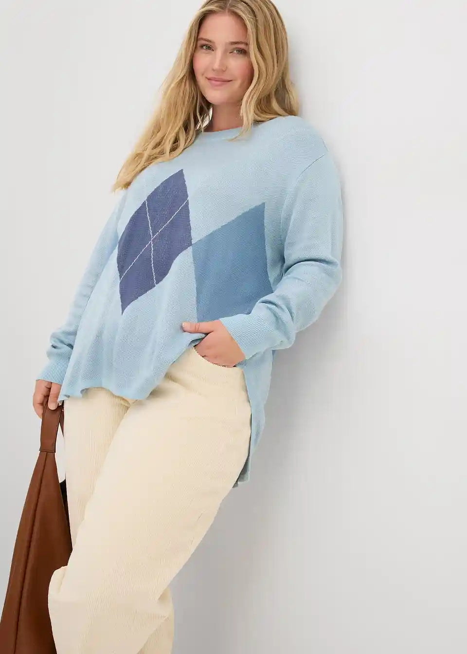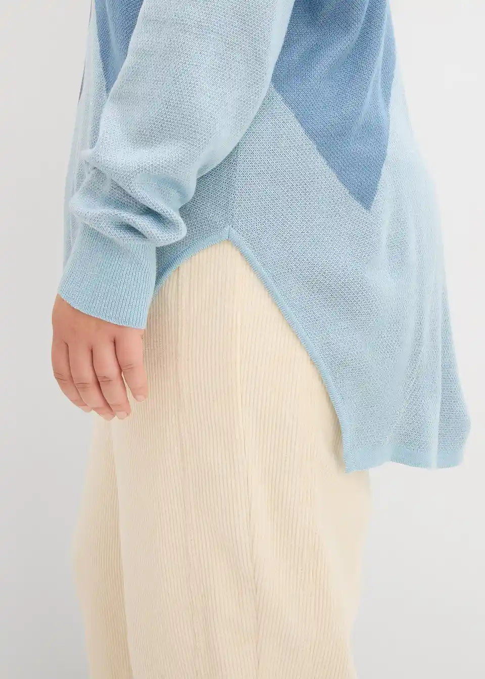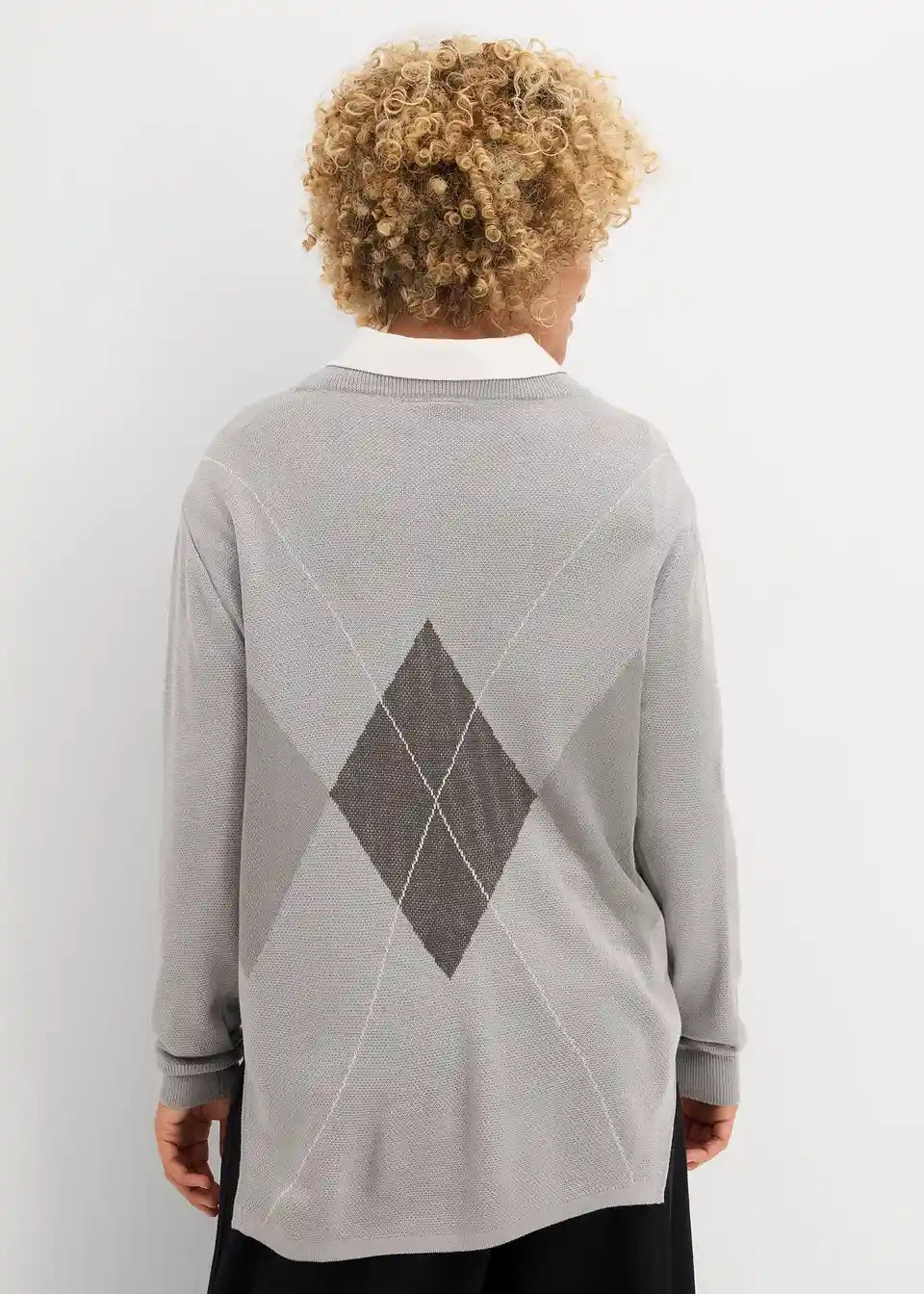 Longpulover s opuštenim ramenom i produženim stražnjim rubom. Širi kroj.