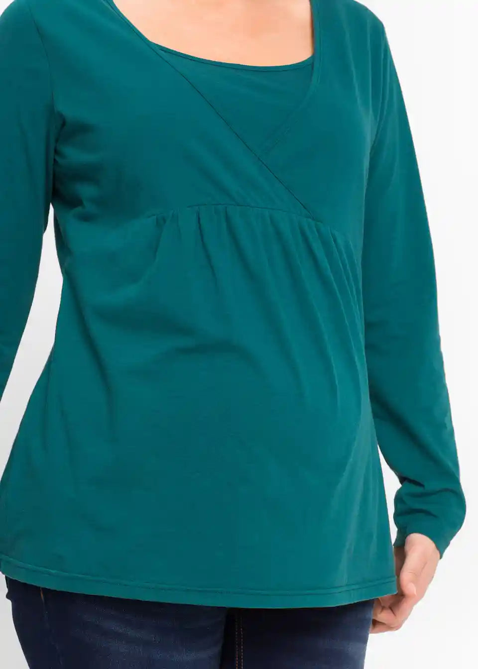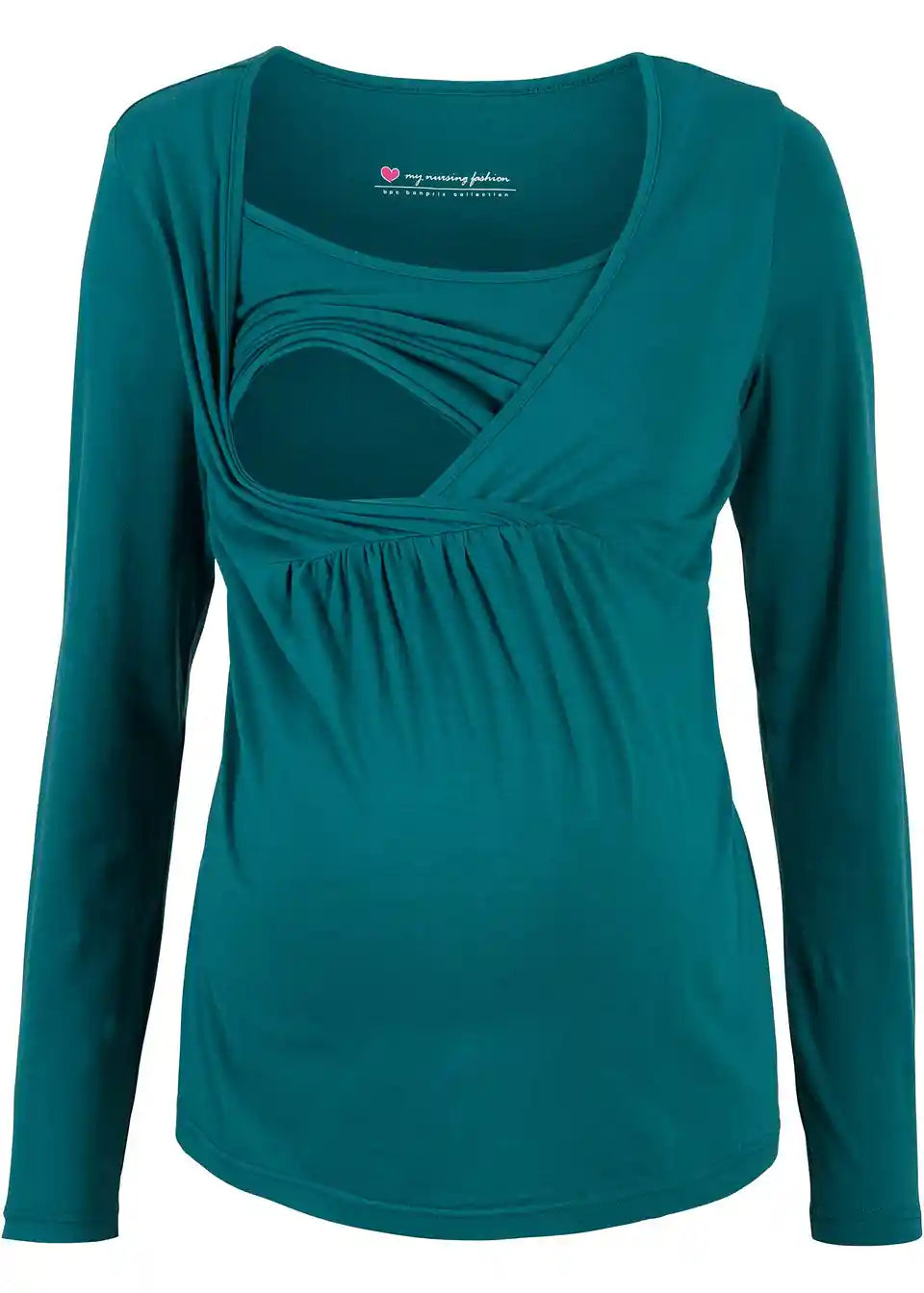 Ova praktična majica udobna je kao jednostavna trudnička majica, a kasnije se može nositi i za dojenje. Zahvaljujući umetku u prednjem dijelu u odgovarajućoj boji, lako se podiže prema gore. Nabiranje na bočnom šavu omogućava da se majica prilagodi tijelu tijekom trudnoće, čineći je pogodnom za svih devet mjeseci trudnoće, kao i za period nakon nje.