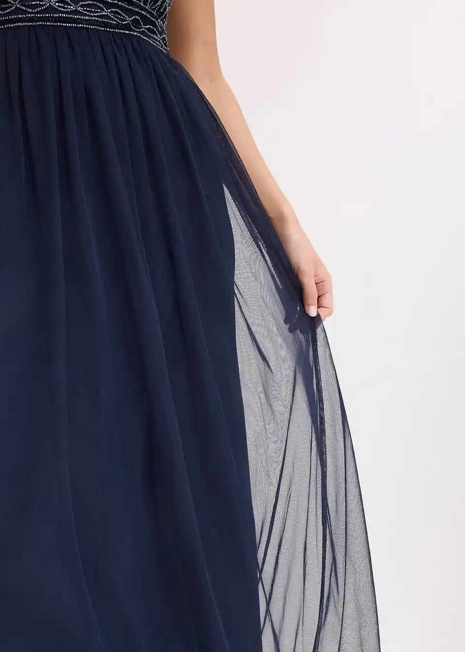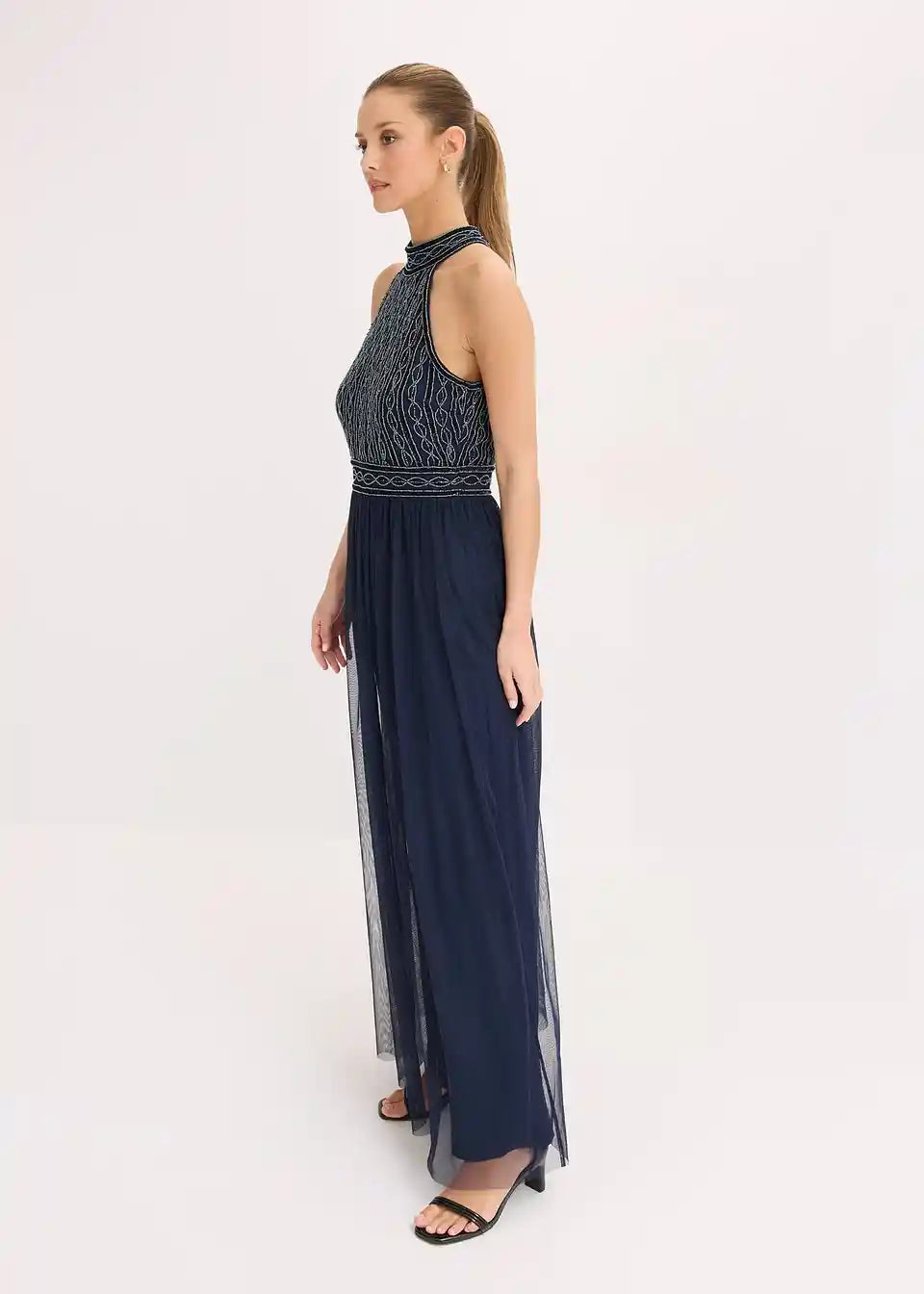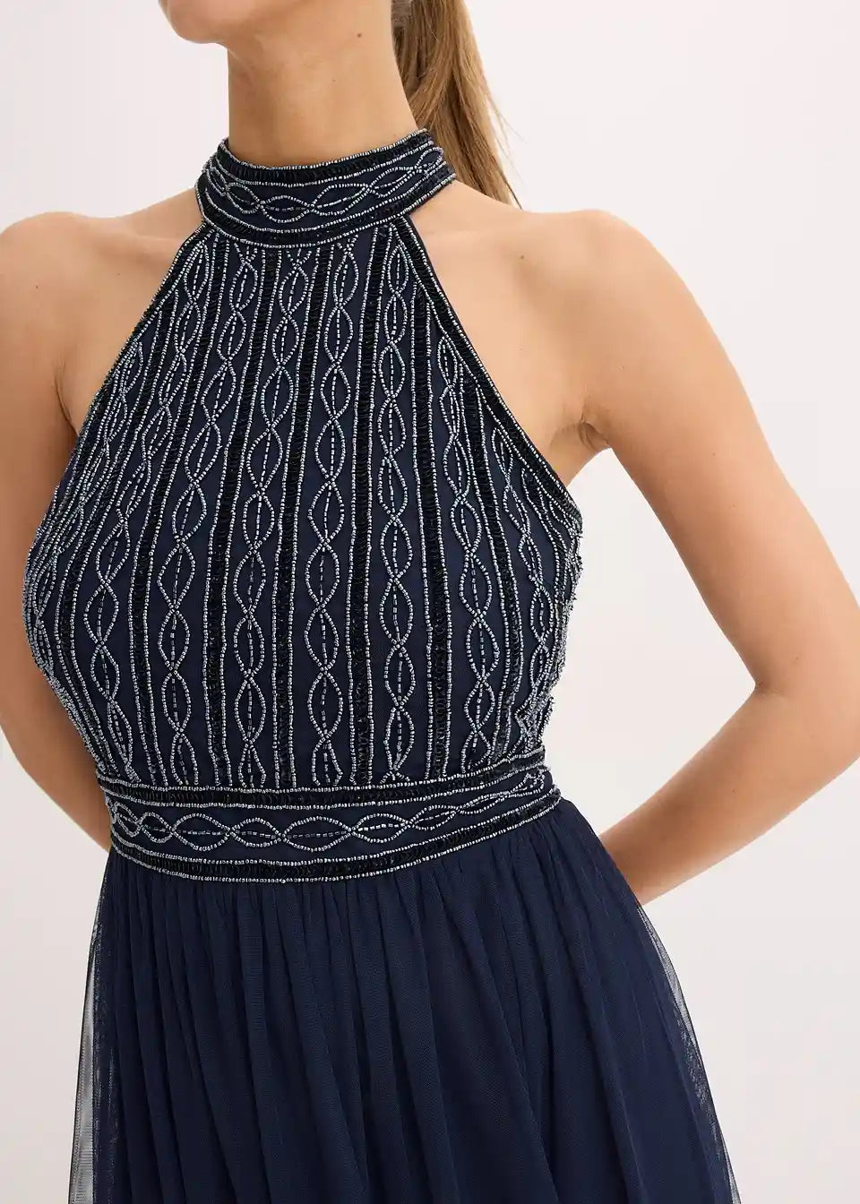 Moderno i ženstveno: večernja haljina maksi dužine s naramenicama oko vrata, od fine til tkanine s izvezenim šljokicama