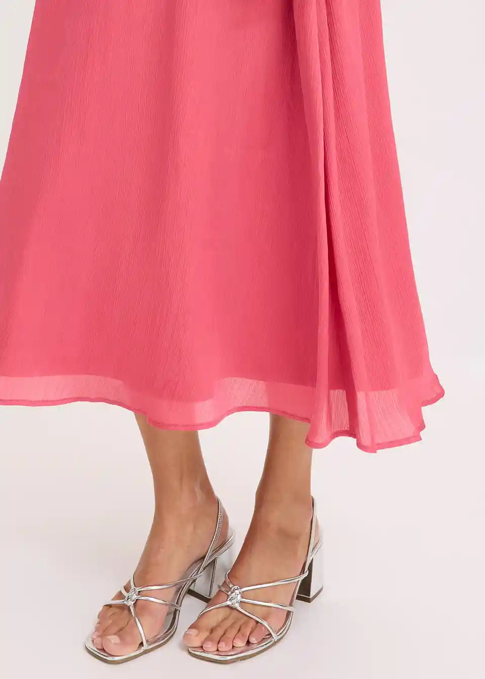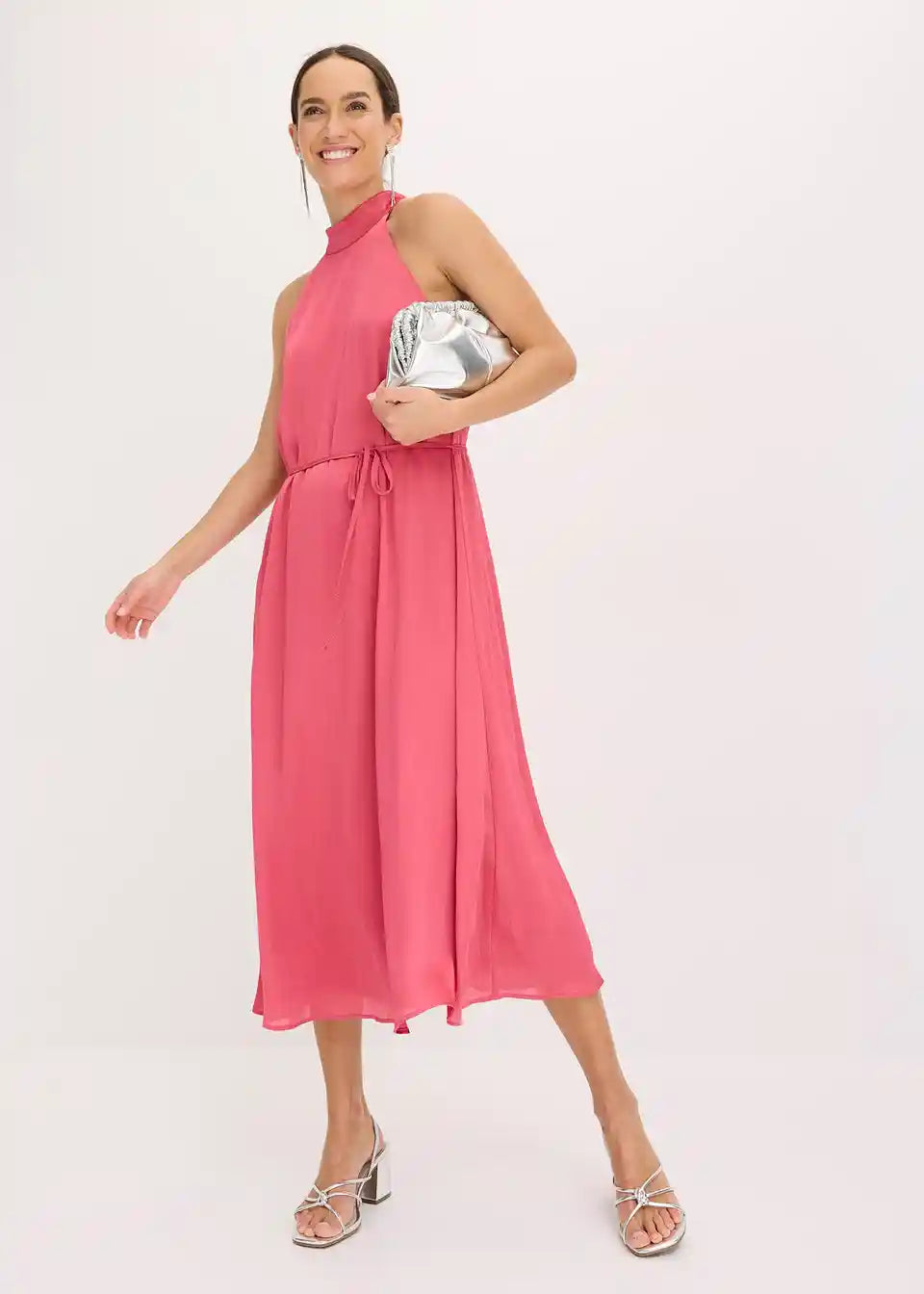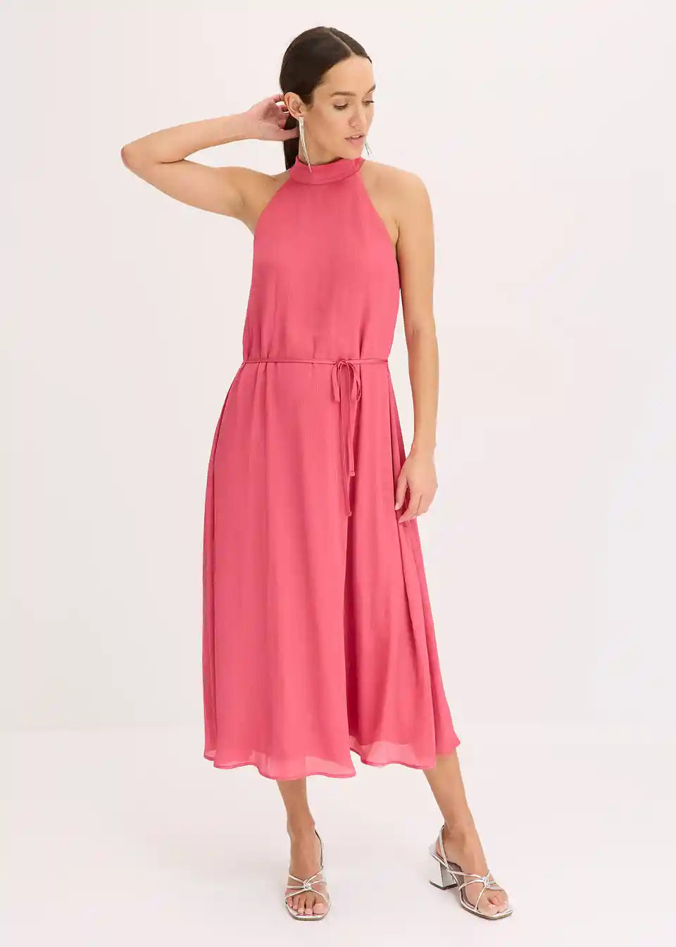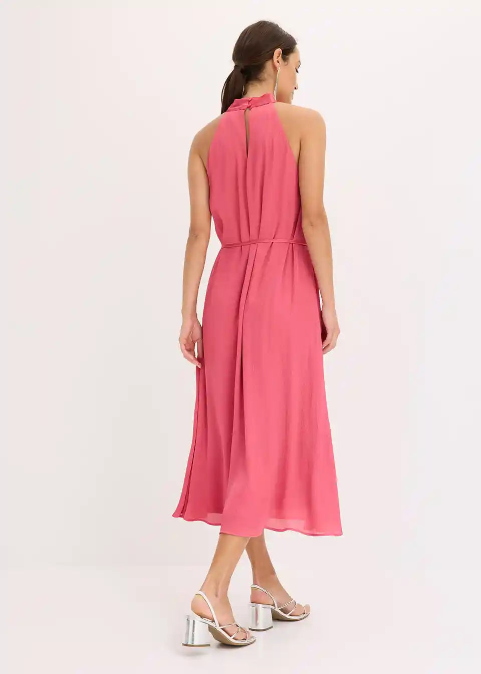 ženstvena midihaljina s vezanjem oko vrata izrađena od lepršavog satenskog krepa