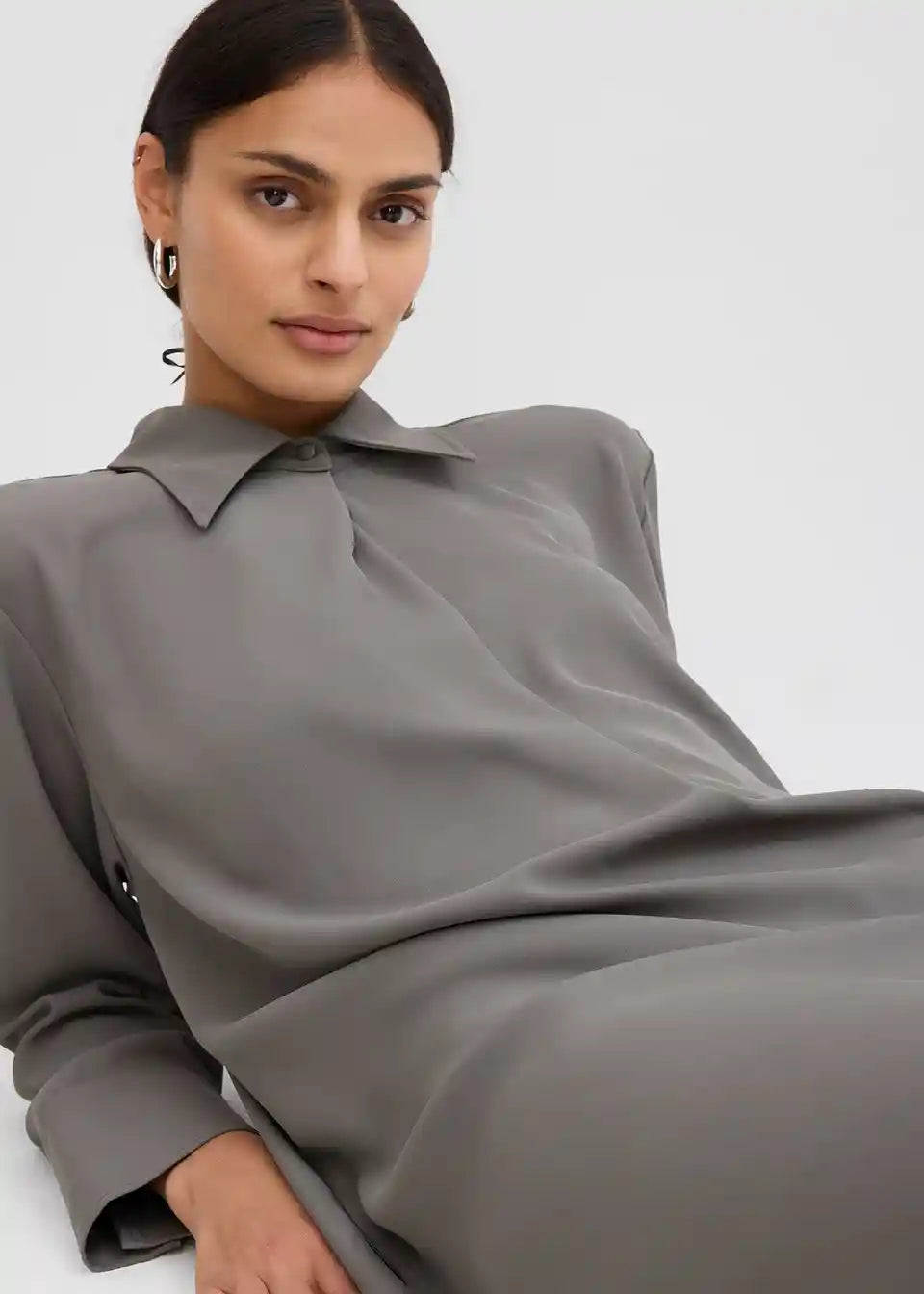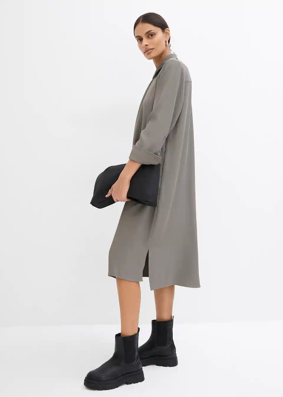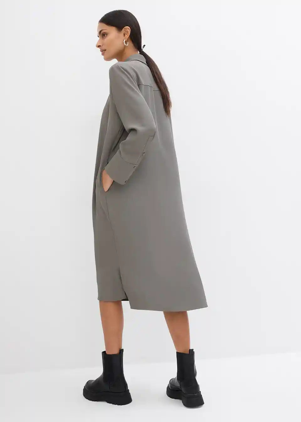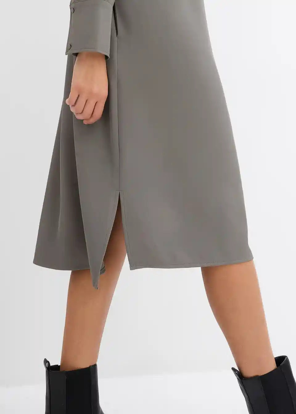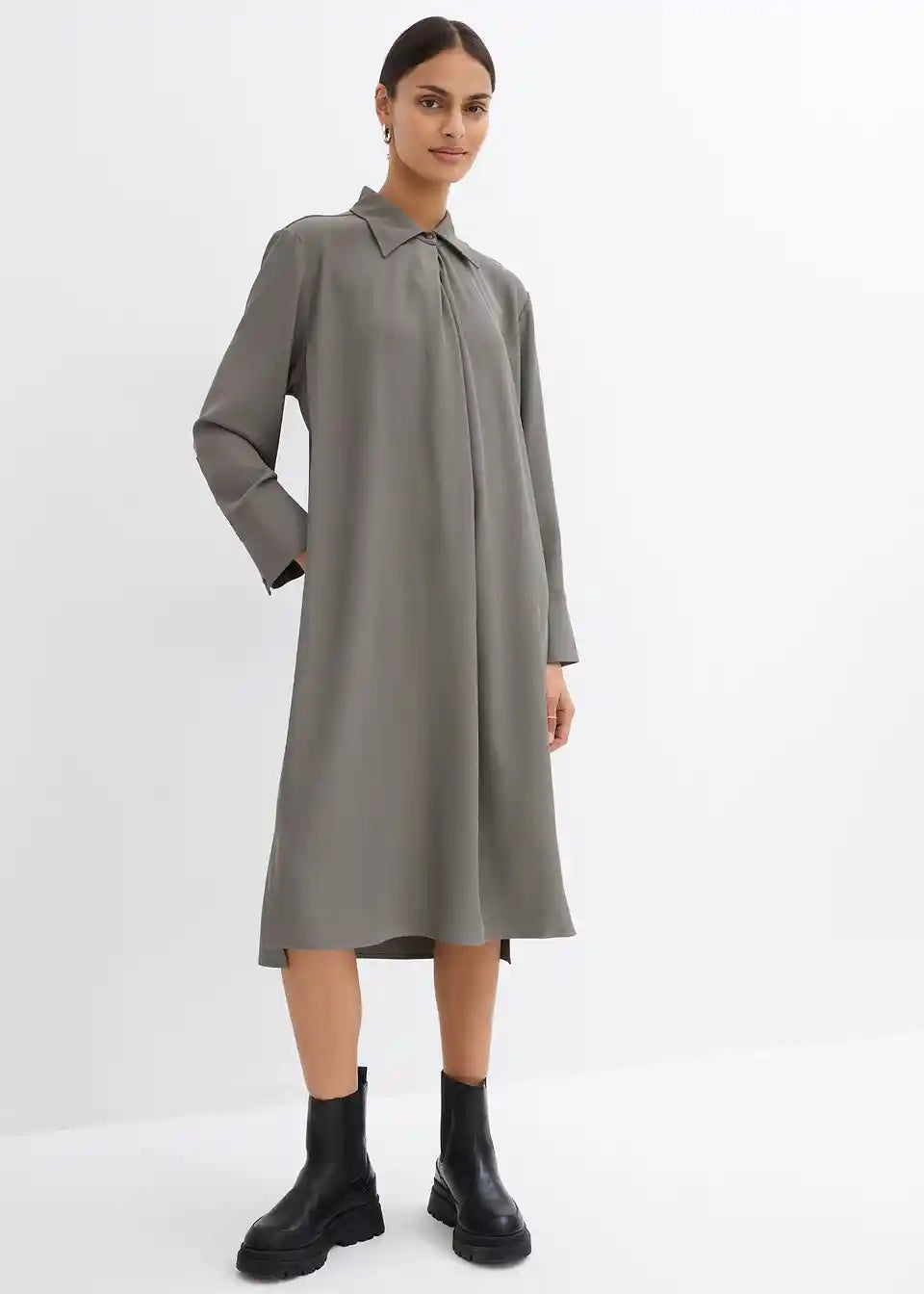 Haljina košuljastog kroja do listova s ​​širokim šiljastim ovratnikom i preklopnim dijelom na izrezu koji se može zatvoriti vidljivim gumbom