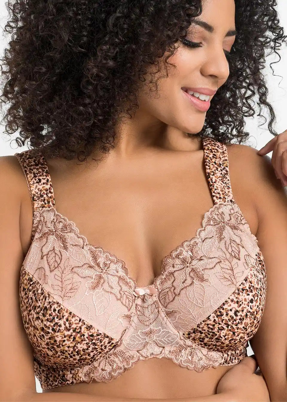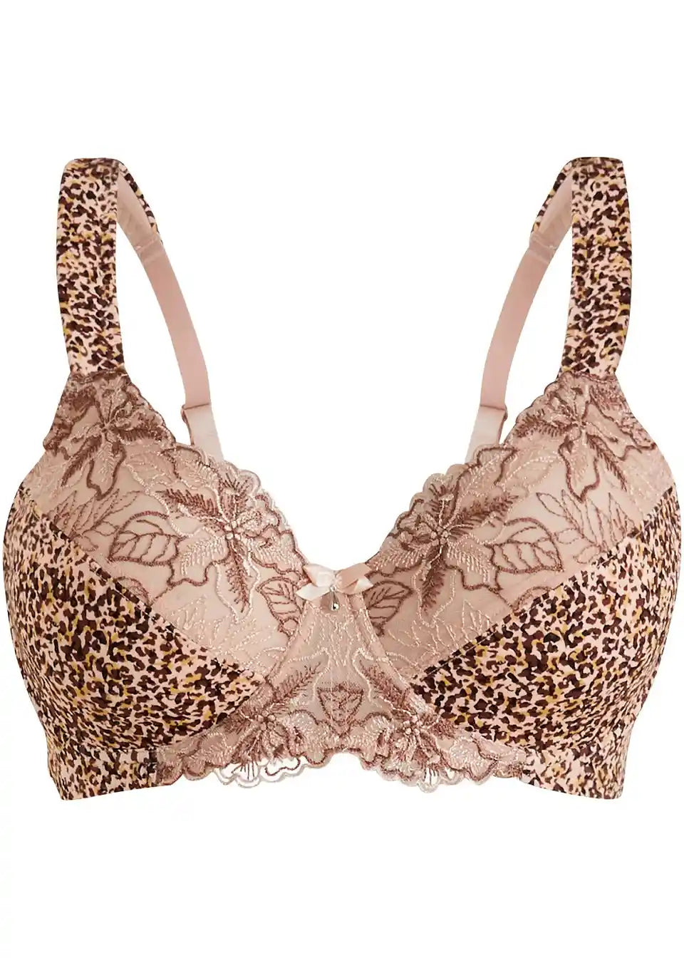 Ovaj Minimizer GRUDNJAK optički smanjuje izgled grudi svojom posebnom konstrukcijom. Uzbudljiv dizajn s leopard uzorkom proširuje se preko cijelog GRUDNJAKA. Prekrasna čipka na košaricama i mostiću upotpunjuje dizajn.