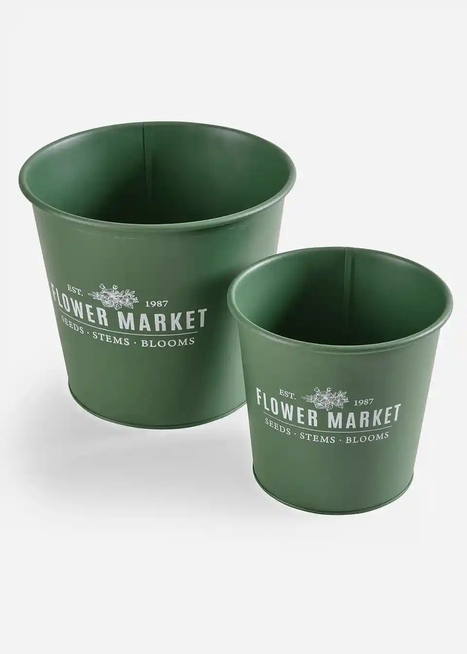 Set okruglih posuda za biljke sastoji se od dvije atraktivne posude u harmonijskim zelenim tonovima, koje se mogu koristiti kako u unutarnjem, tako i u vanjskom prostoru. S jasnim natpisom "FLOWER MARKET" daju svakom prostoru svjež i moderan izgled. Robusna izrada osigurava dugotrajnost i idealna je za sadnju cvijeća, začinskog bilja ili malih biljaka. Različite veličine omogućuju raznolike opcije uređenja i savršeno ističu biljke. Ove posude nisu samo funkcionalne, već i stilski dekorativni elementi koji oplemenjuju svaki prostor.