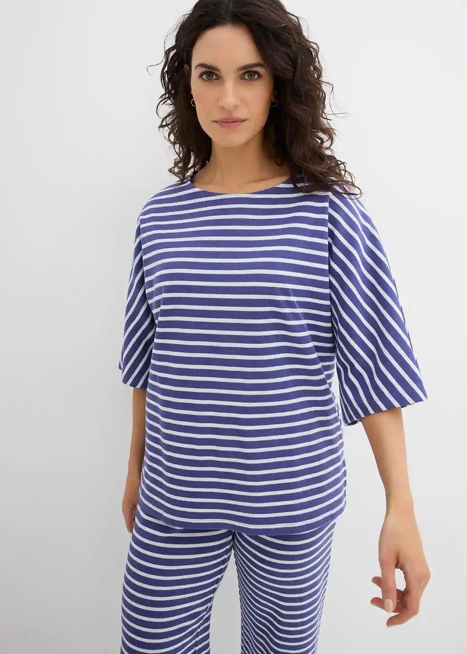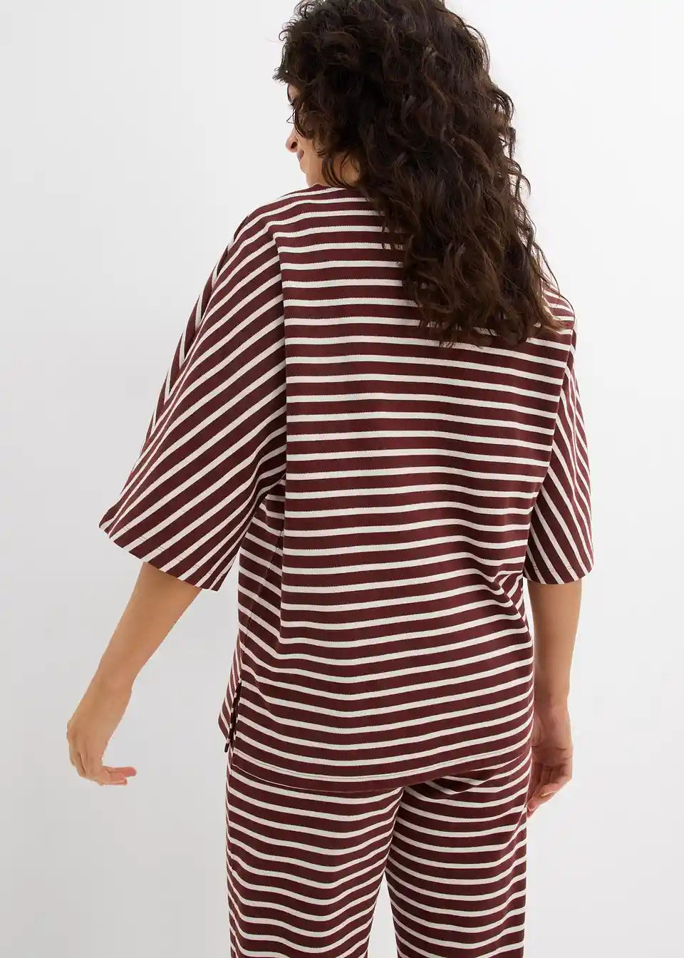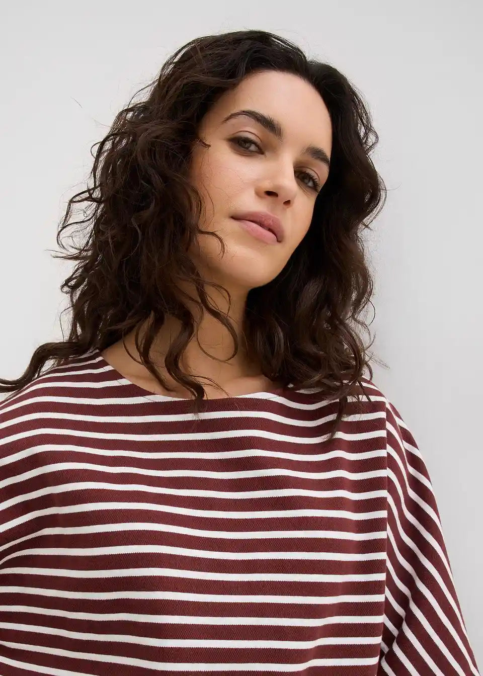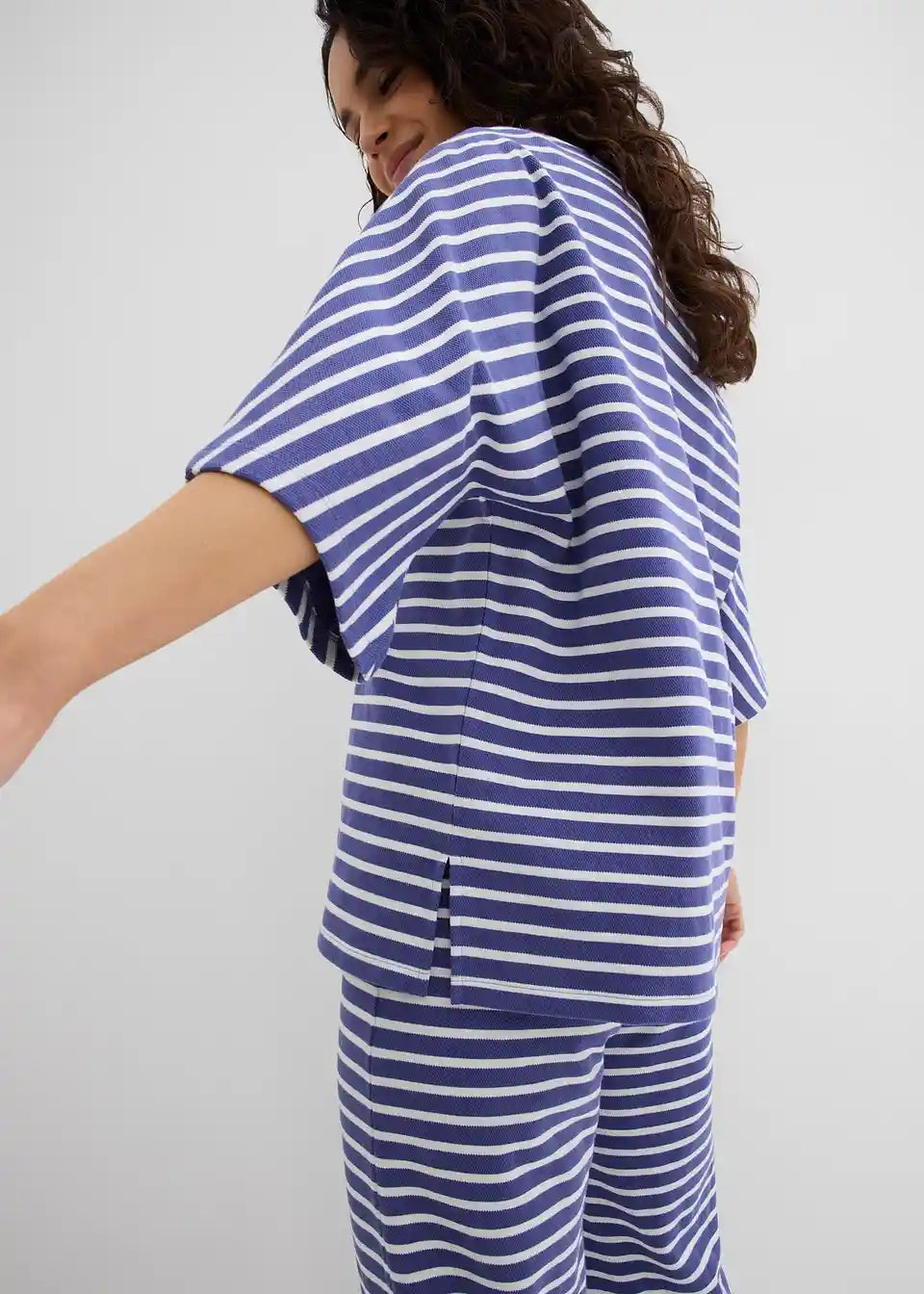 Majica od strukturiranog materijala. Model s okruglim izrezom u oversize kroju s kimono rukavima i bočnim prorezima.