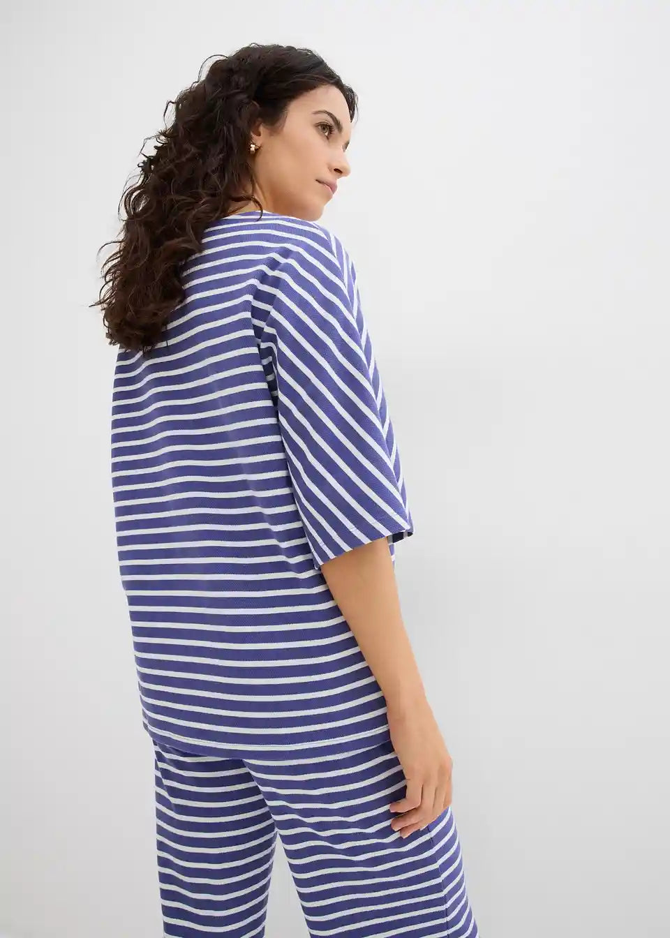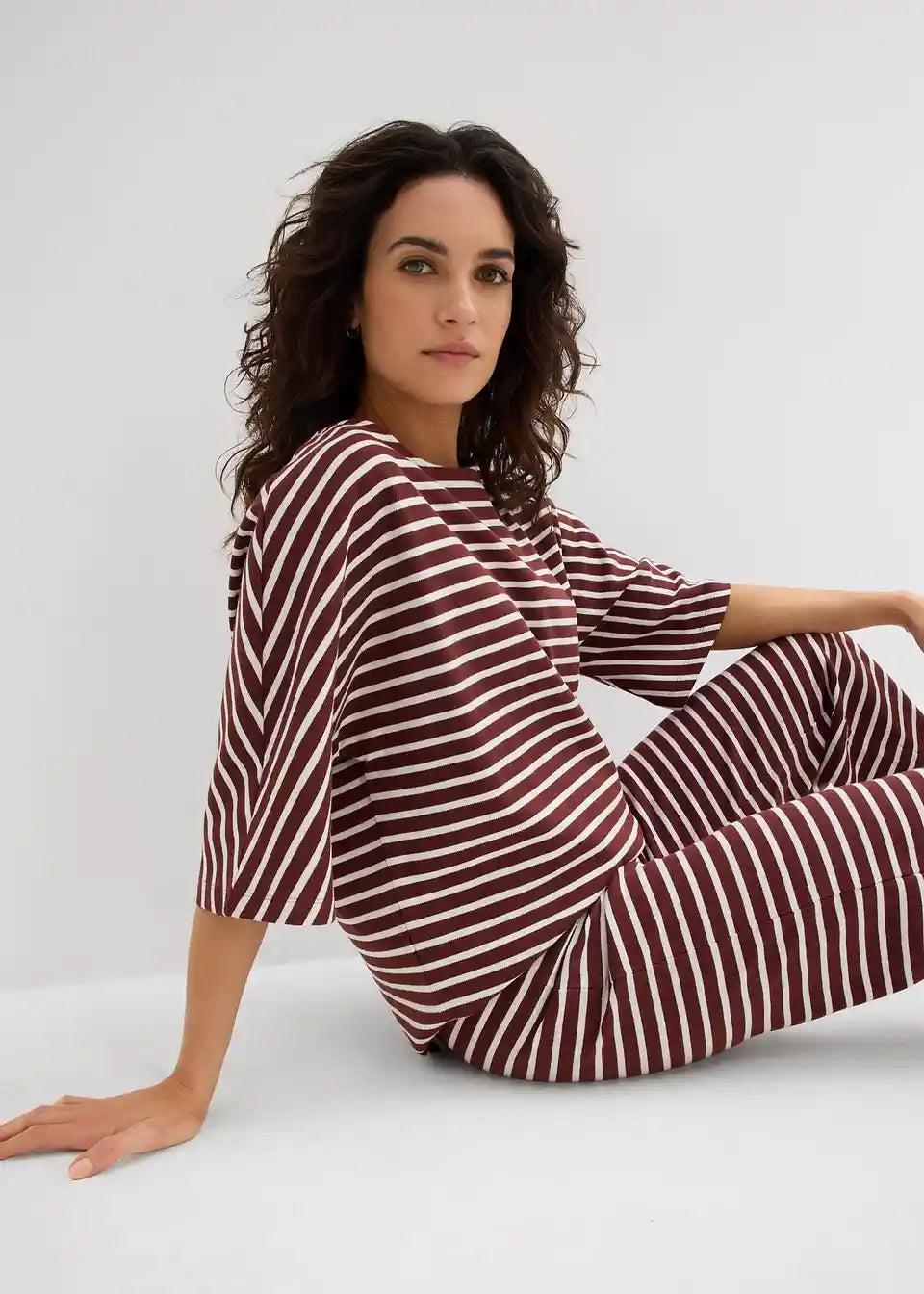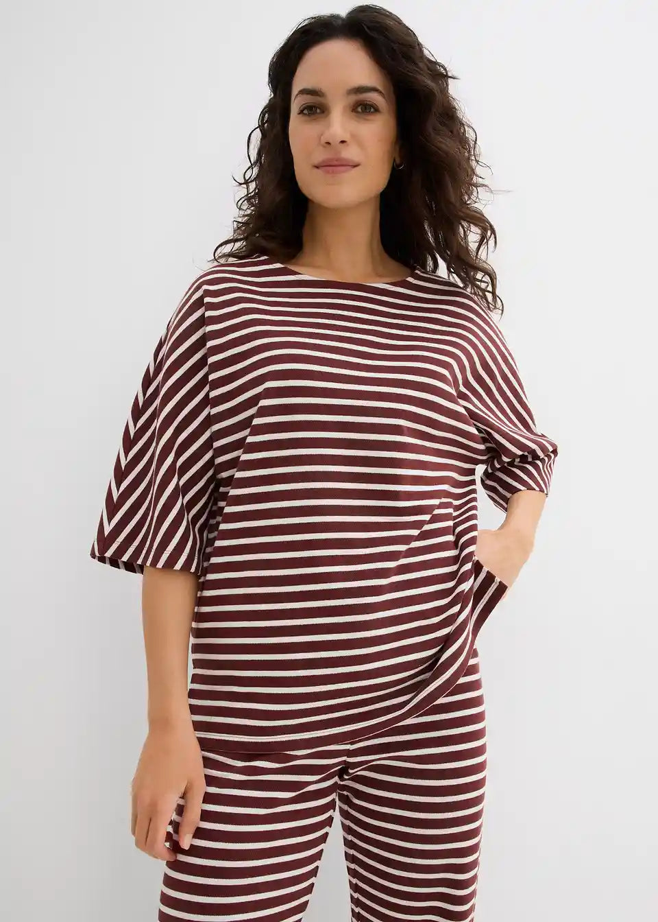 Majica od strukturiranog materijala. Model s okruglim izrezom u oversize kroju s kimono rukavima i bočnim prorezima.