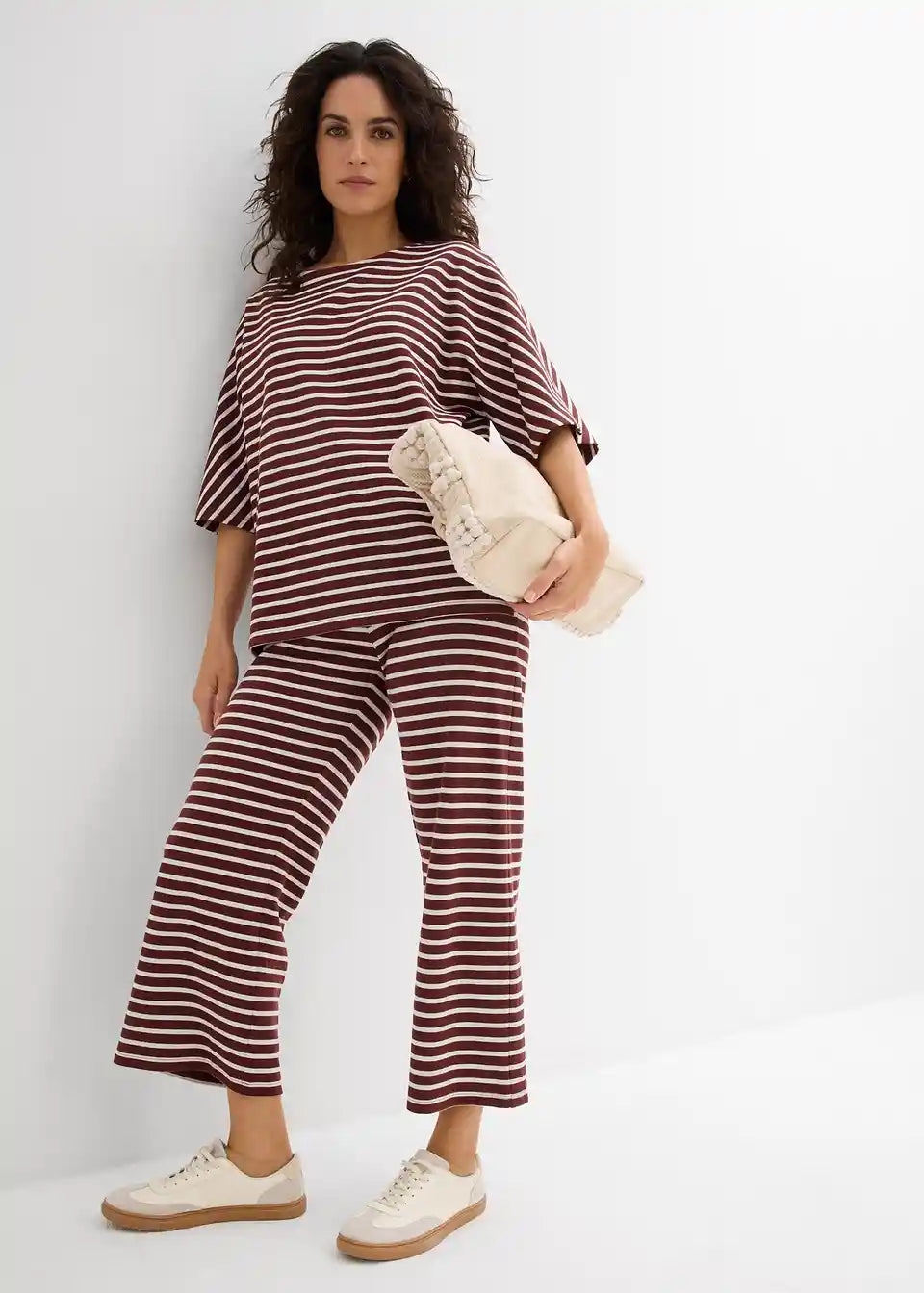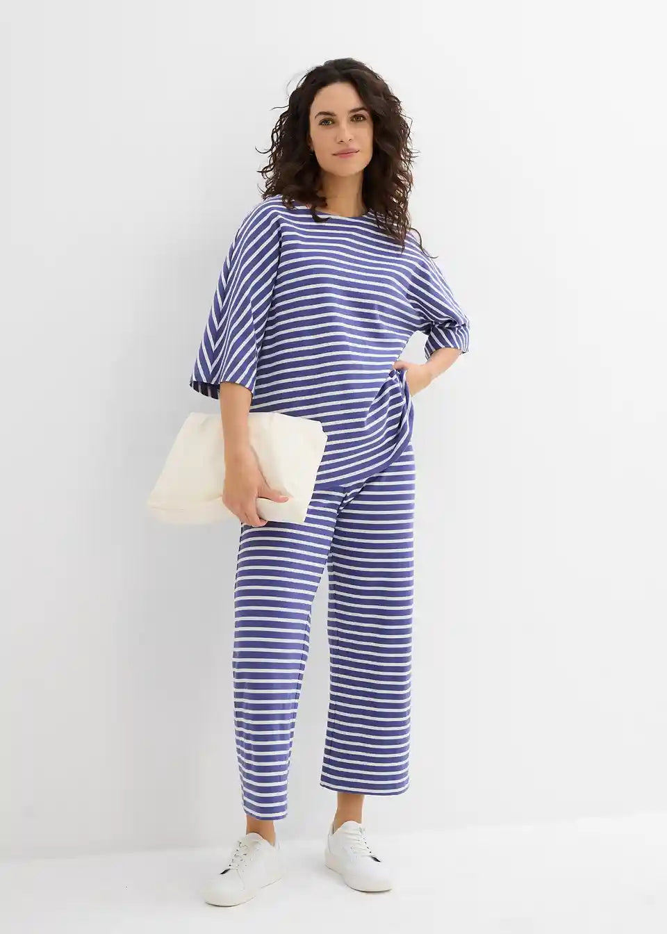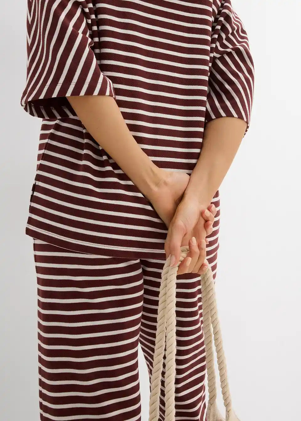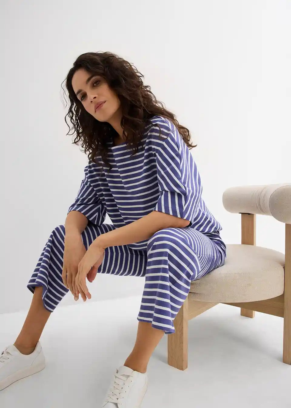 Majica od strukturiranog materijala. Model s okruglim izrezom u oversize kroju s kimono rukavima i bočnim prorezima.