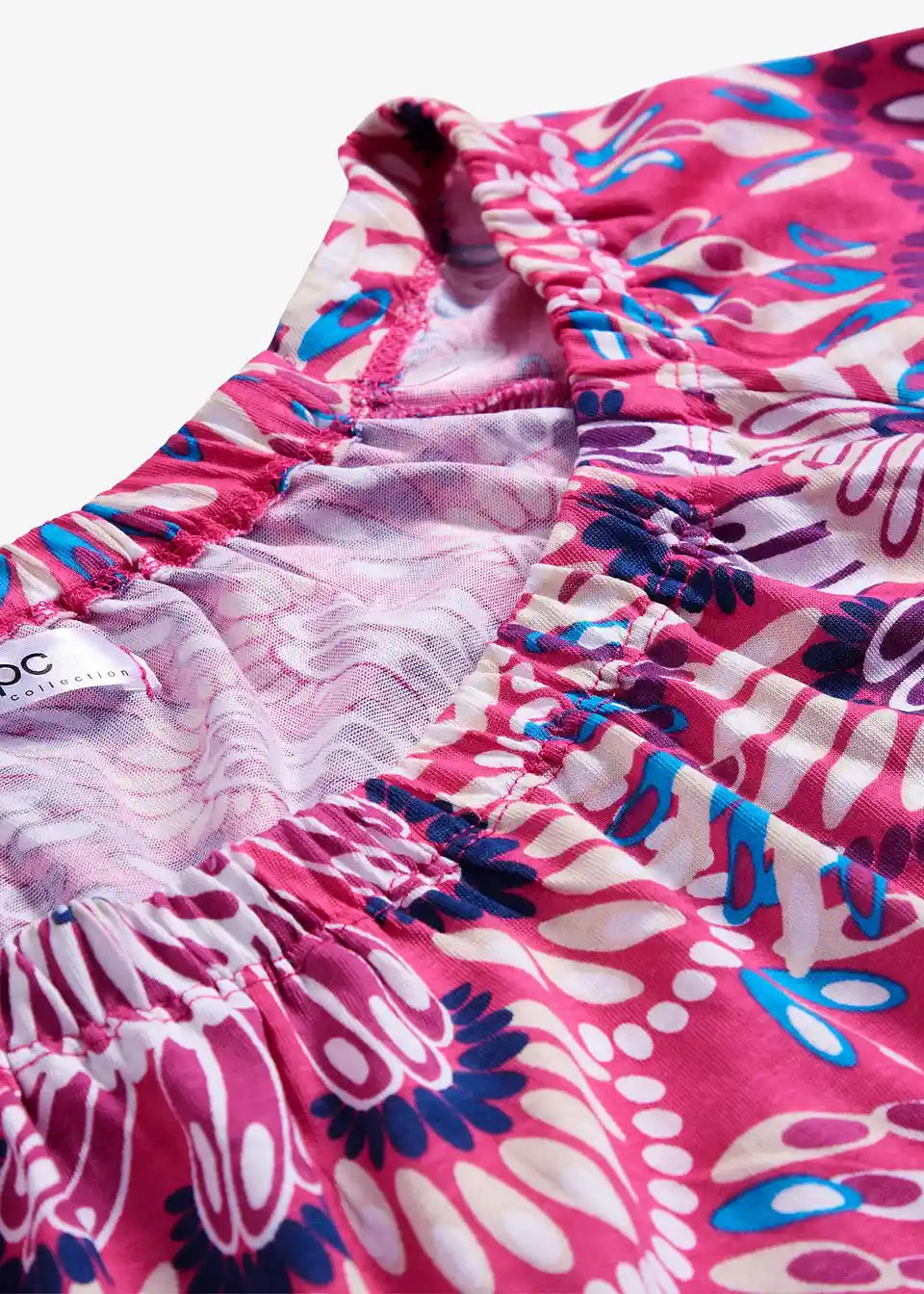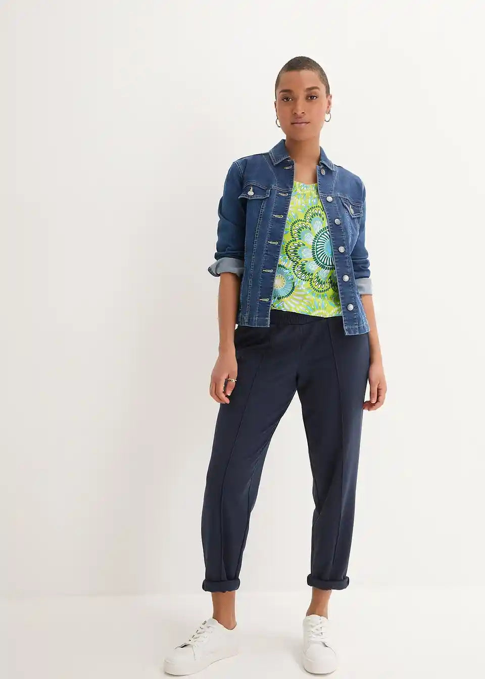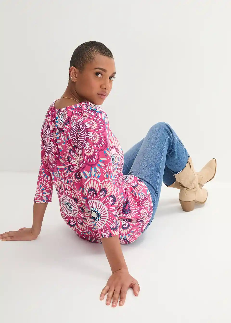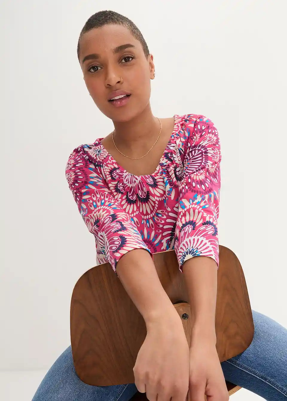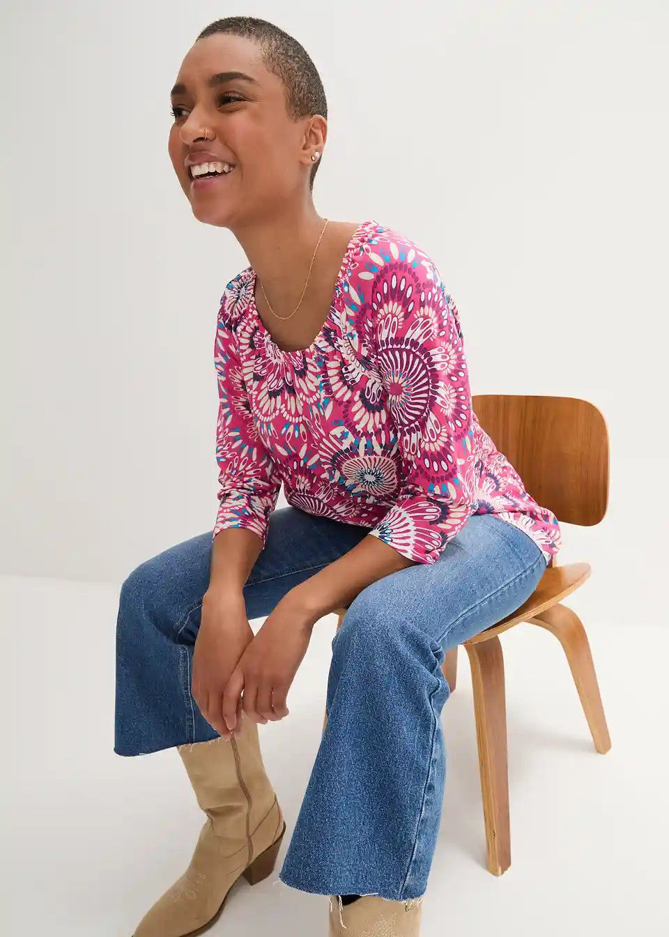 Sa svojom lijepom siluetom, majica s 3/4 rukavima nježno obavija figuru i oduševljava zahvaljujući fantastičnom osjećaju nošenja. Gornji dio marke bpc krojen je u prikrivajućem A-kroju i daje outfitu prozračan i lagan dojam. Udoban kroj čini ovaj model svestranim omiljenim komadom za svaki dan. Okrugli izrez na ovom gornjem dijelu lagano je nabrana s elastičnom trakom. U kombinaciji s udobnim trapericama, žena je izvrsno odjevena.