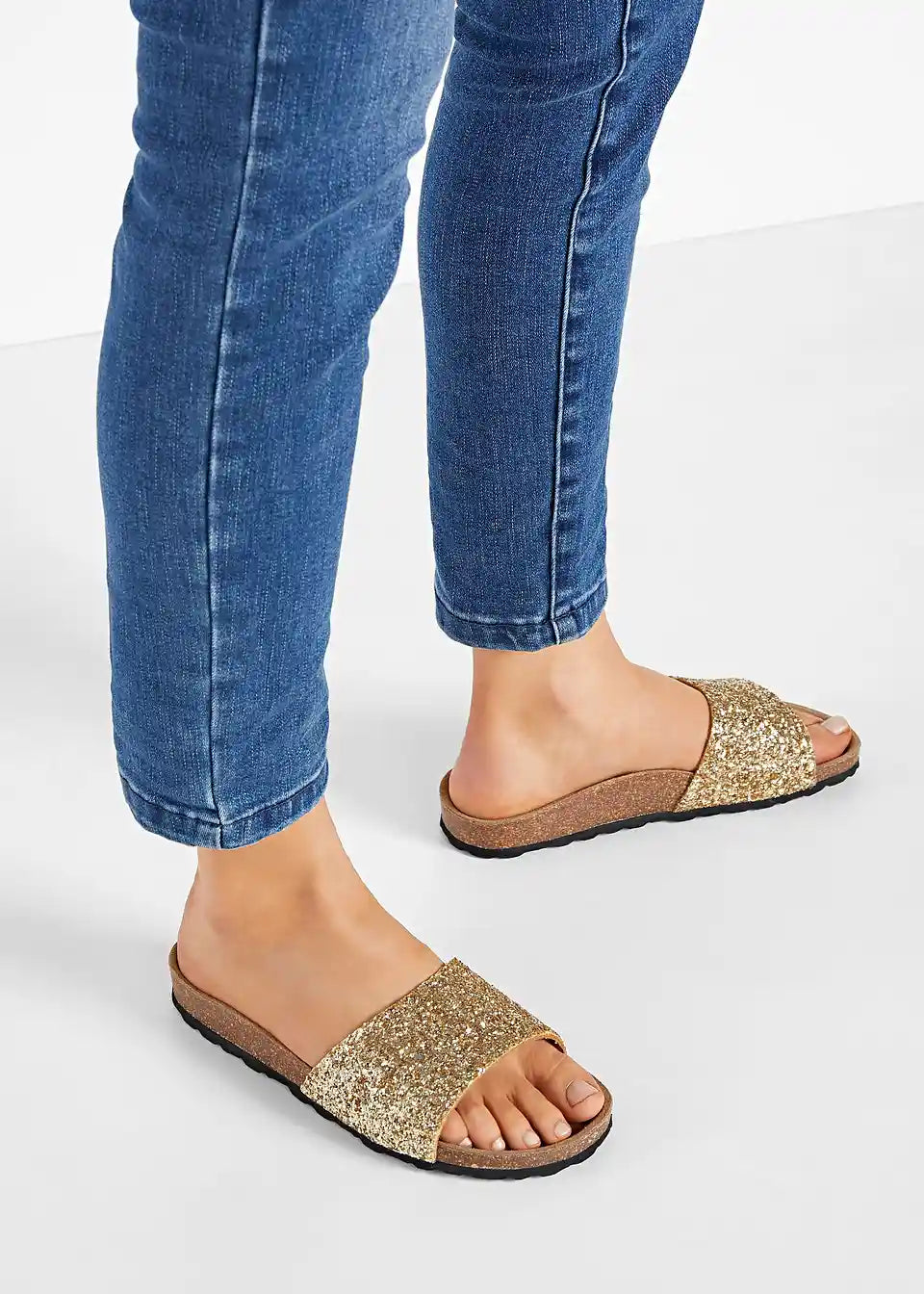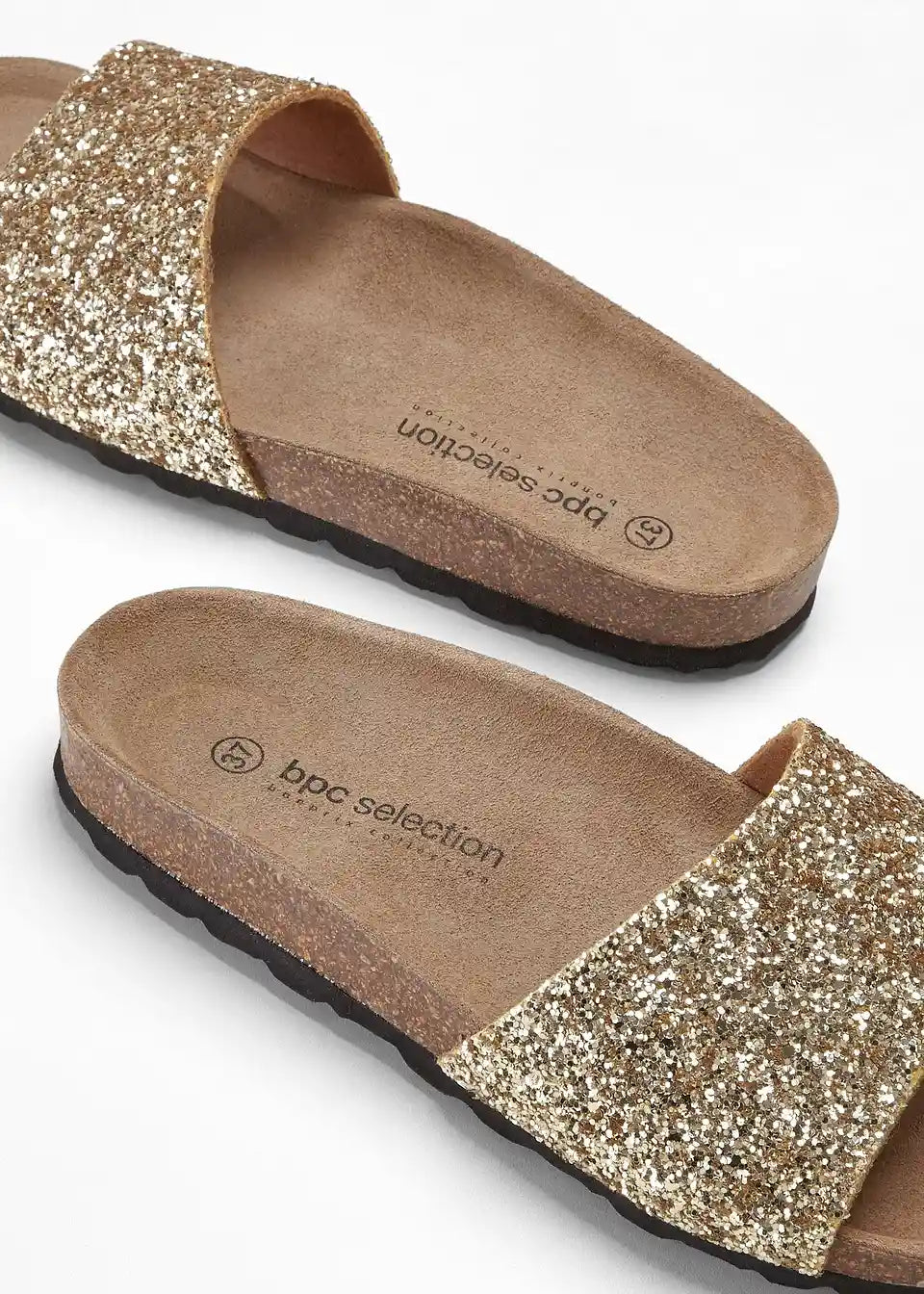 Pantolette marke bpc oduševljava udobnošću i vizualnim prednostima. Posebno lijep detalj je široki remen u privlačnom dizajnu s glitterom. Cjelokupan izgled upotpunjen je potplatom u izgledu brušene kože. Također, ove ženske cipele vrlo su jednostavne za navući. Na taj način, Pantolette marke bpc idealne su za zabave na plaži ili u vrtu tijekom toplih dana.