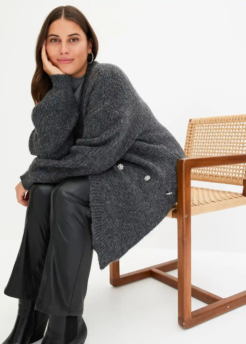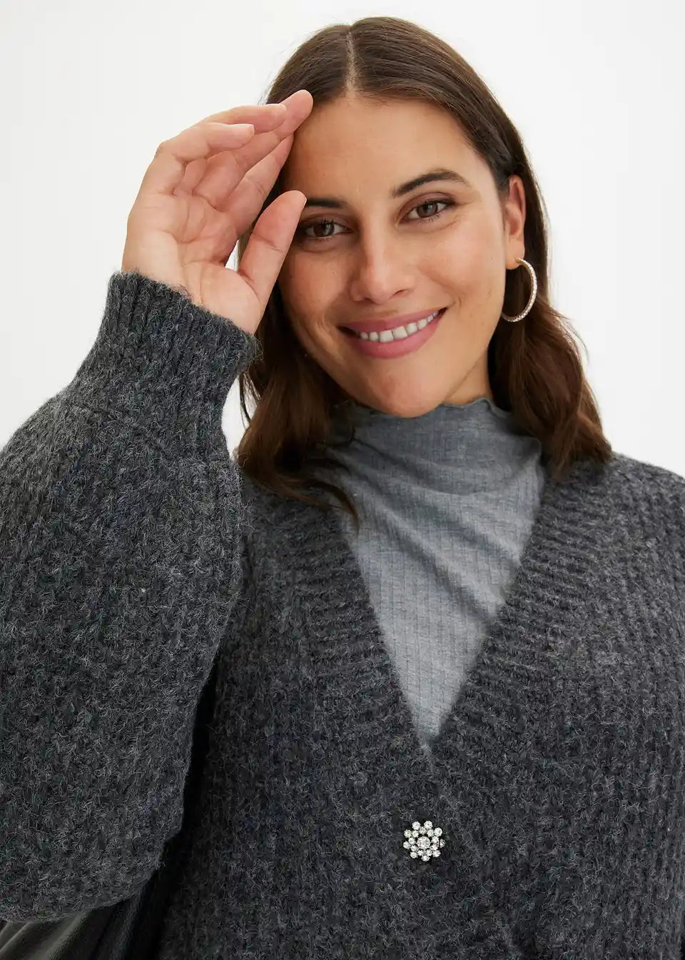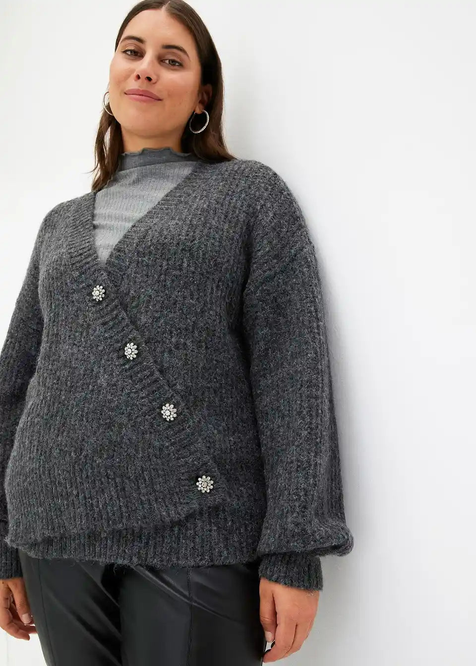 Ženska pletena jakna s asimetričnim kopčanjem sprijeda i dekorativnim gumbima sa strasom