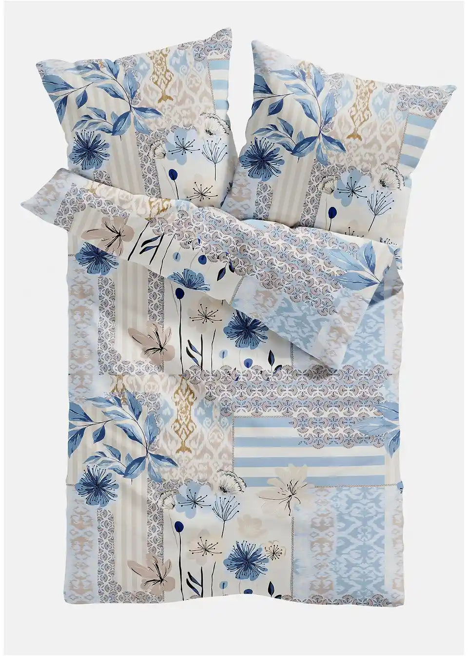 Živopisan patchwork dizajn u plavim i krem tonovima koji spaja cvjetne motive s geometrijskim uzorcima.