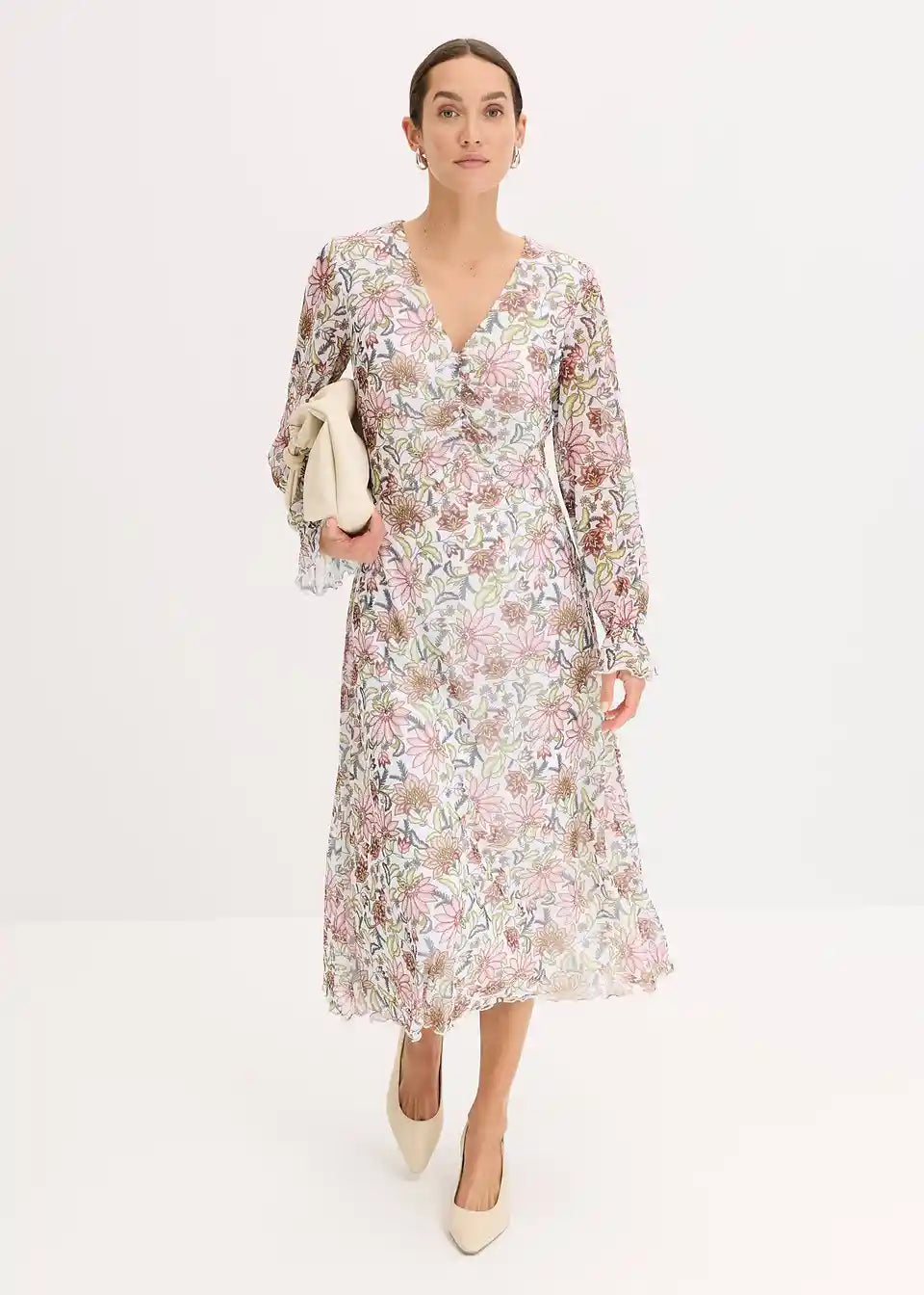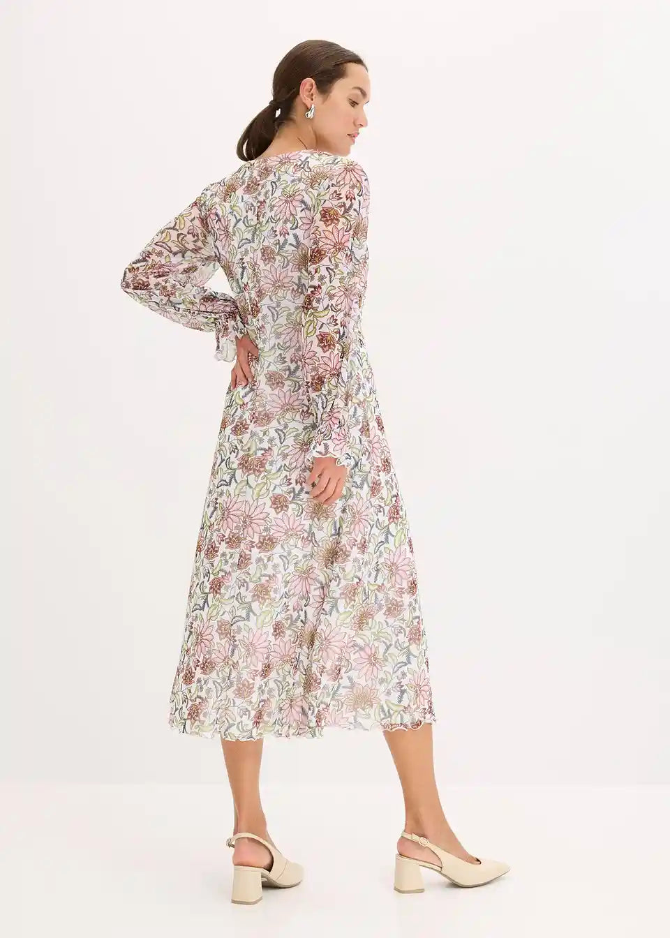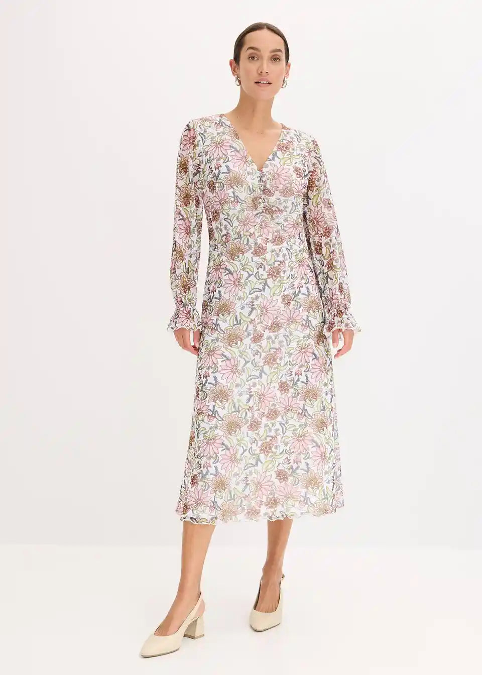 ženska Mesh-midihaljina s dubokim V-izrezom sprijeda.