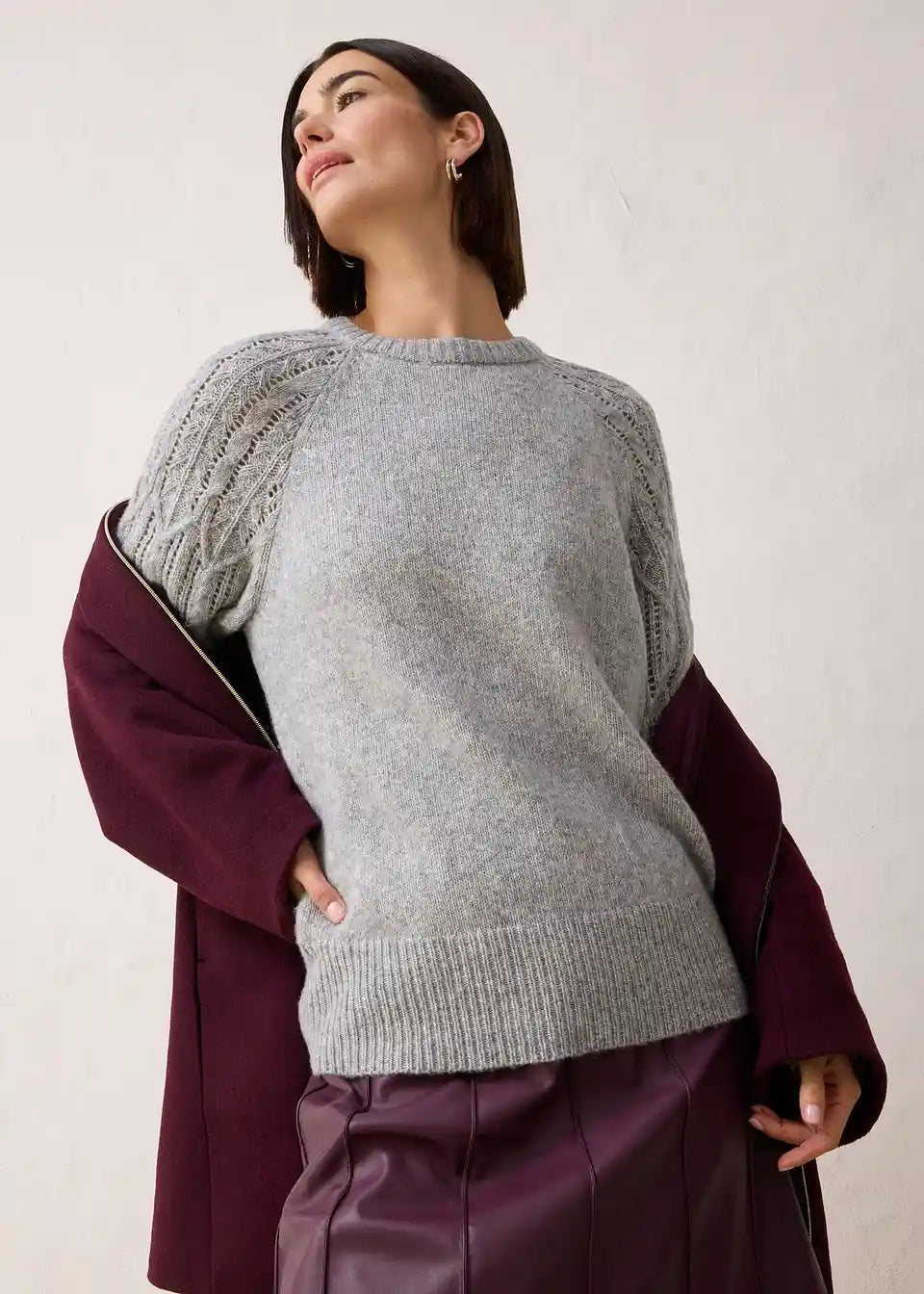 Pulover s grijućim udjelom vune, ukrasni pleteni uzorci na rukavima