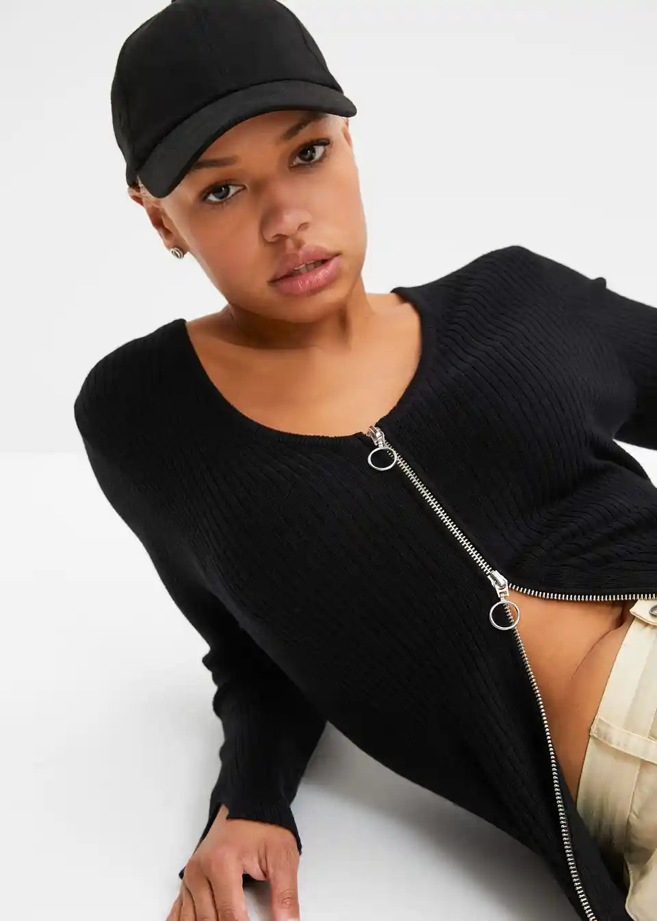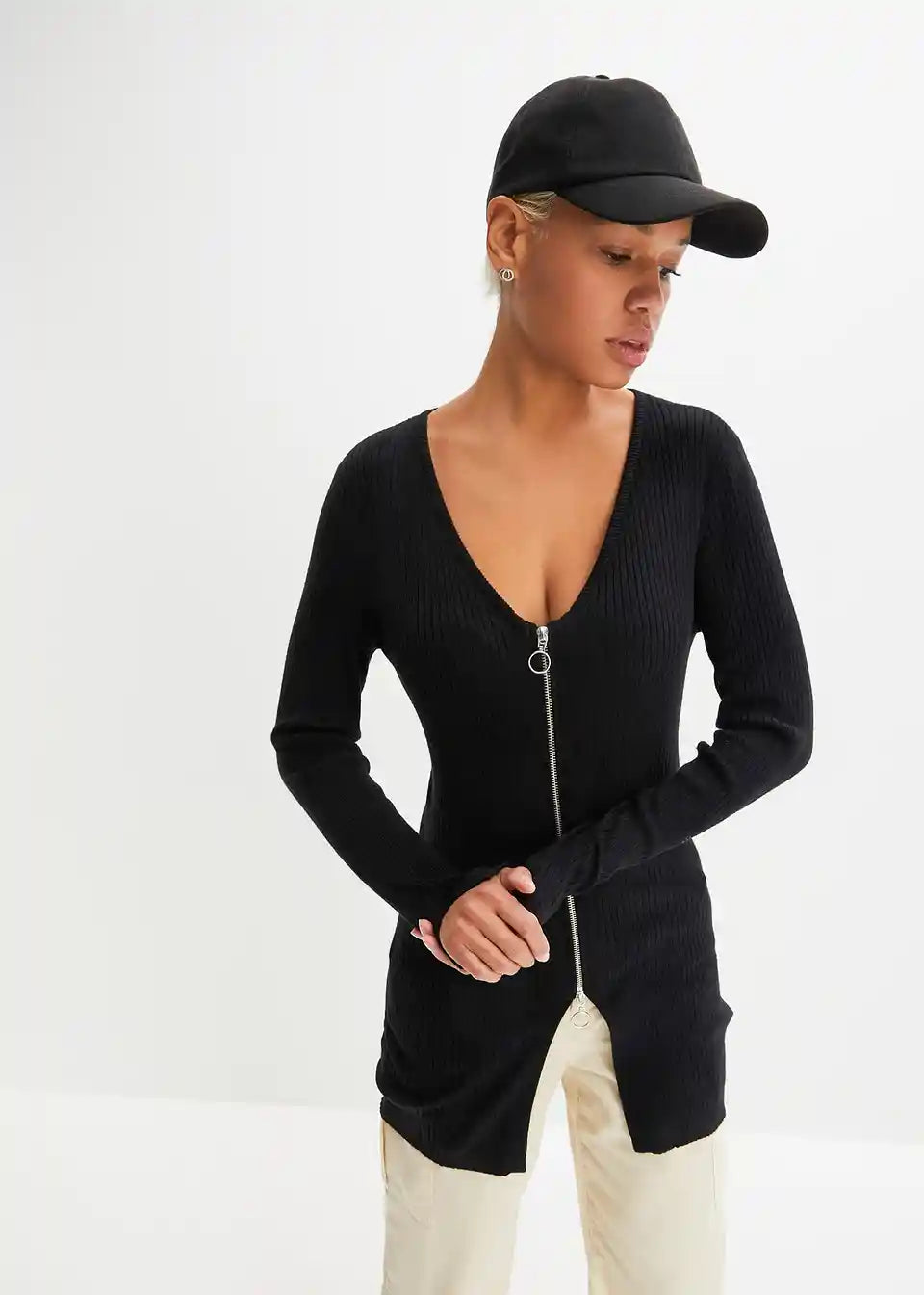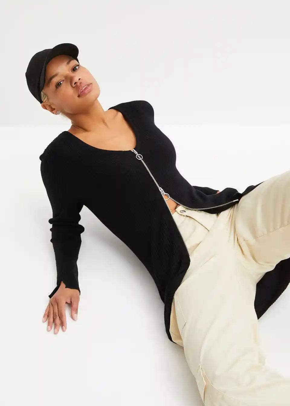 Moderna pletena jakna s dvosmjernim patentnim zatvaračem i detaljem proreza