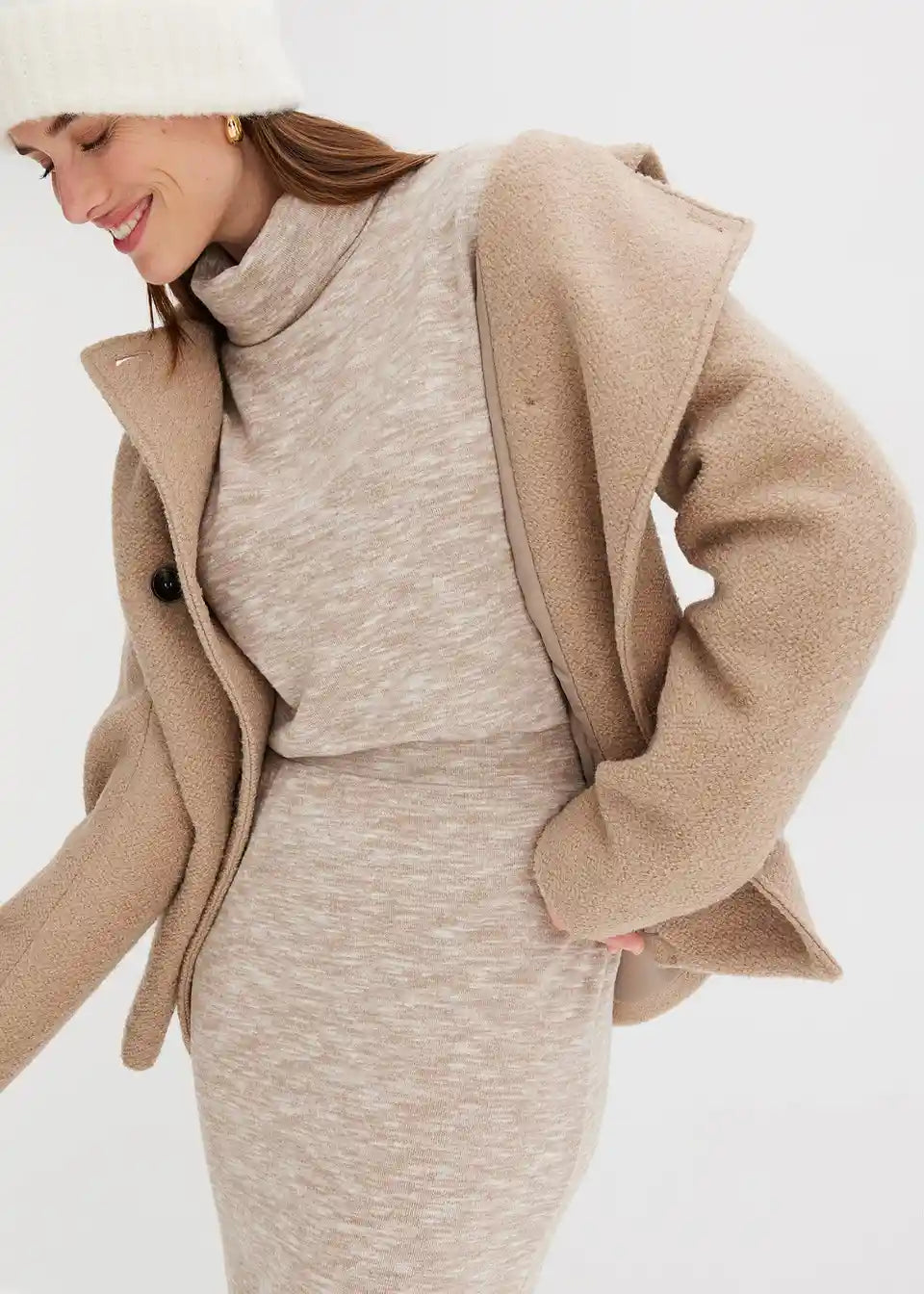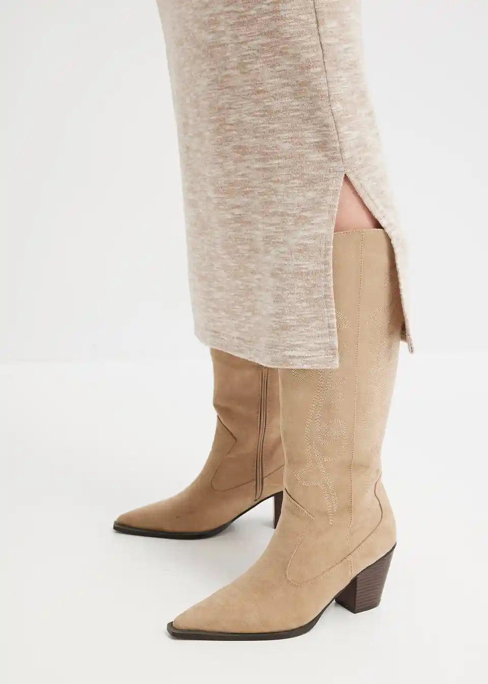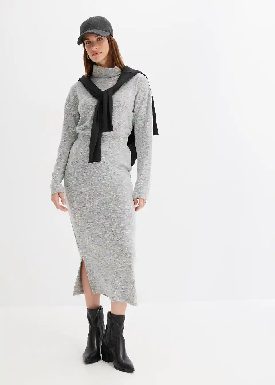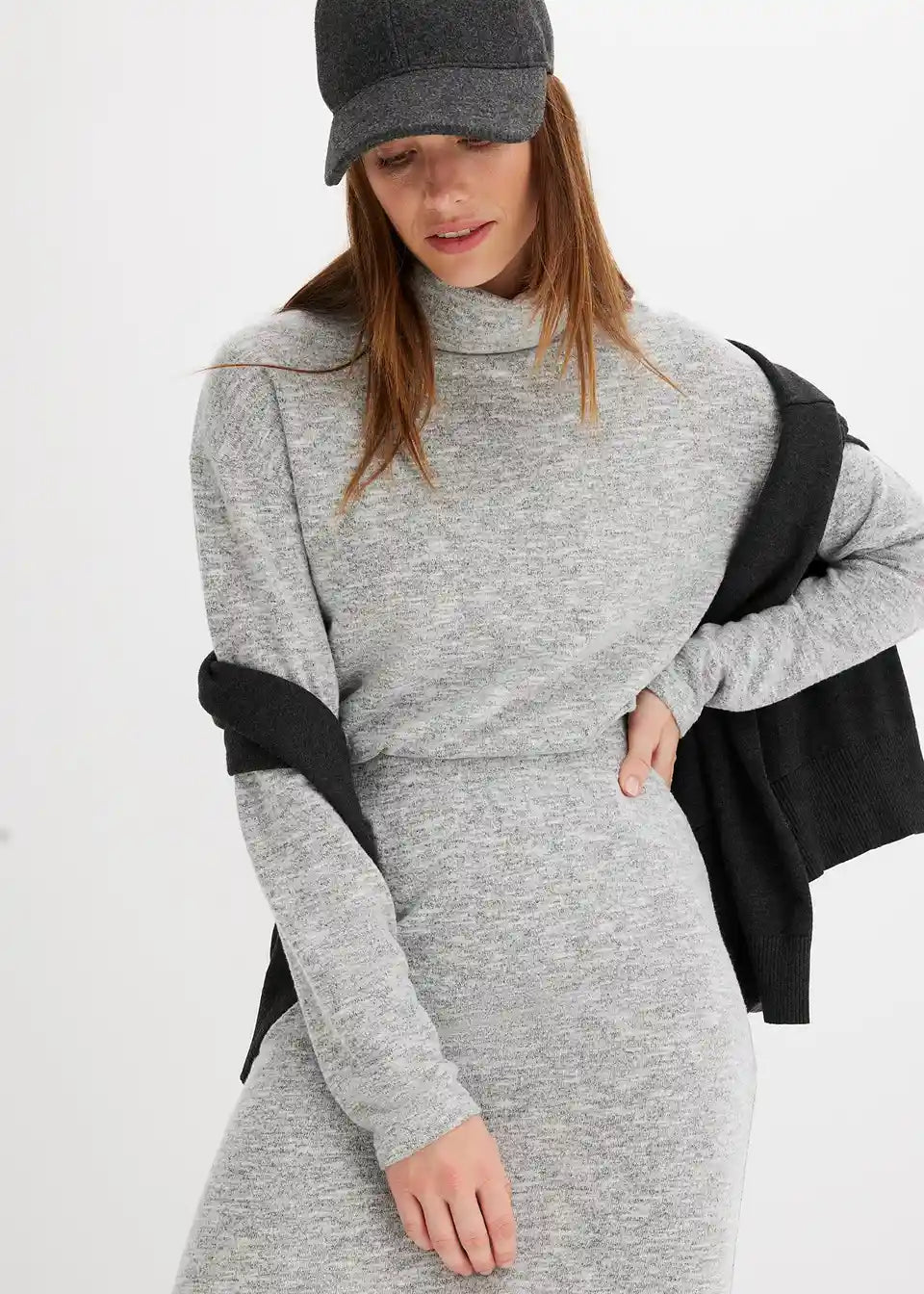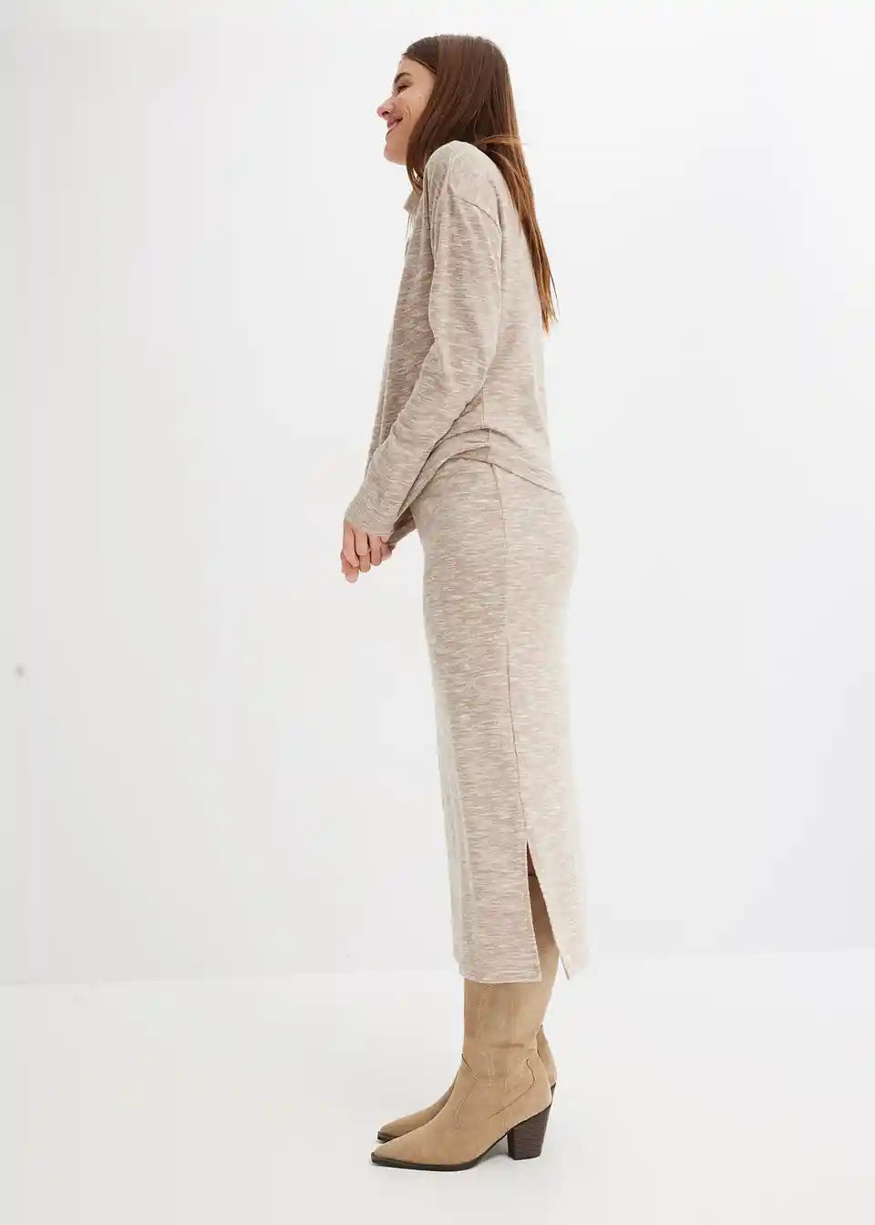 Moderna midi suknja u pletivo izgledu s prorezom