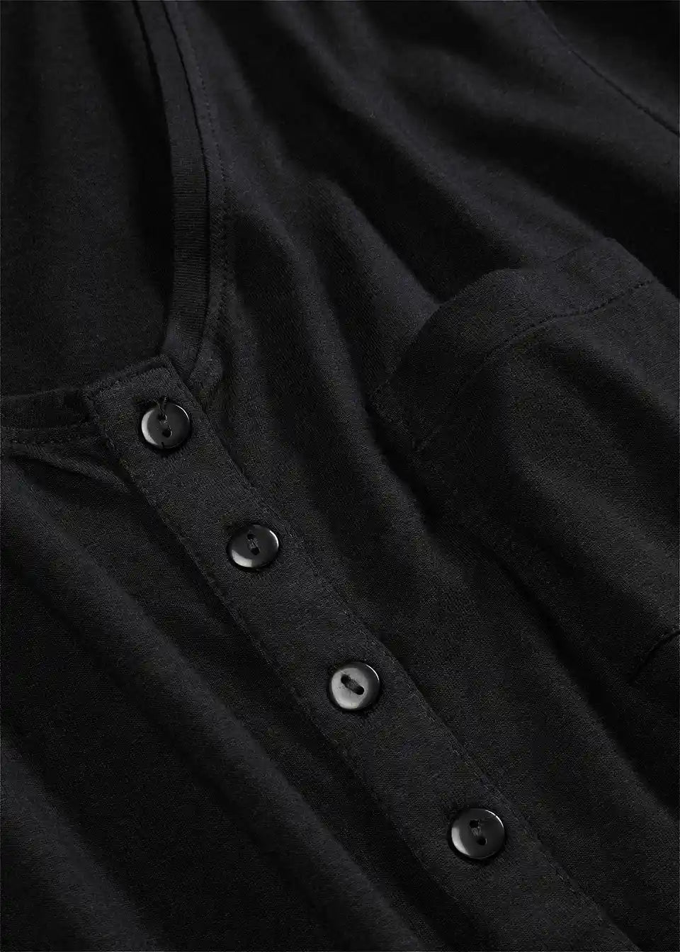 S velikim V-izrezom, kopčanjem na gumbe i malim džepom na prsima. Duljina u vel. 36/38 cca 64 cm.