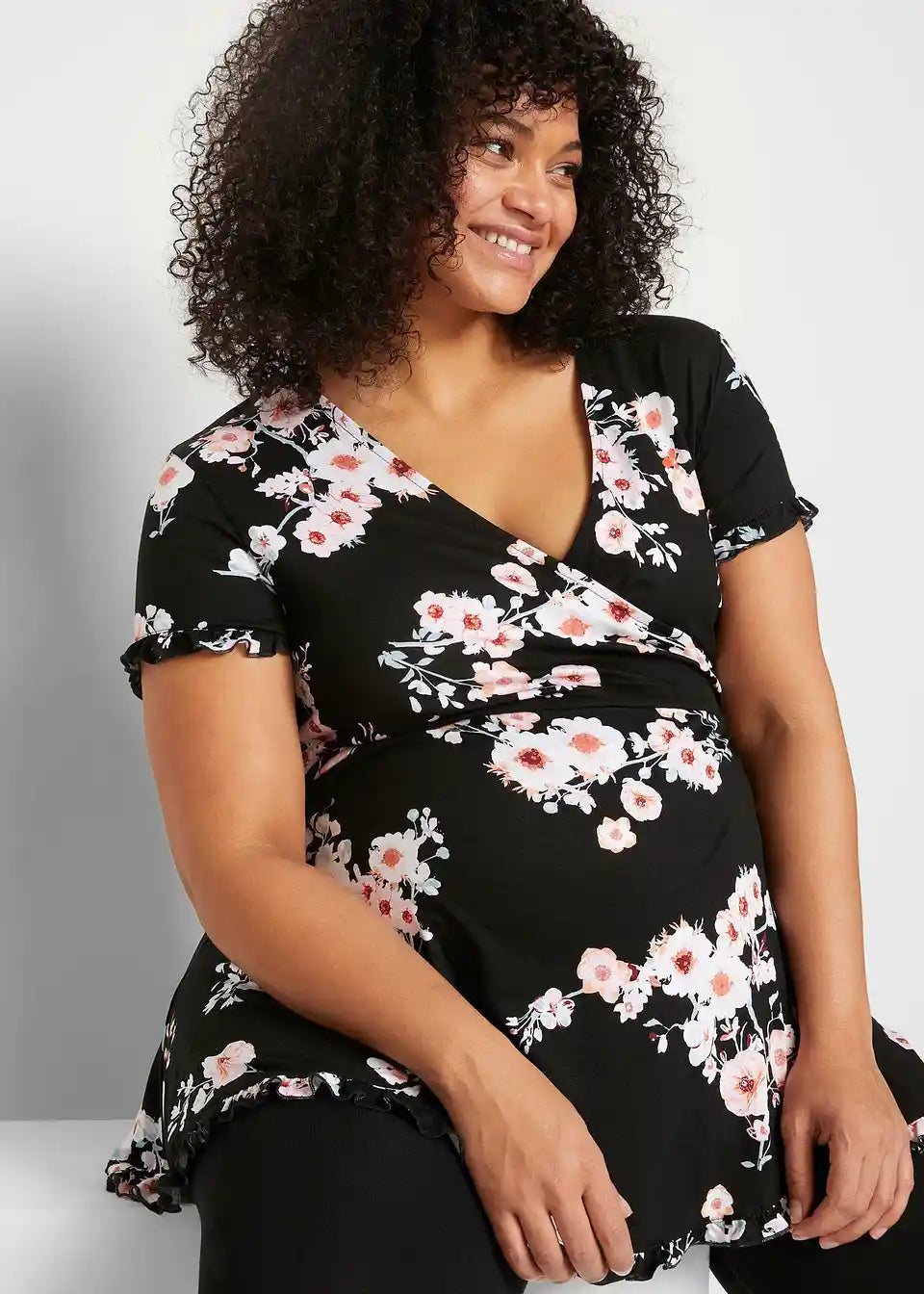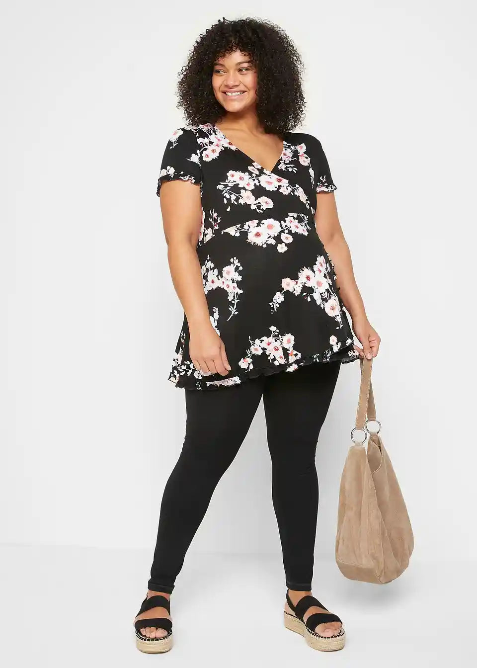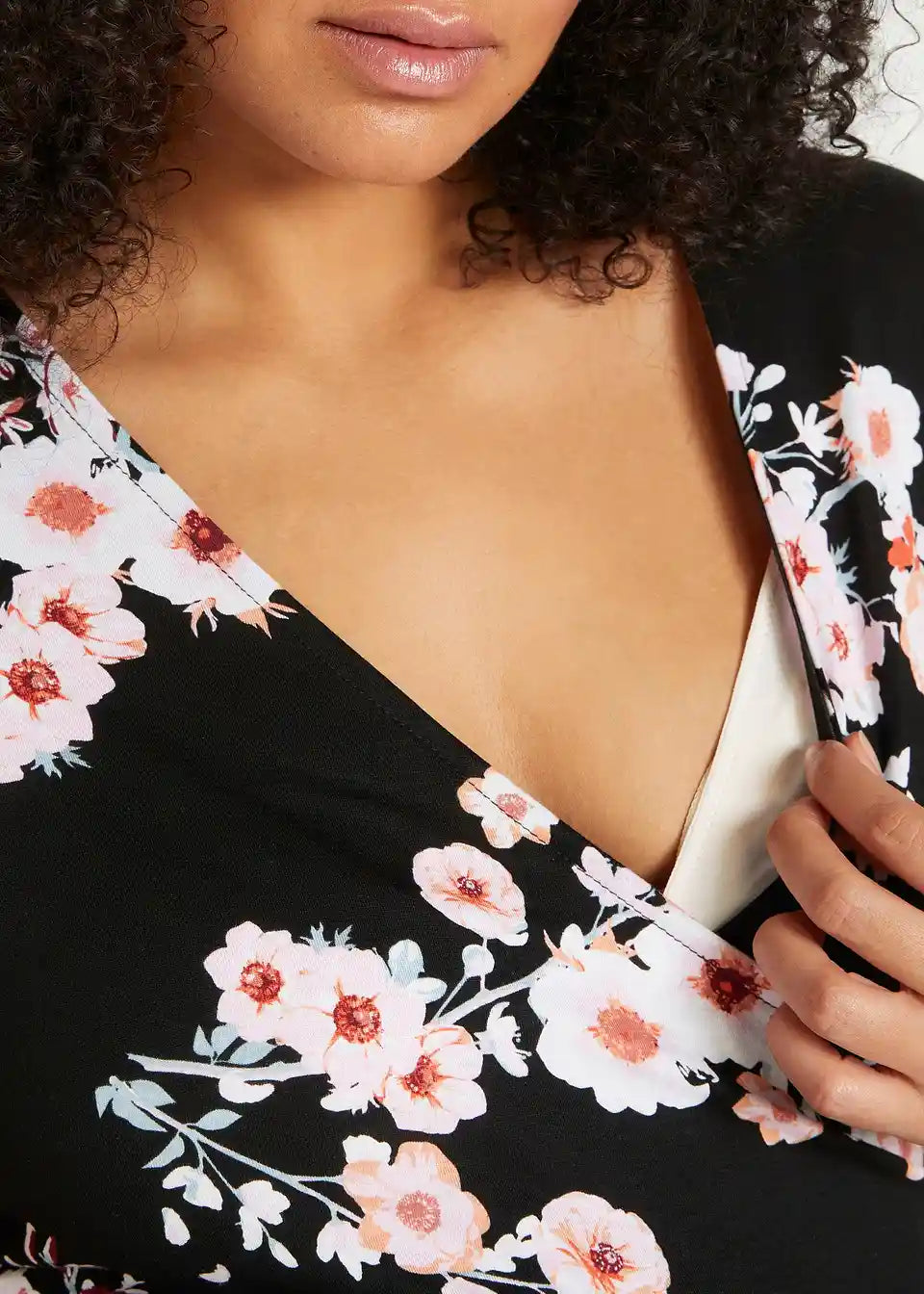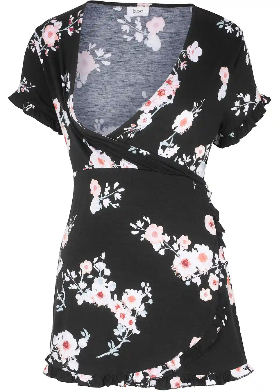 Ova tunika za dojenje s omotanim izgledom praktičan je pratitelj svake majke. Zahvaljujući jednostavnom, ali funkcionalnom kroju i cvjetnom dizajnu, ova majica je apsolutni must-have. Prije poroda kroj se prilagođava rastućem trudničkom trbuhu.