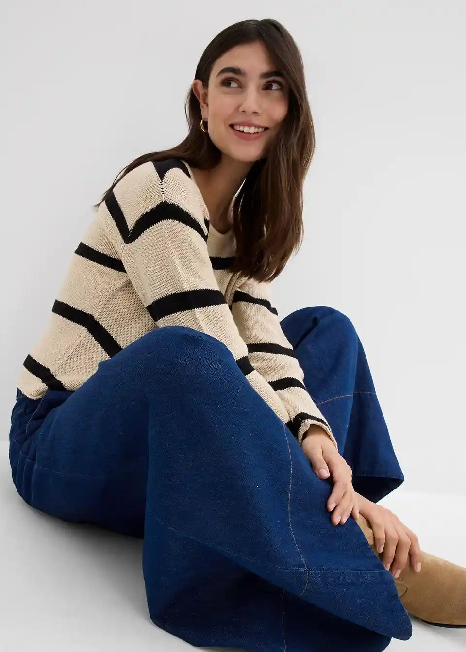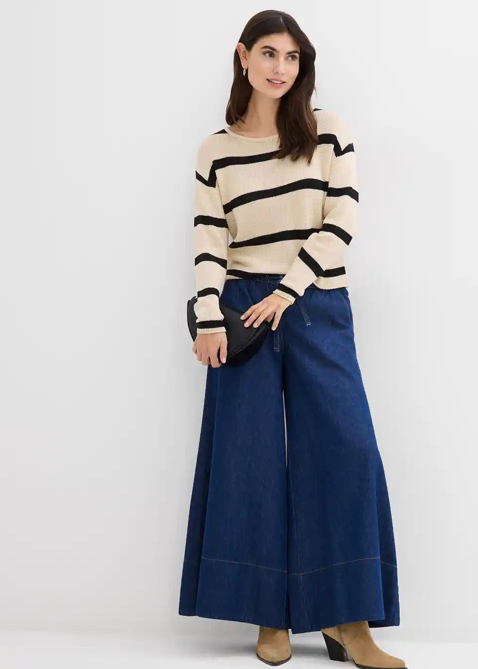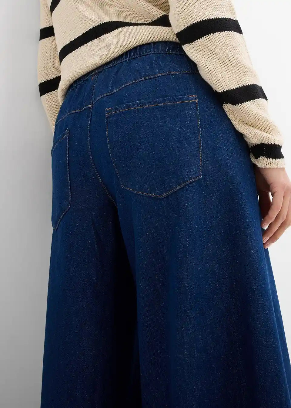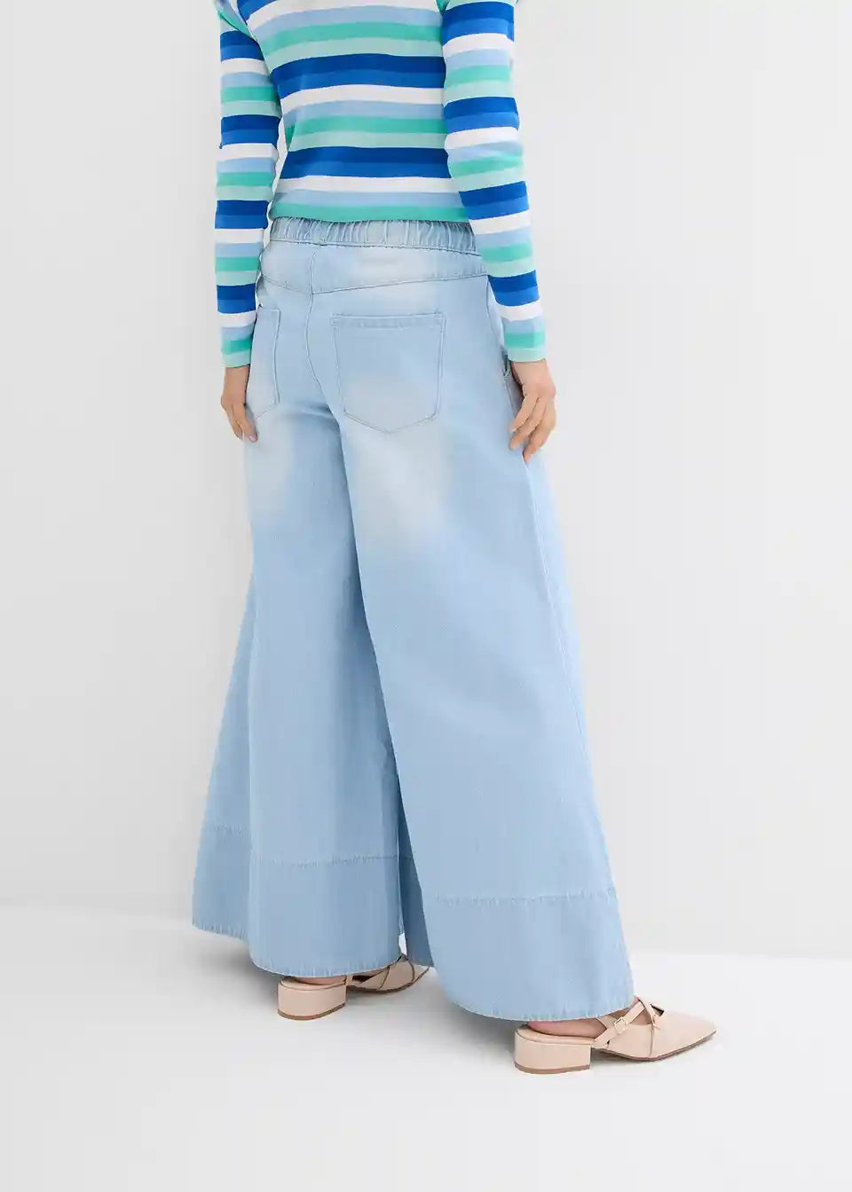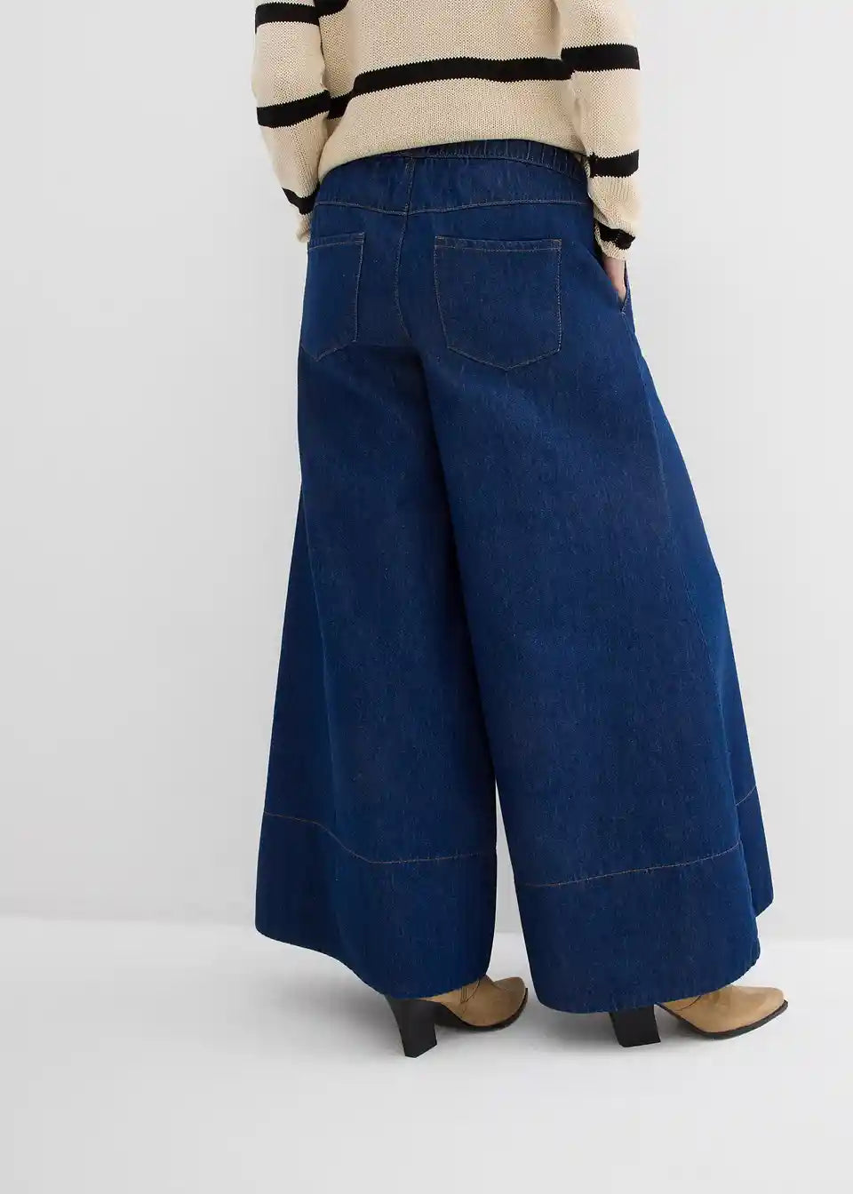 Široke 5-džepne traperice s elastičnim udobnim pojasom izrađene od čvrstog pamučnog trapera, koji je u početku pomalo krut, ali čestim nošenjem postaje mekši i opušteniji. Srednje visok struk i skraćena dužina. Unutarnja dužina nogavice u veličini 42 cca 67,5 cm, perivo u perilici rublja.