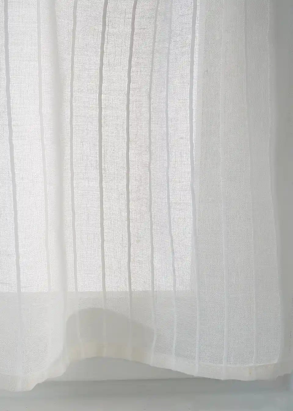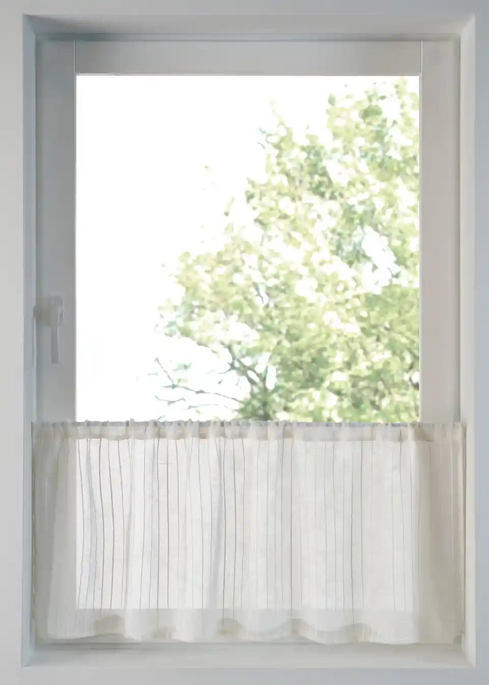 Kuhinjska zavjesa s diskretnim prugama u bijeloj boji nenametljivo krasi tvoj prozor.