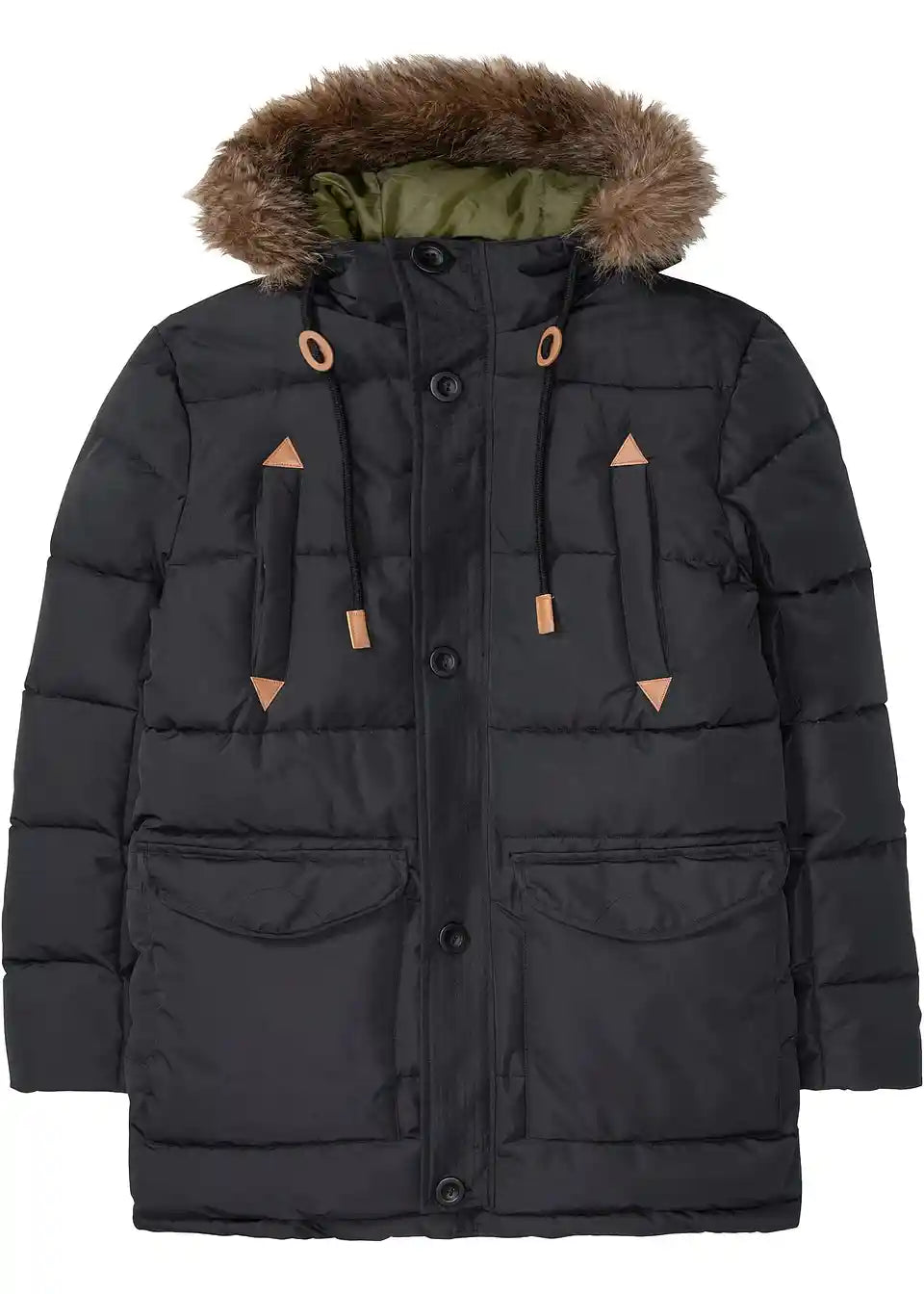 Ova muška zimska parka Regular Fit savršena je za hladnu sezonu. Dugi kaput ima kapuljaču, obrubljenu mekanim umjetnim krznom. Dva velika našivena džepa, dva bočna džepa i unutarnji džep nude prostor za razne predmete. Zimska parka Regular Fit zatvara se skrivenim patentnim zatvaračem.
