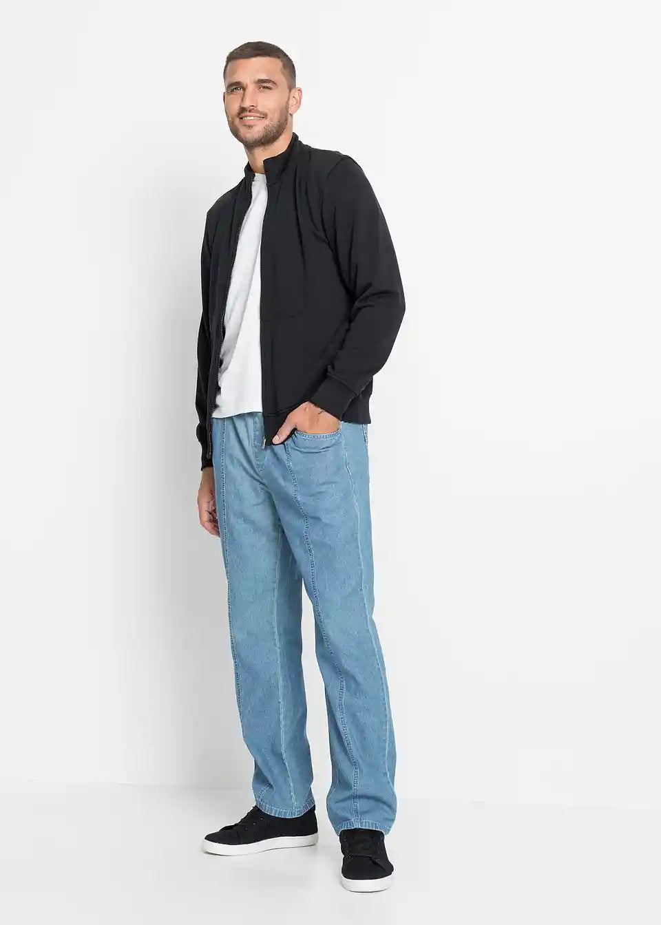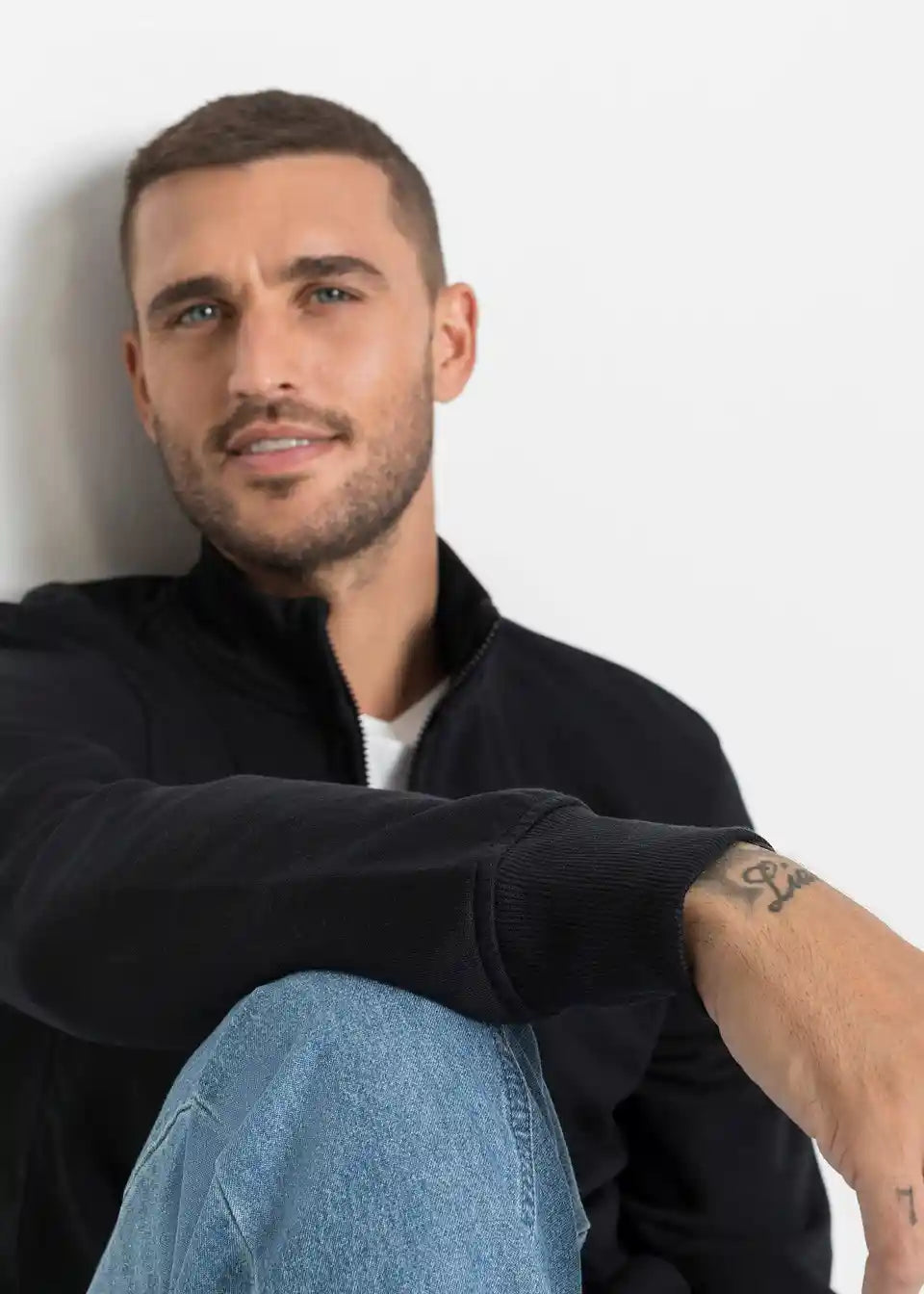 Sportska muška sweat jakna s uspravnim ovratnikom i kengur džepovima, s unutarnje strane meko brušena.