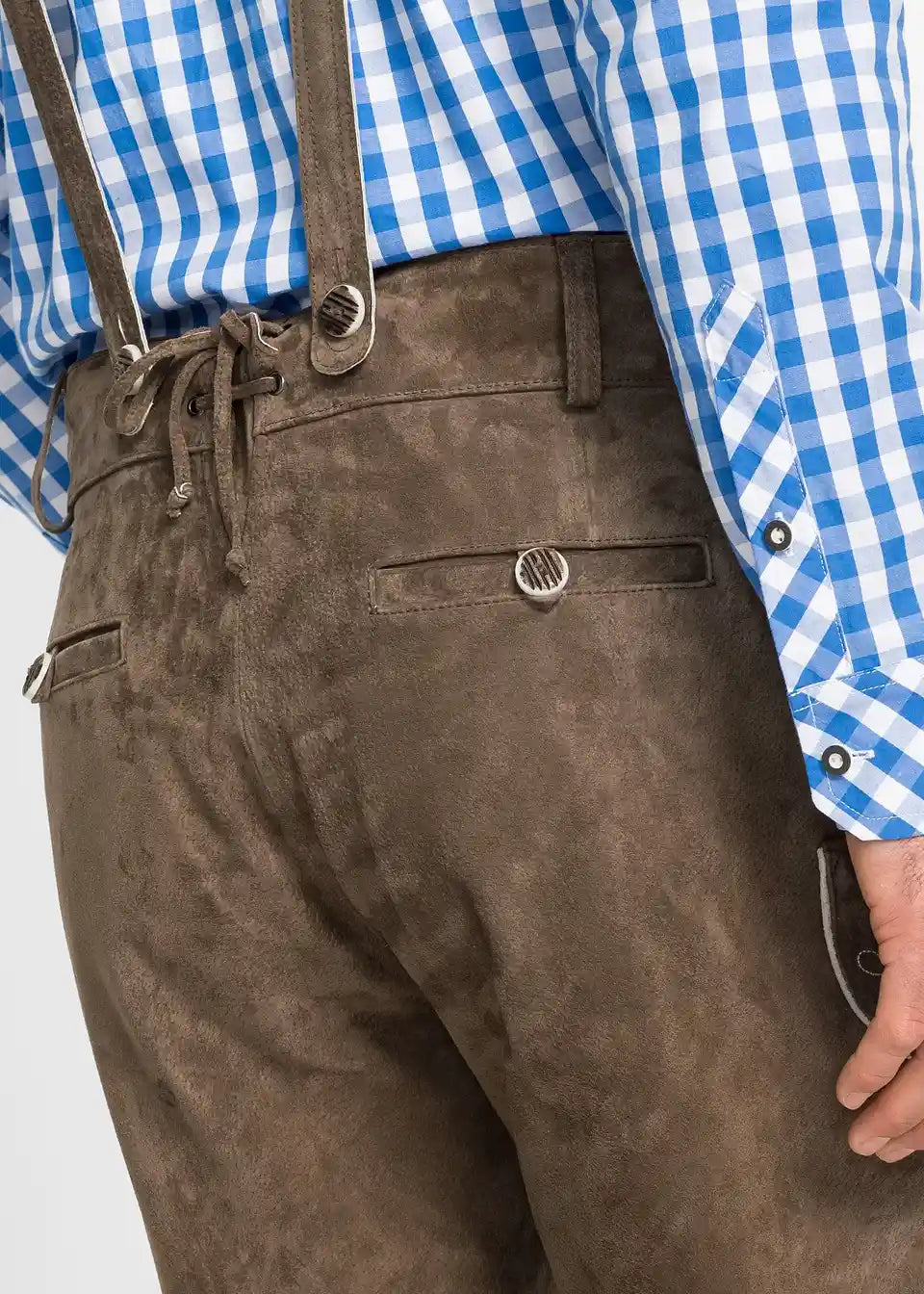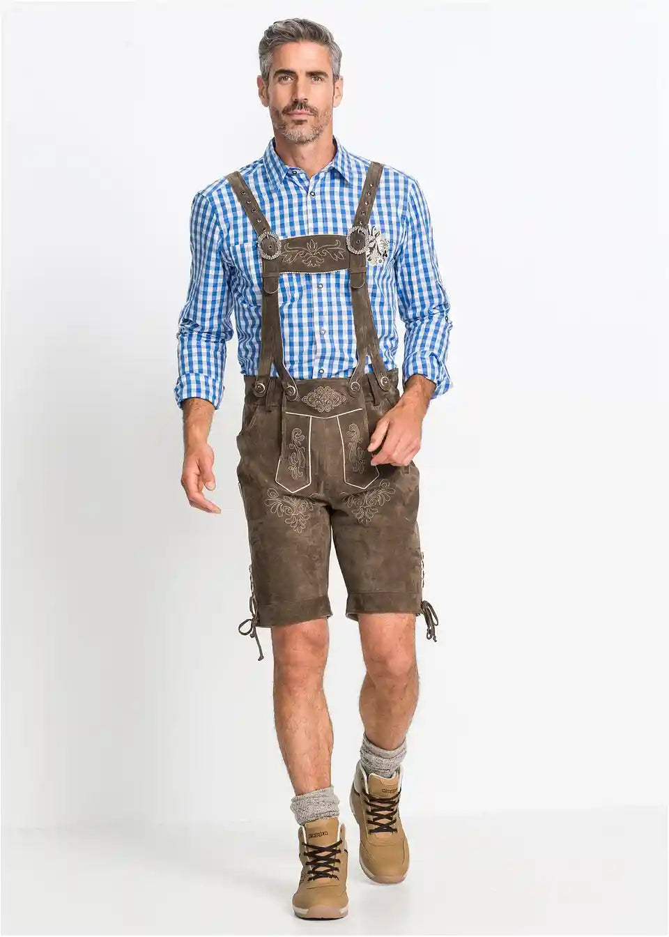 Kratke muške kožne hlače marke selection savršene su za odlazak na Wies‘n ili druge bavarske događaje. Oduševljavaju klasičnim prednjim dijelom, tipičnim gumbima i privlačnim ukrasima. Također, udobnost nošenja je izvrsna zahvaljujući opuštenom Regular Fit kroju. Kombiniraju se s remenom i kariranom košuljom da bi upotpunili izgled.