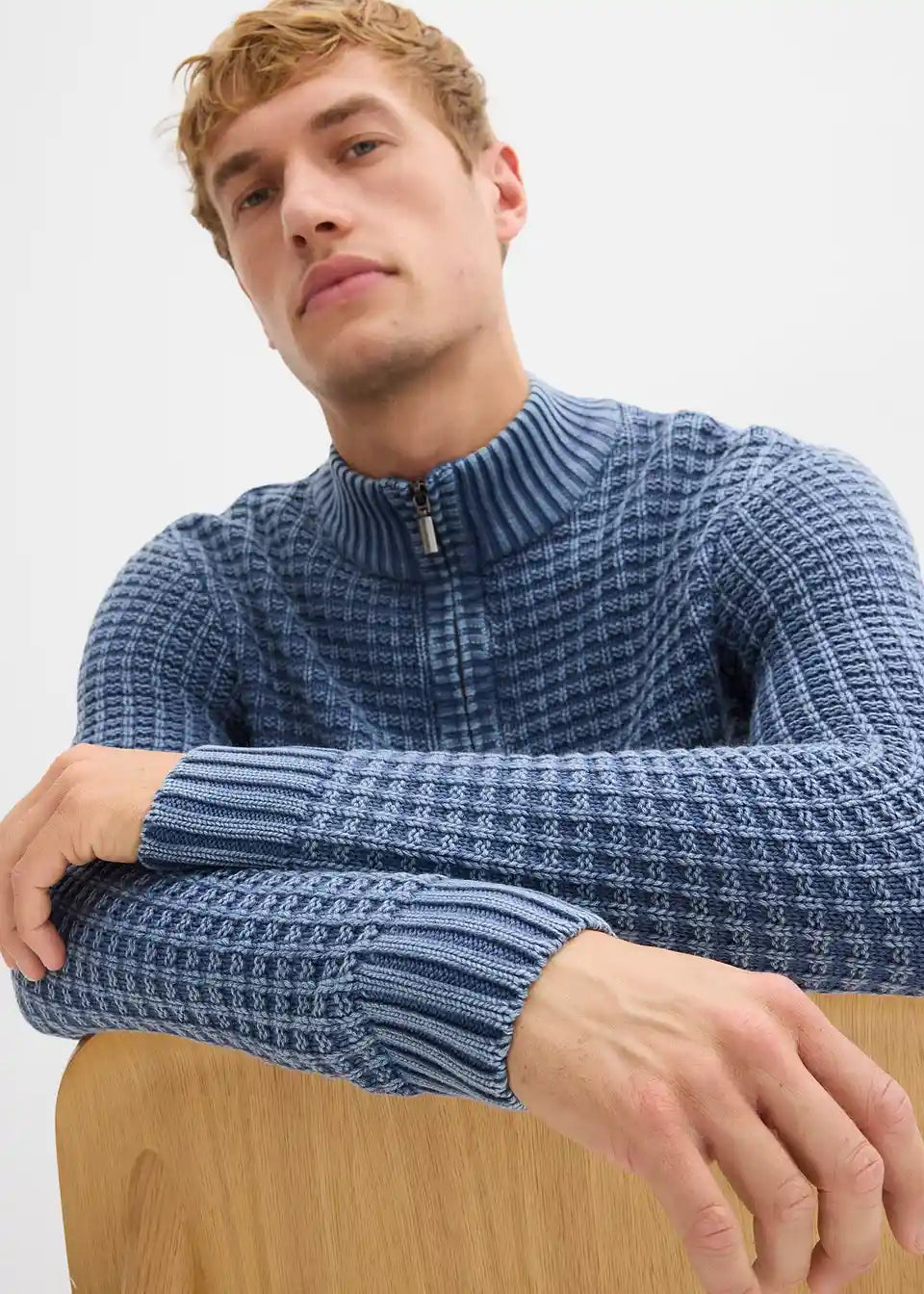 Grubo pleteni pulover s visokim ovratnikom s patentnim zatvaračem ispranog izgleda