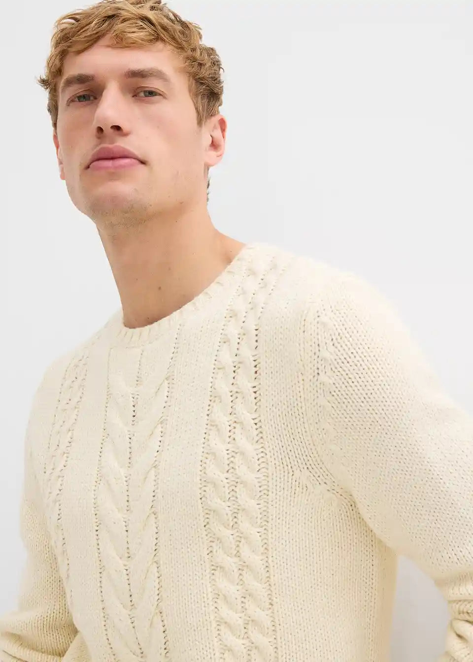 Lijep pulover s pletenim uzorkom, s okruglim izrezom i detaljima od imitacije kože