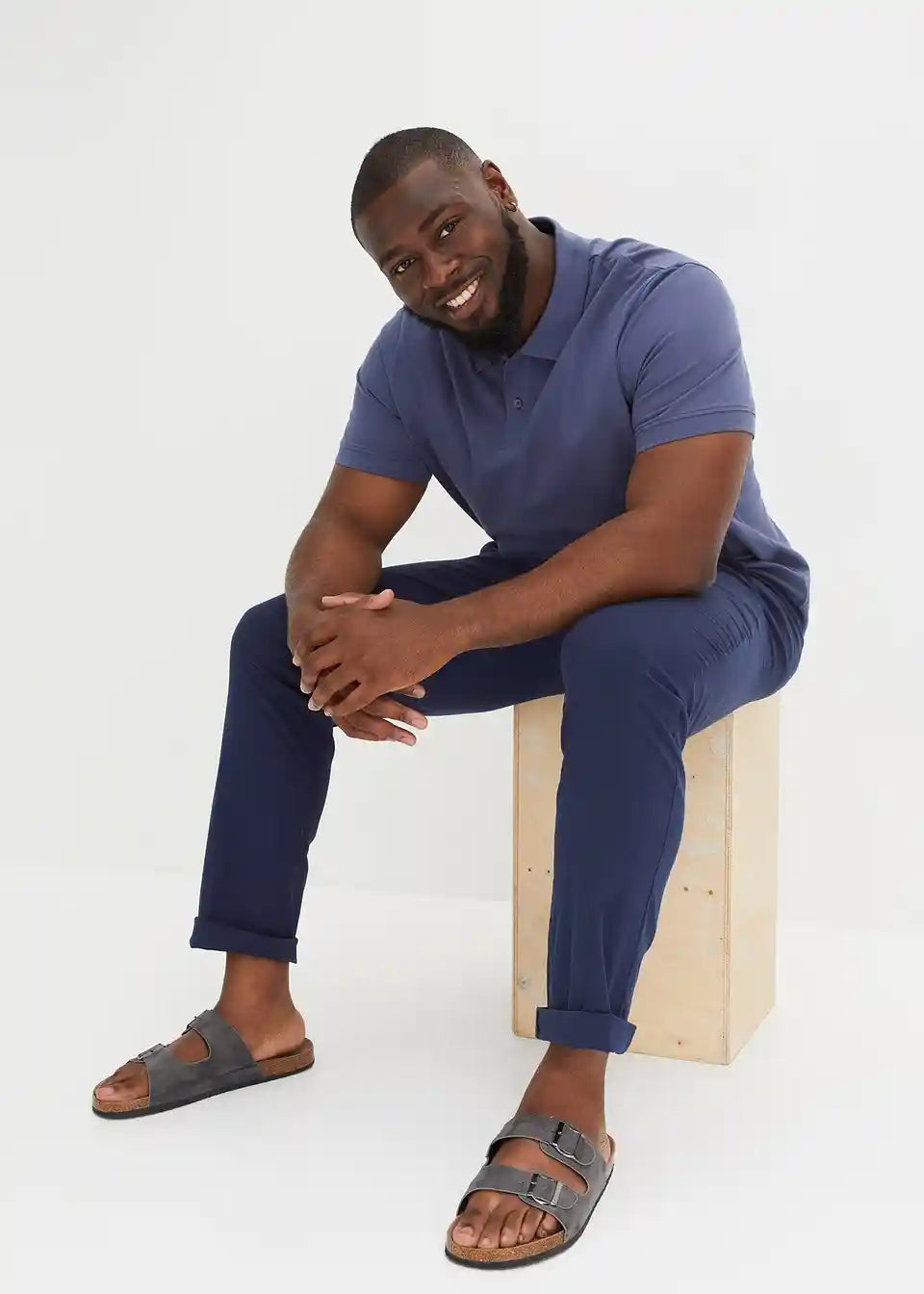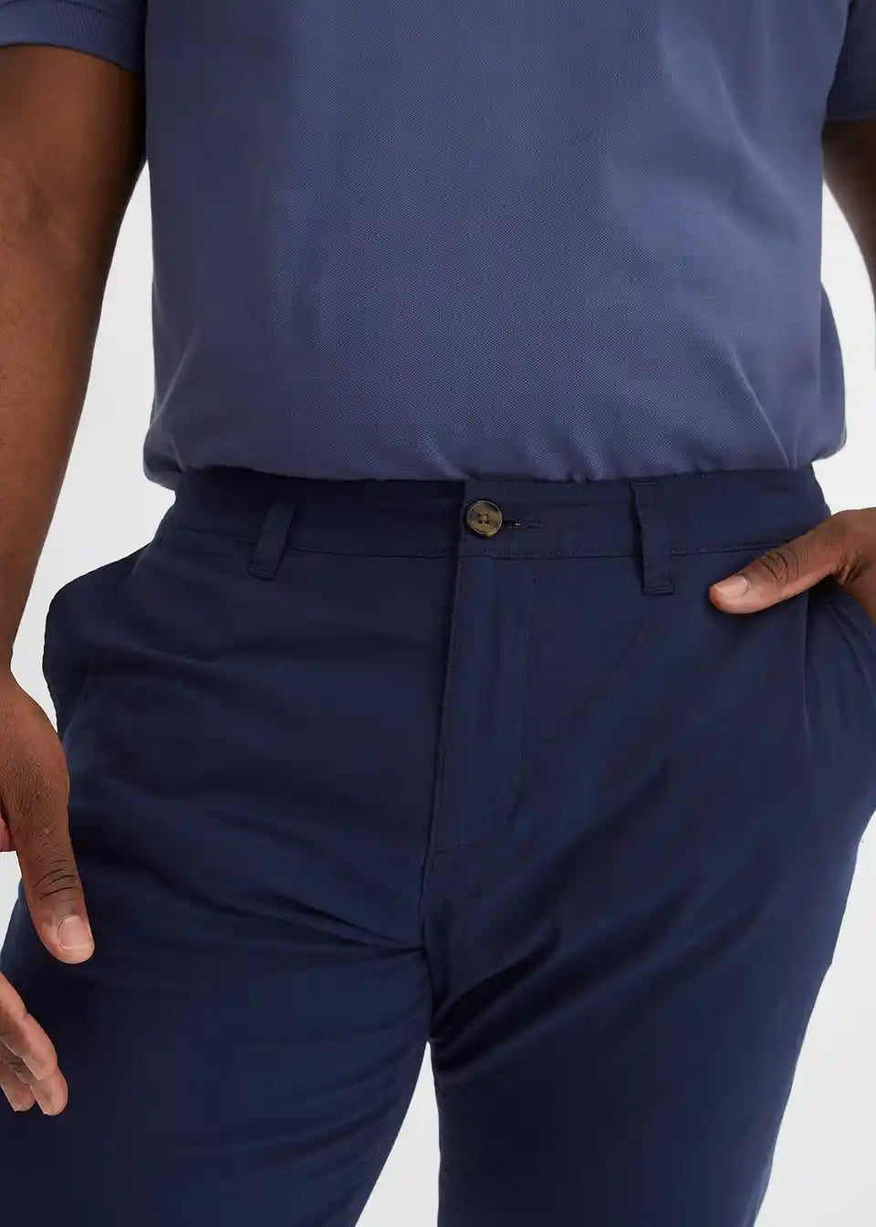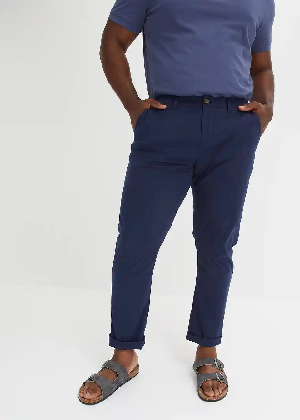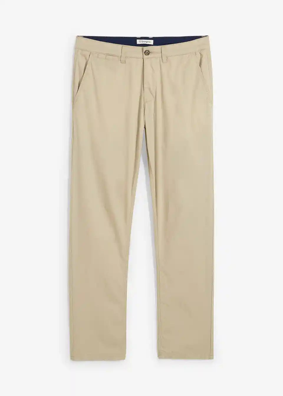 ljetne Chino hlače od lagane mješavine pamuka, normalnog kroja. S bočnim džepovima i paspuliranim džepovima straga s gumbima. Patentni zatvarač i gumb sprijeda.