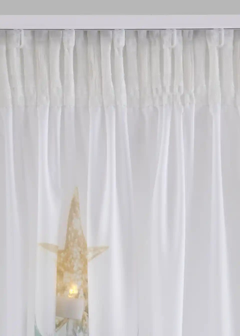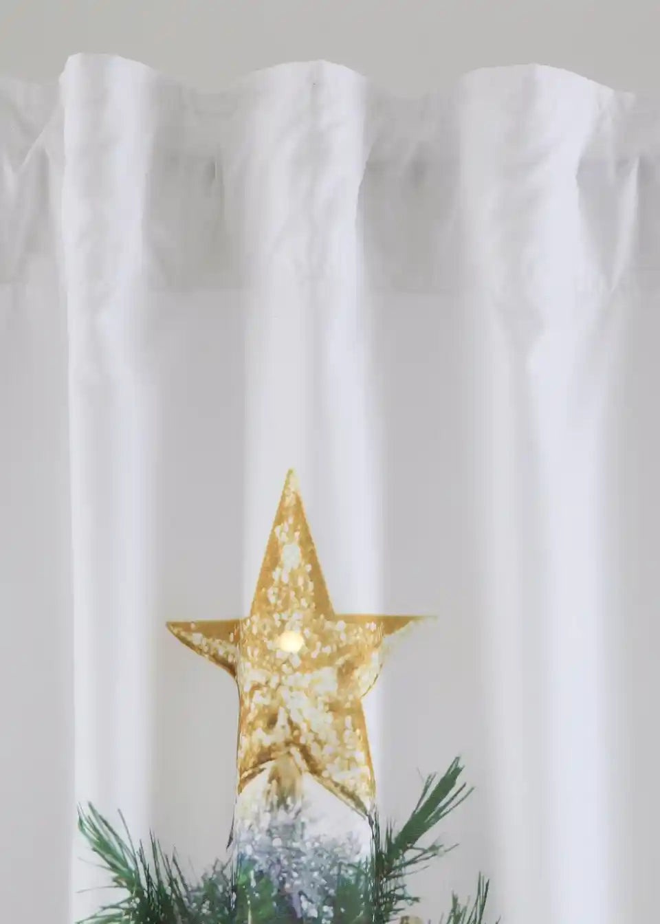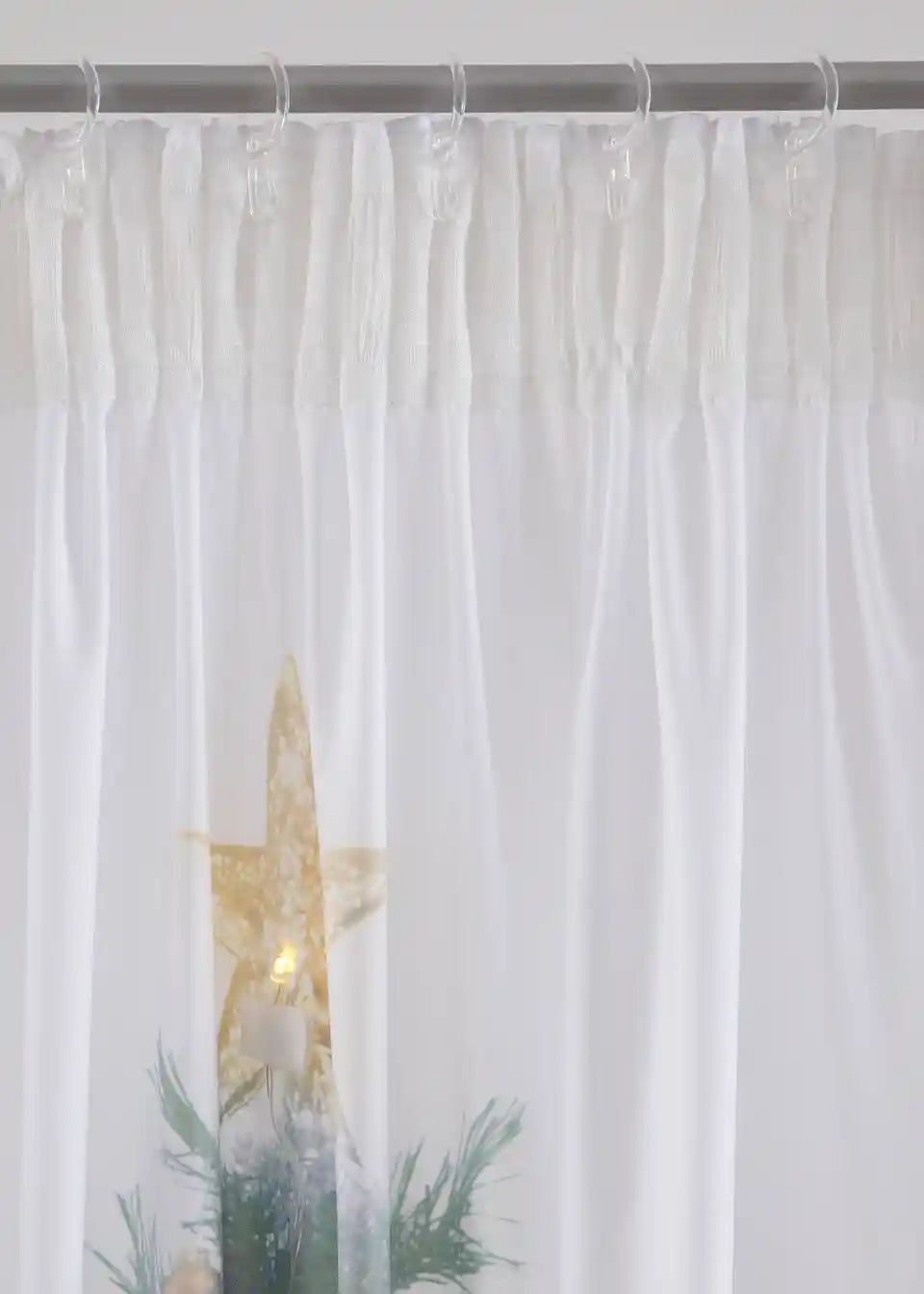 Savršeno božićno drvce za tvoj dom. Naša zavjesa "LED Božićno drvce" oduševljava svojim fotorealističnim printom. Sa 14 LED lampica postaje pravi naglasak u tvojoj dnevnoj sobi. Stražnja strana je svijetla, bez printa, s LED lampicama, potrebnim kabelom i kutijom za baterije. Rasvjeta se može lako odvojiti od zavjese, što ju čini jednostavnom za pranje. Za rasvjetu su potrebne dvije AAA baterije. Dimenzije ove zavjese su cca 230x140 cm. Zavjesa se postavlja pomoću multifunkcijske trake.