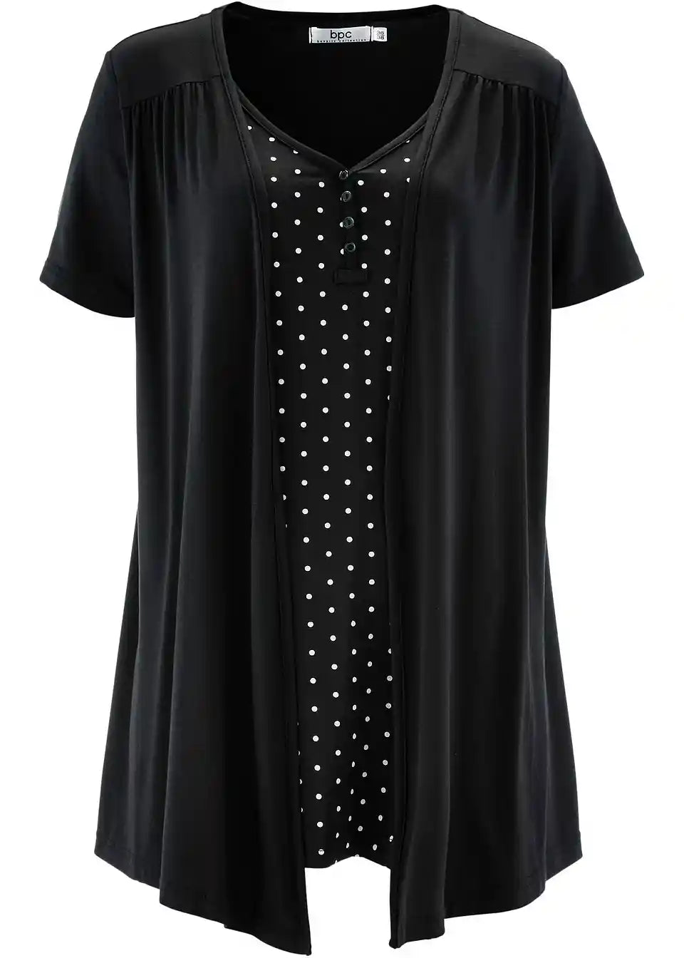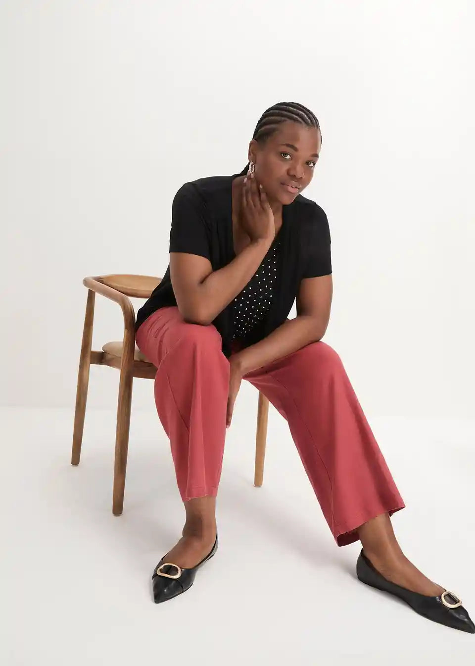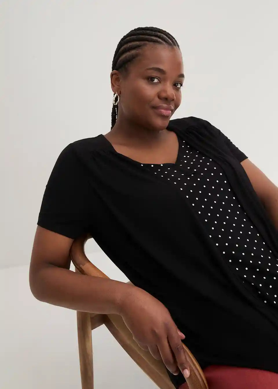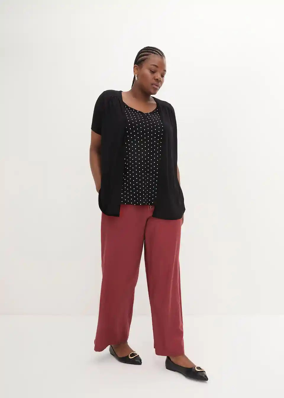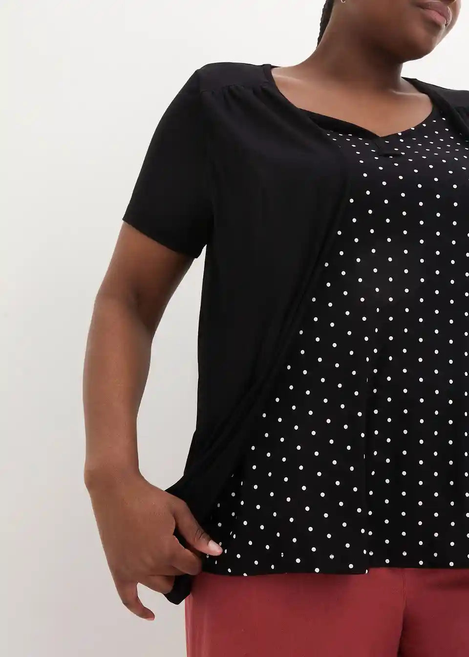 Majica Two-in-One brenda bpc impresionira mnogim modernim detaljima. Vizualno podsjeća na majicu s jaknom, ali zapravo ima samo jedan stražnji dio dok je prednji dvostruko izrađen. Donja majica je krojena uz tijelo i ima lijepi uzorak s točkicama. Na izrezu se nalazi dekorativni red gumba. Gornja majica ležerno pada u malim naborima iznad i ima modernije produžene krajeve rubova. Majica nudi brojne mogućnosti kombiniranja. Unutarnju majicu možete nositi u struku ili ostaviti oba dijela da slobodno padaju preko uskih tajica.