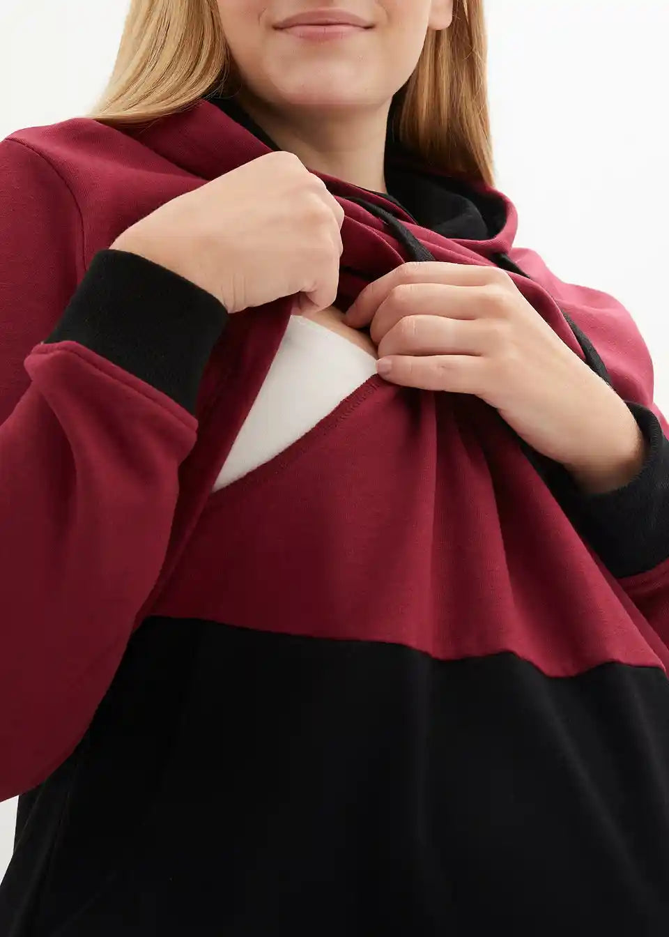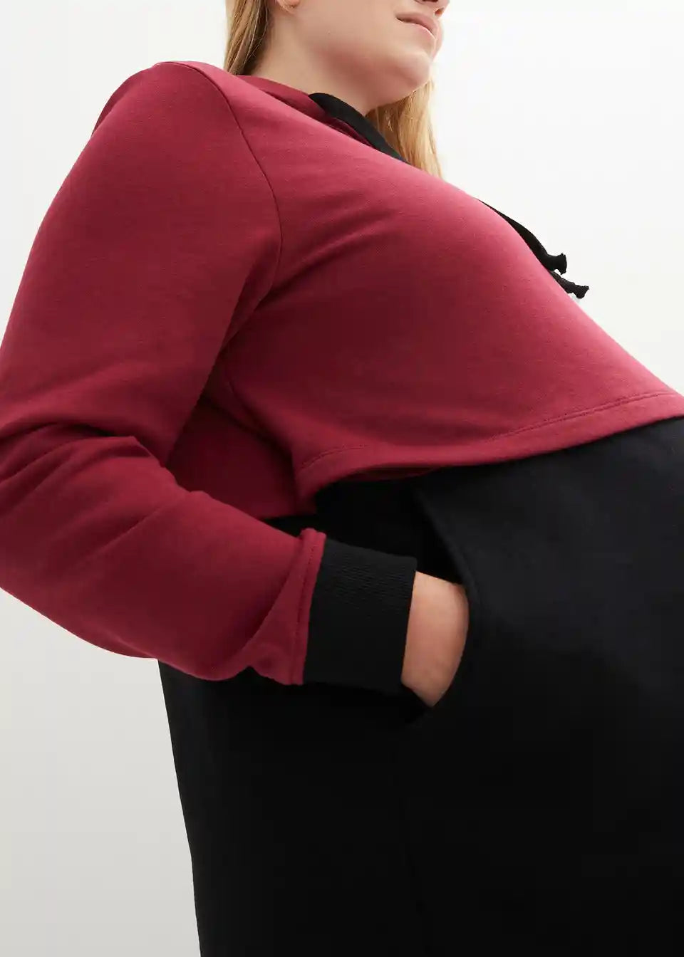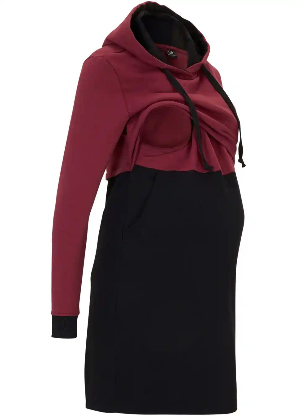 Haljina od sweat materijala s mekanom brušenom unutarnjom stranom. S kapuljačom na vezanje i dugim rukavima. Ispod gornjeg dijela nalazi se drugi sloj s prorezima za dojenje. Dizajn s dvostrukim slojevima pomaže u sprječavanju gubitka topline i omogućuje ugodno dojenje majci i djetetu.