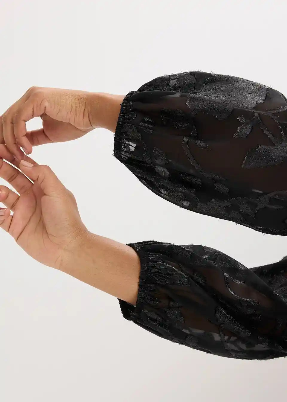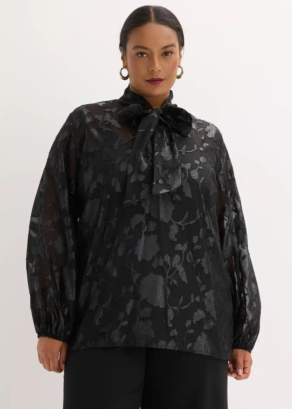 Moderna i ženstvena: Bluza s cvjetnim vezom, sjajem i vezicama na ovratniku