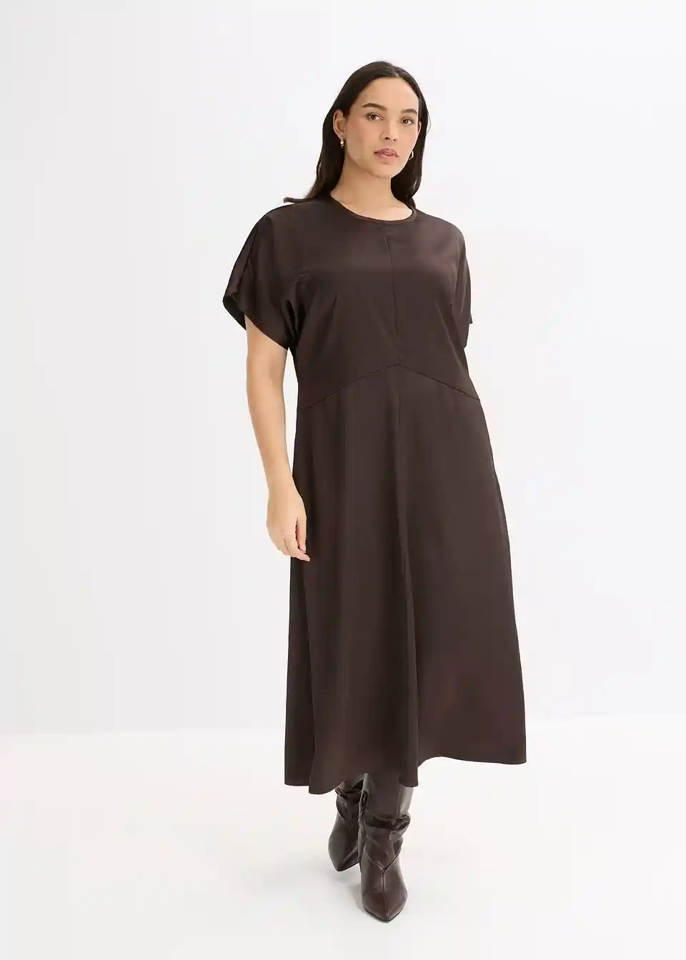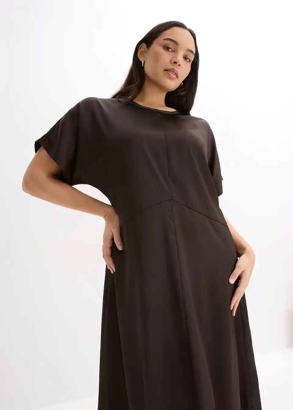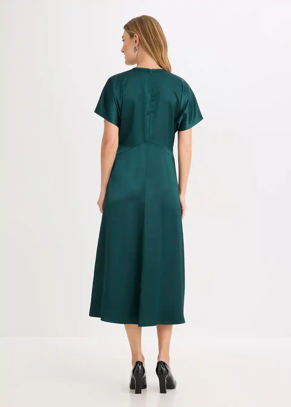 Midi haljina od tekućeg satena ima strukiranu siluetu i široke rukave