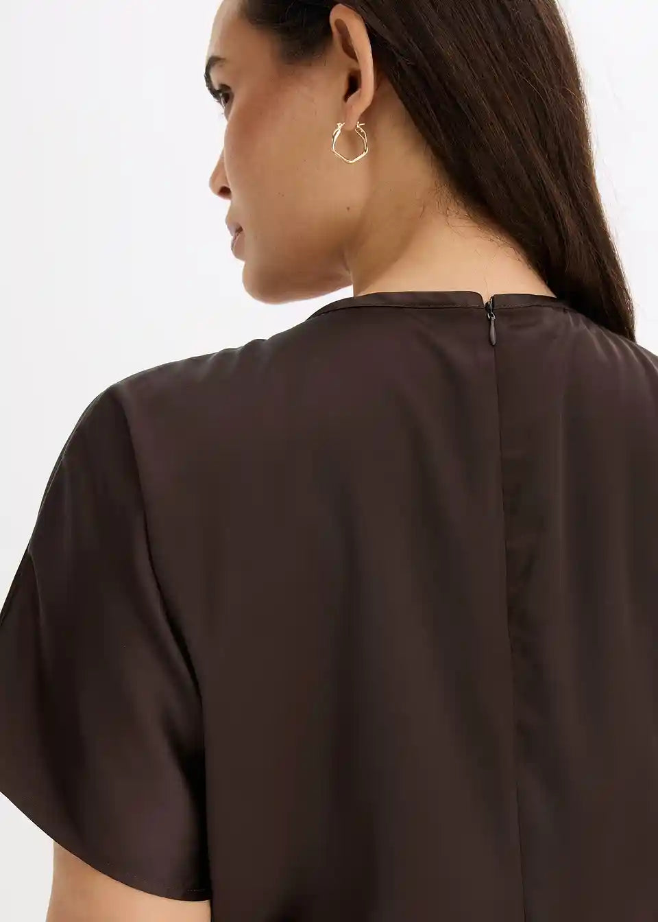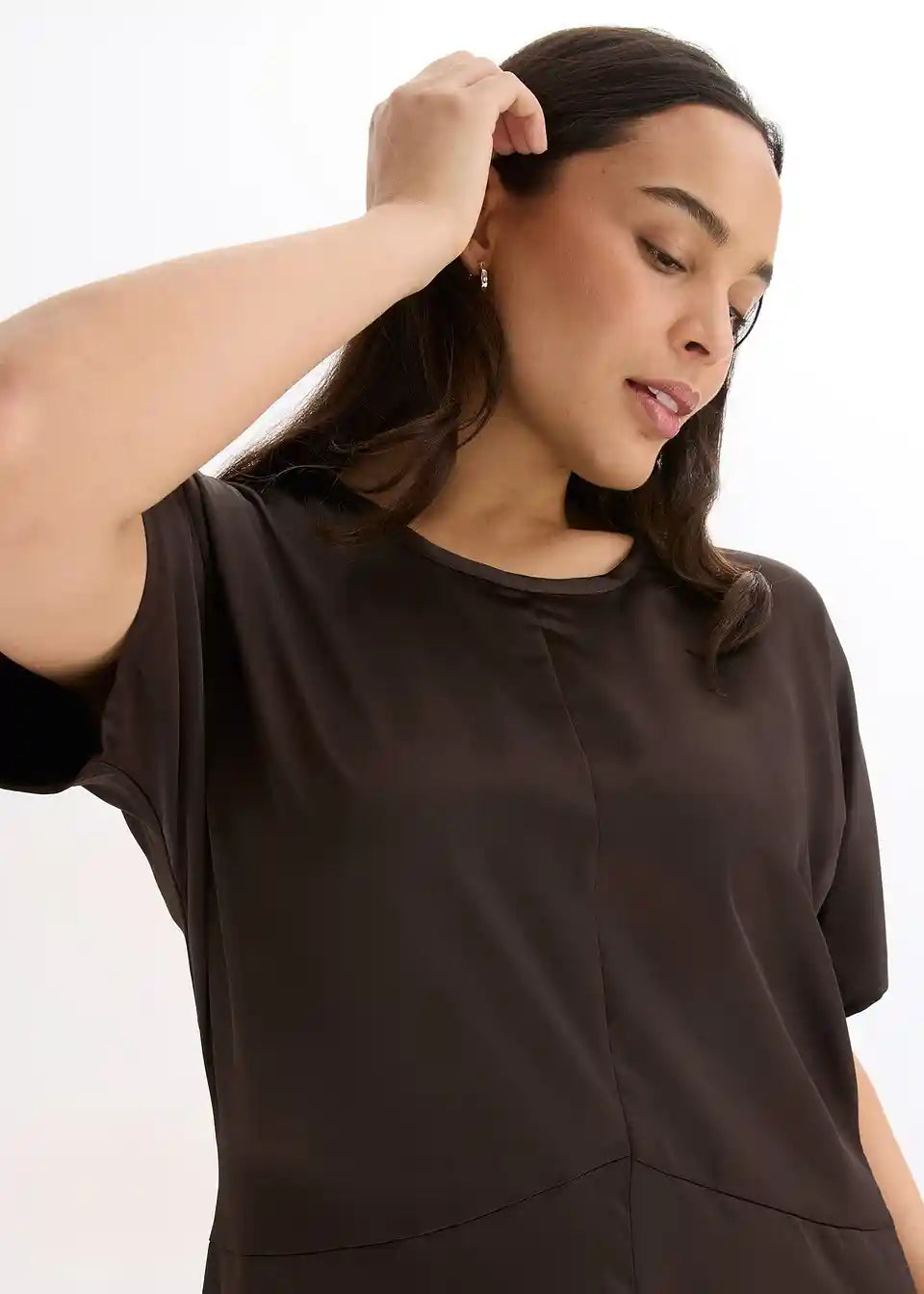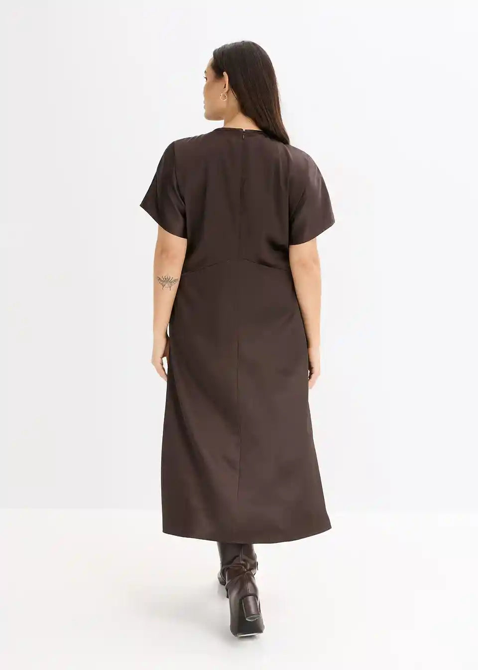 Midi haljina od tekućeg satena ima strukiranu siluetu i široke rukave