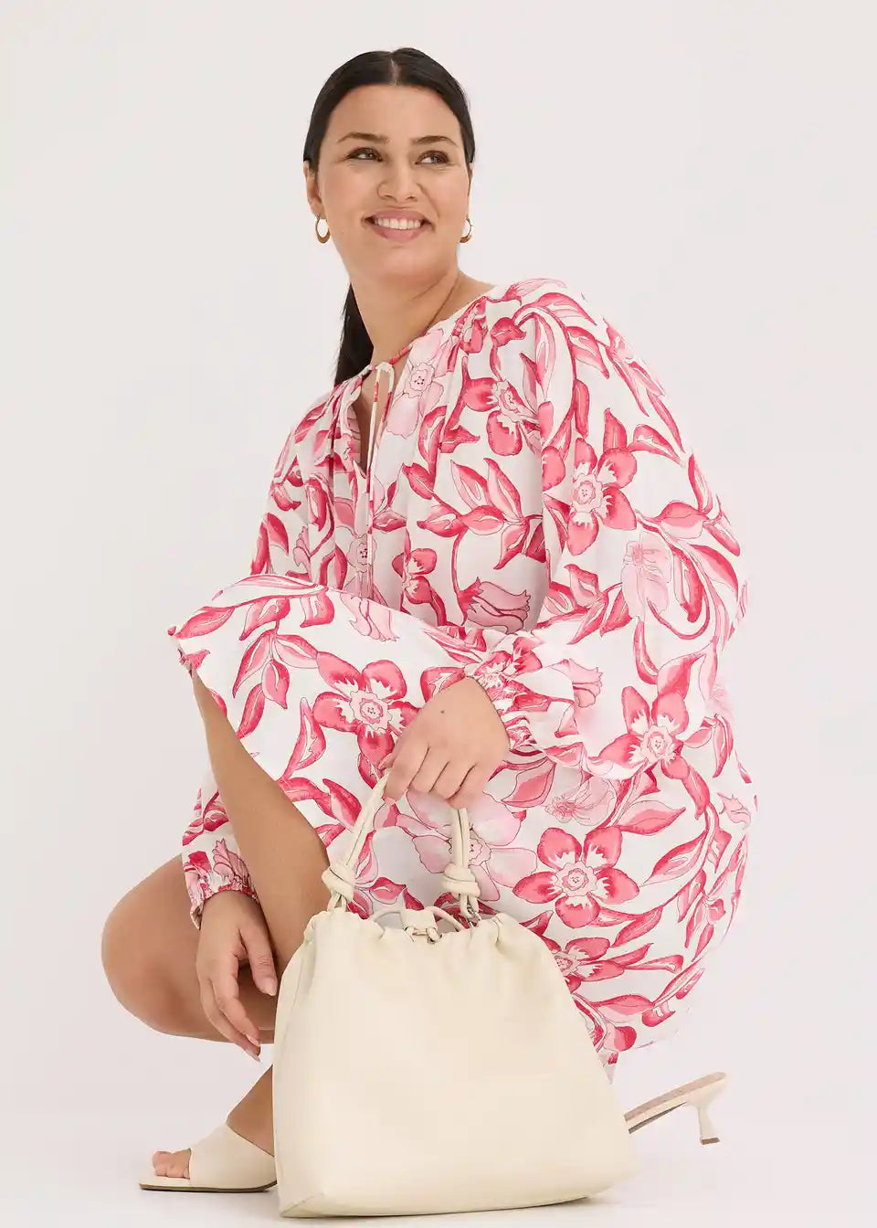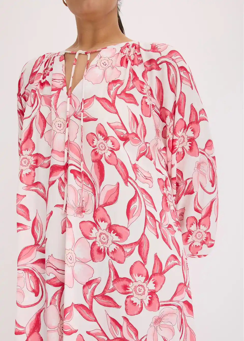 kratka tunika haljina od lepršave viskoze s cvjetnim printom i vezicom na izrezu sprijeda