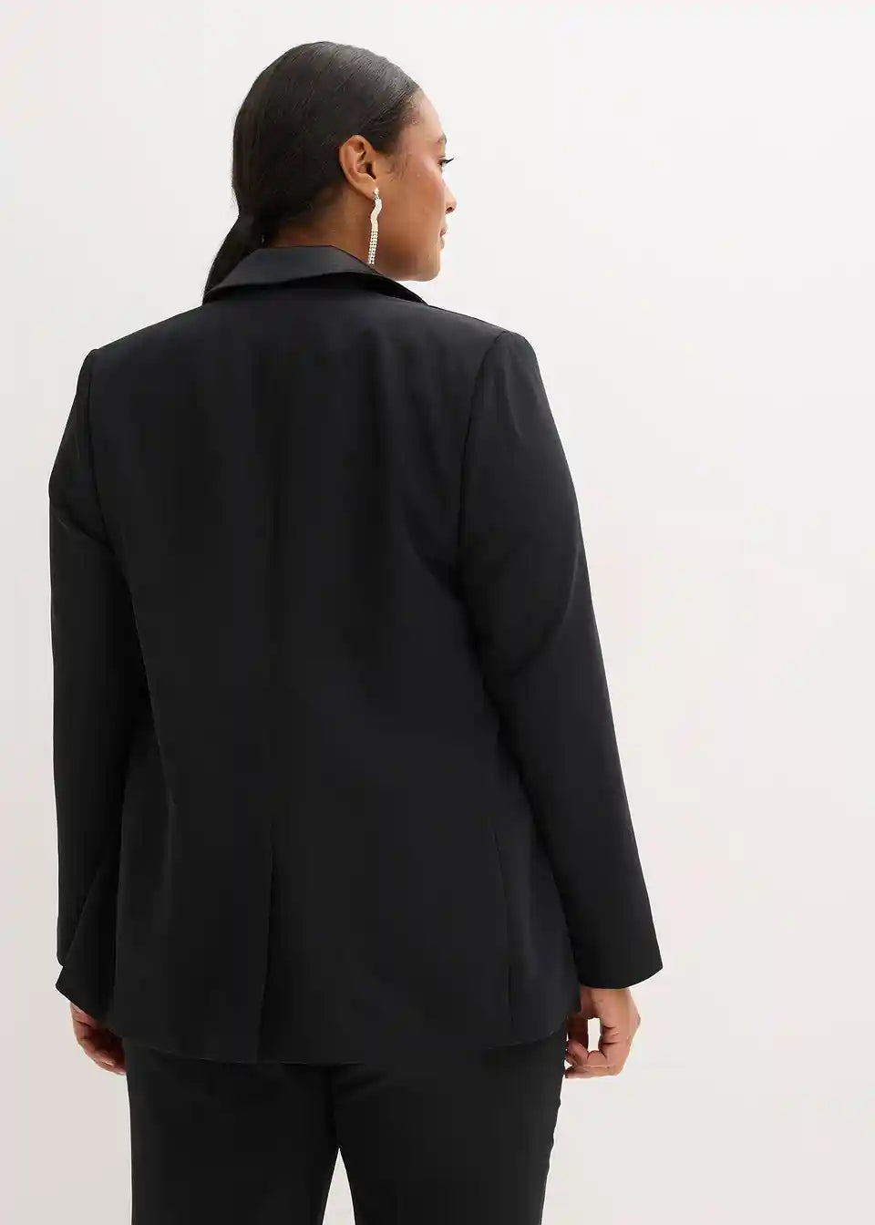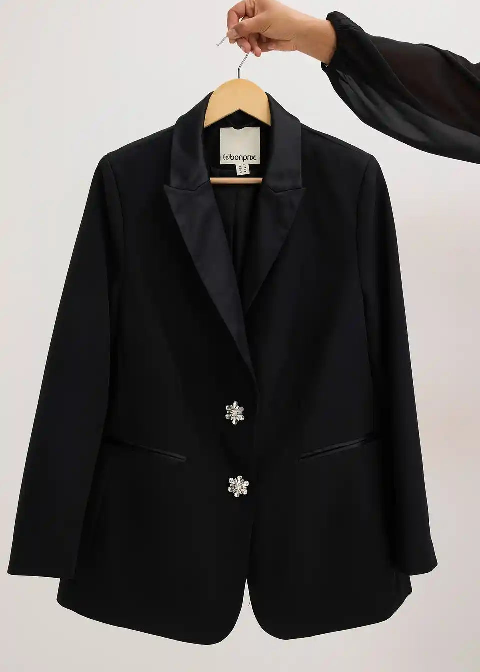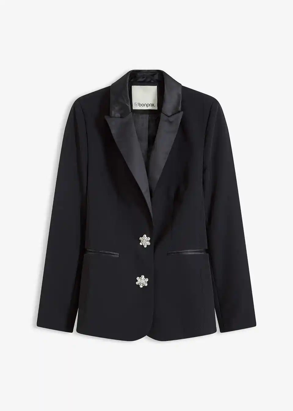 Moderan i ženstven: blazer s sjajnim satenskim ovratnikom i ukrasnim gumbima