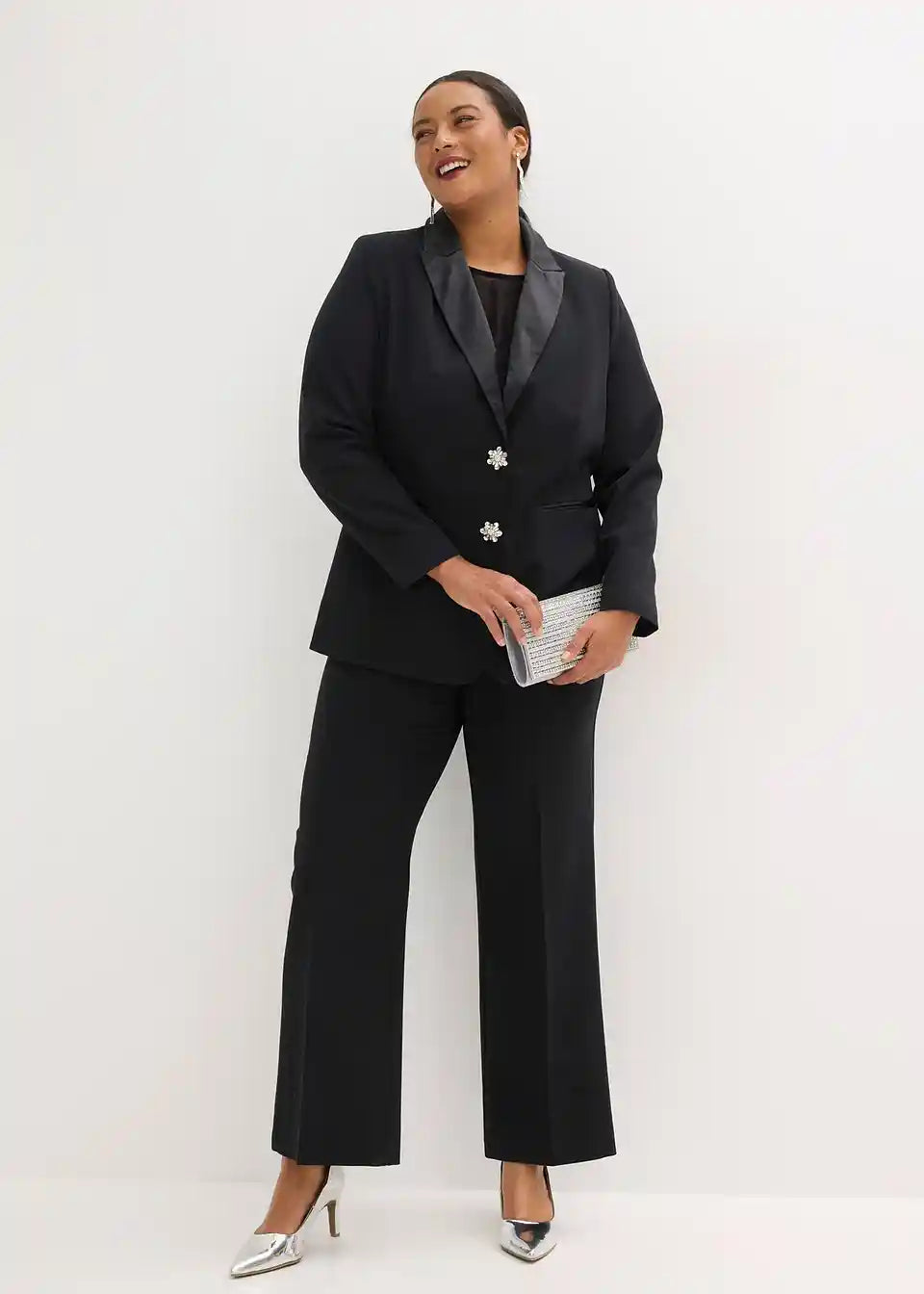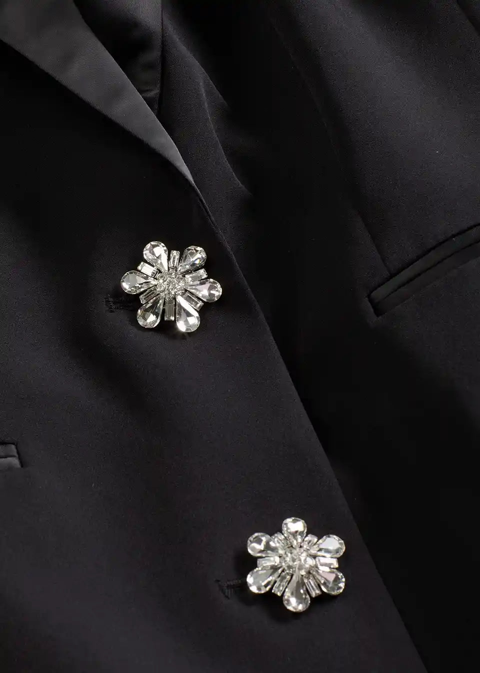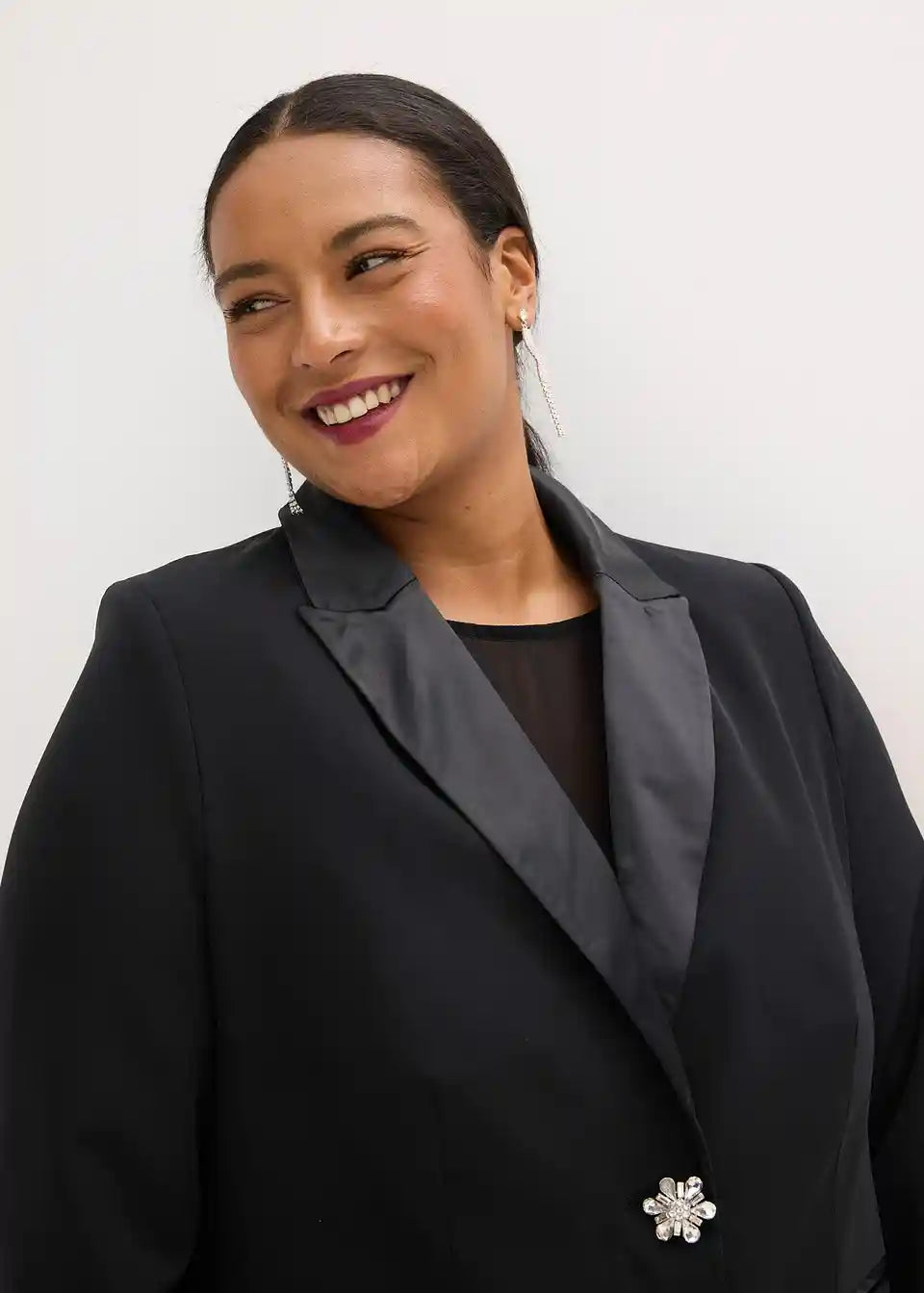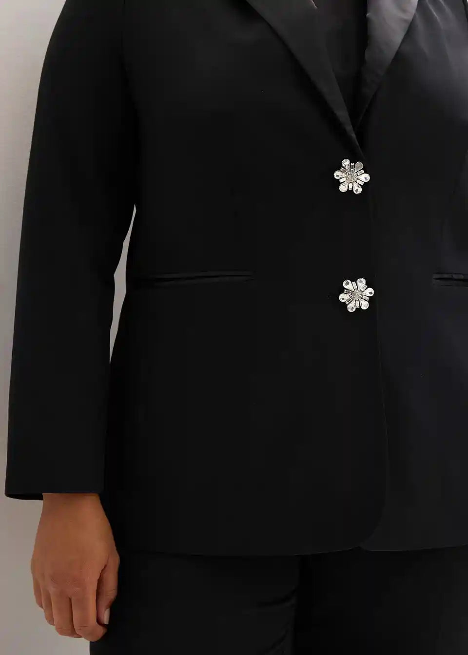 Moderan i ženstven: blazer s sjajnim satenskim ovratnikom i ukrasnim gumbima