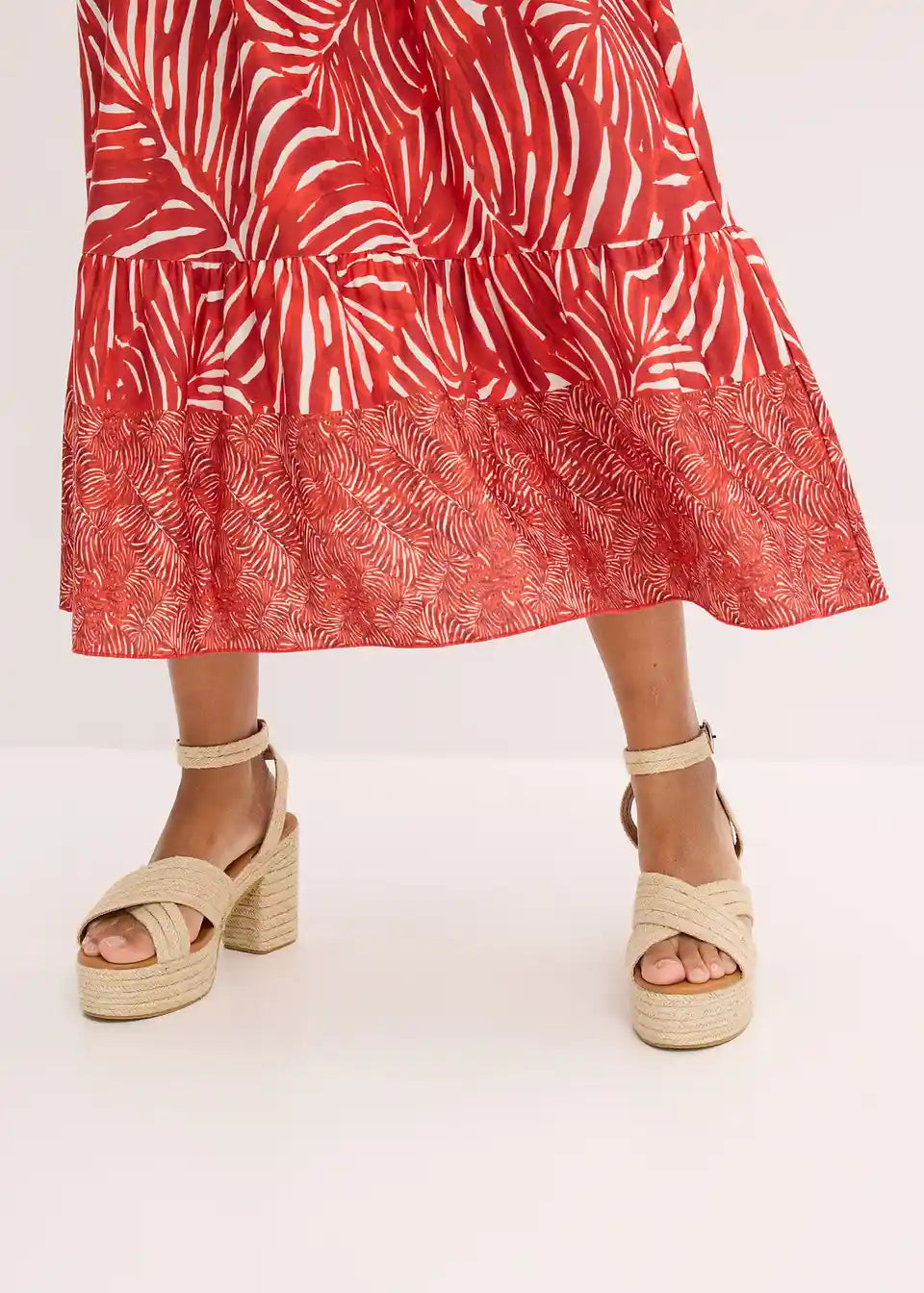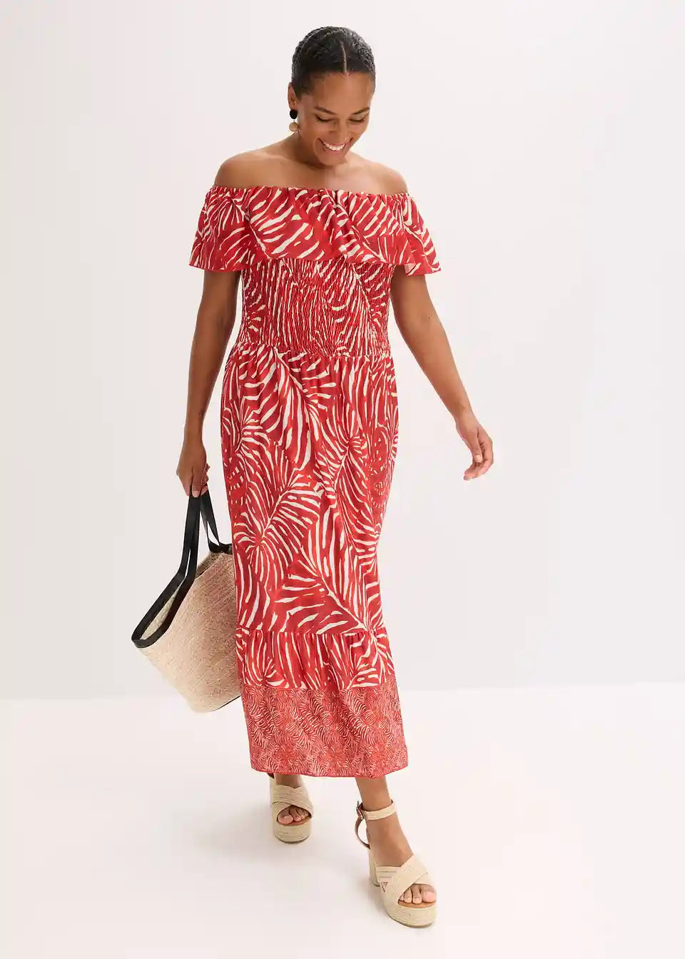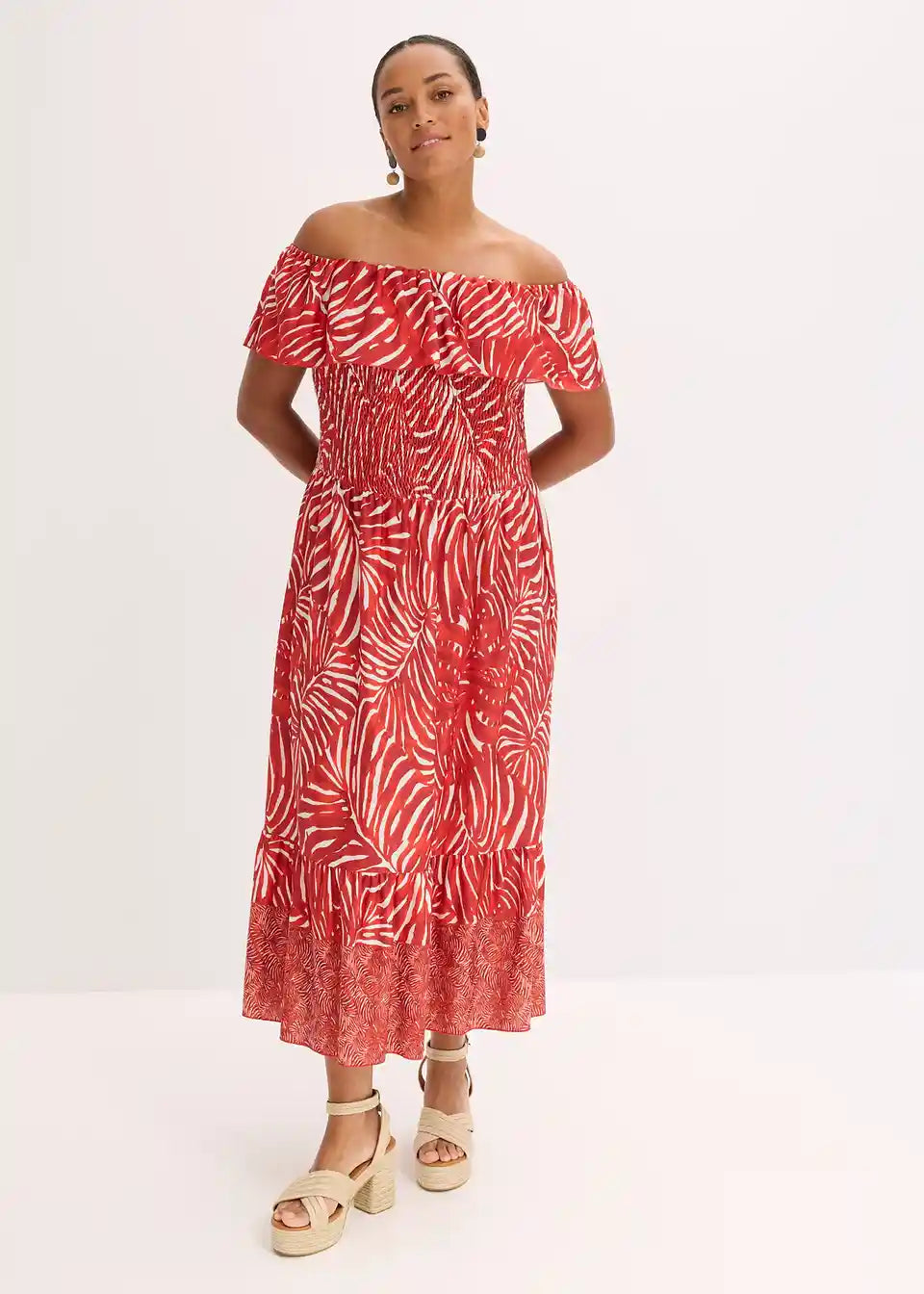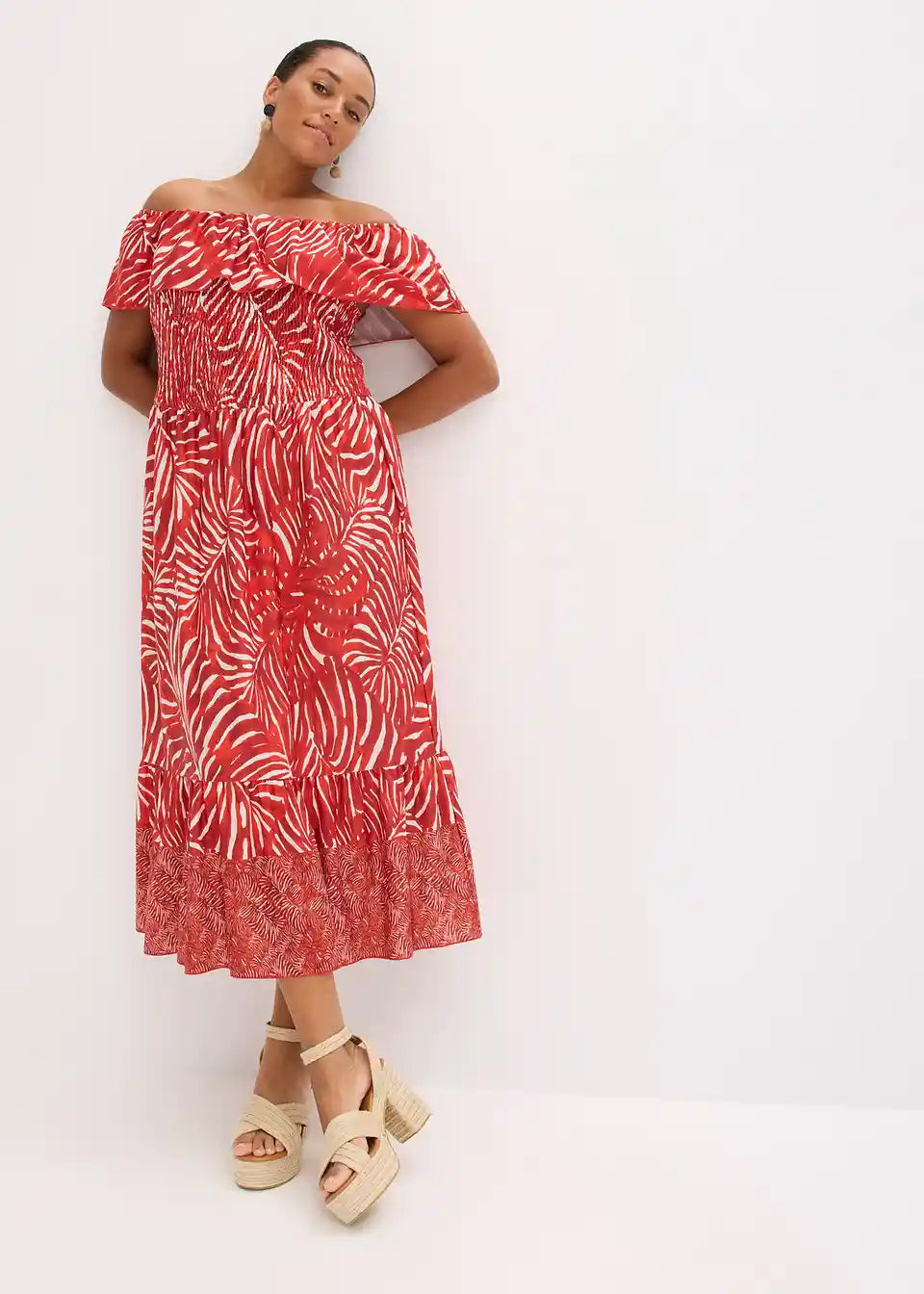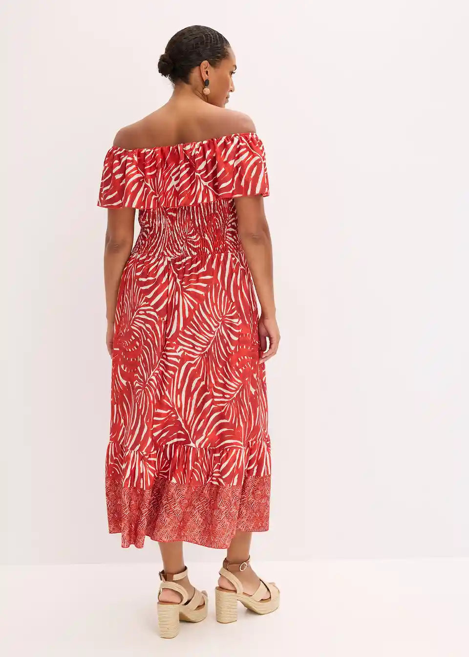 moderna, printana jersey Carmen-haljina sa smok detaljem na gornjem dijelu i volančićima na izrezu i porubu