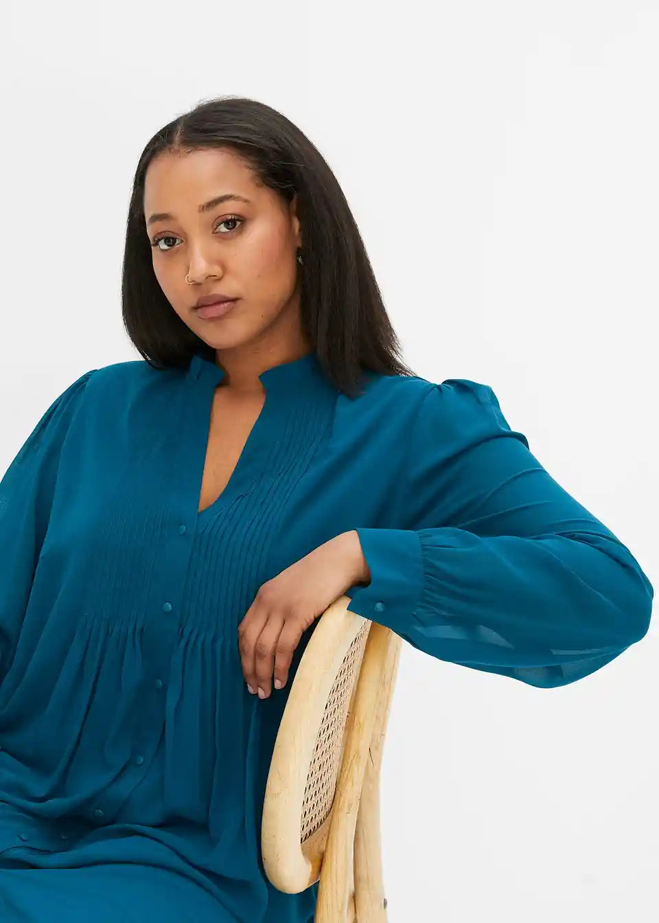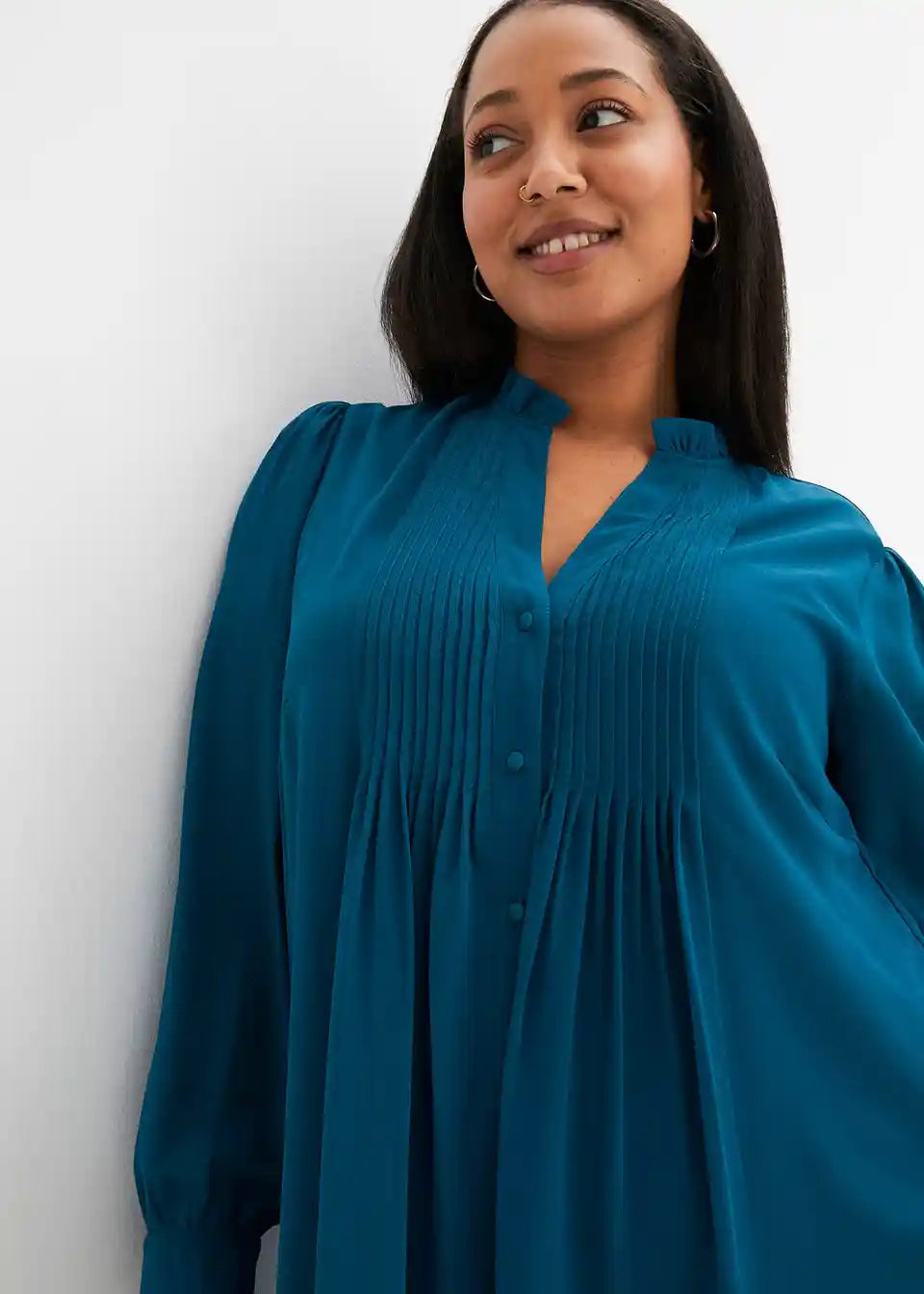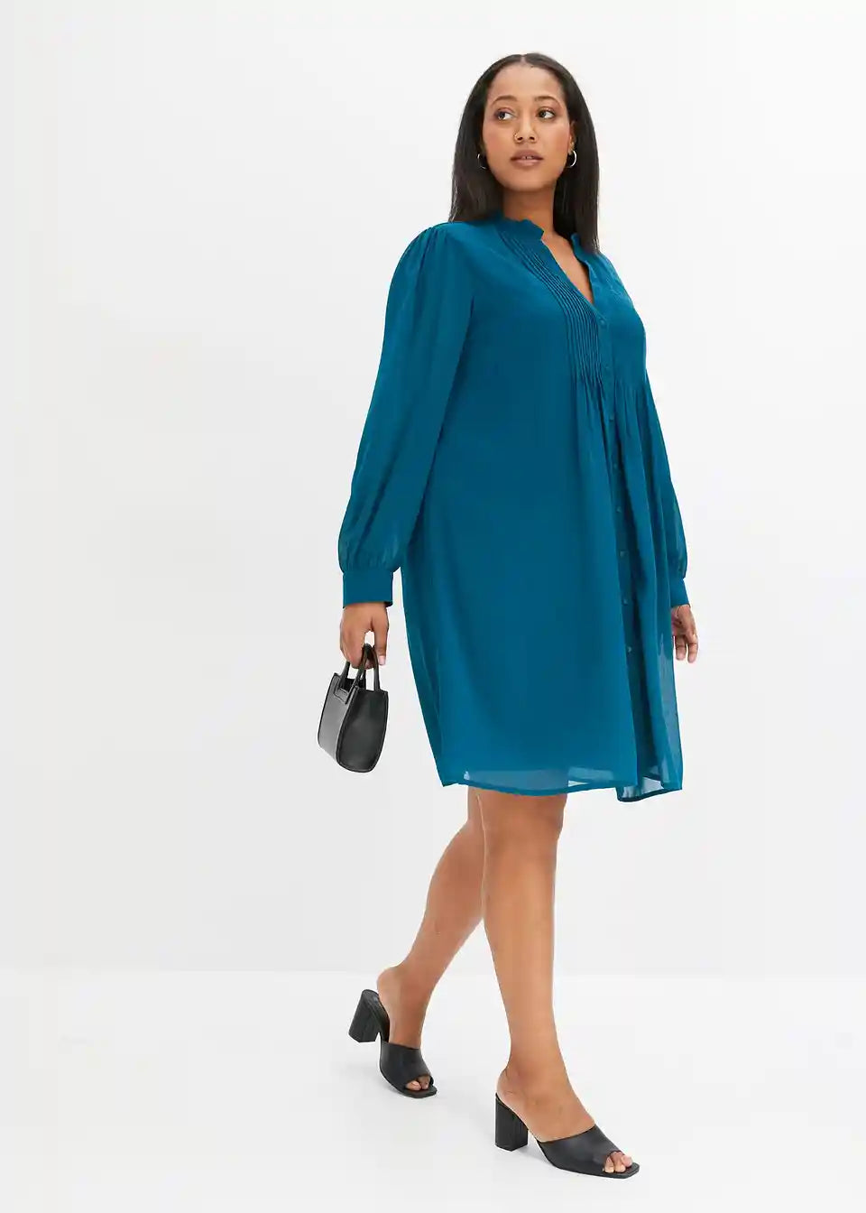 Ženstvena haljina s naborima sprijeda na izrezu