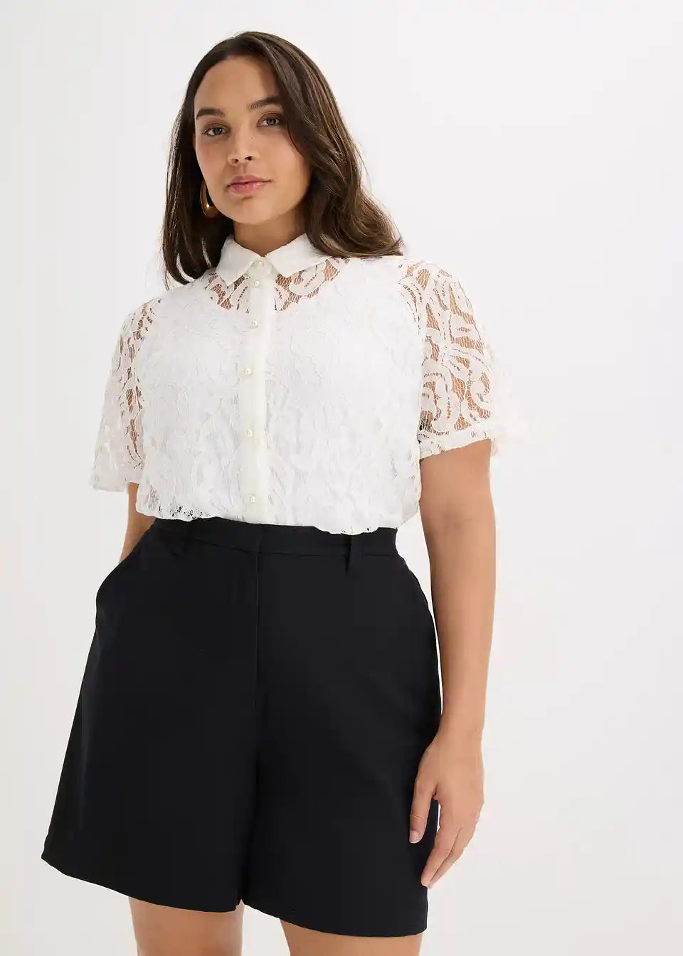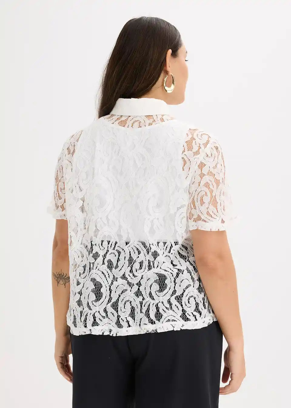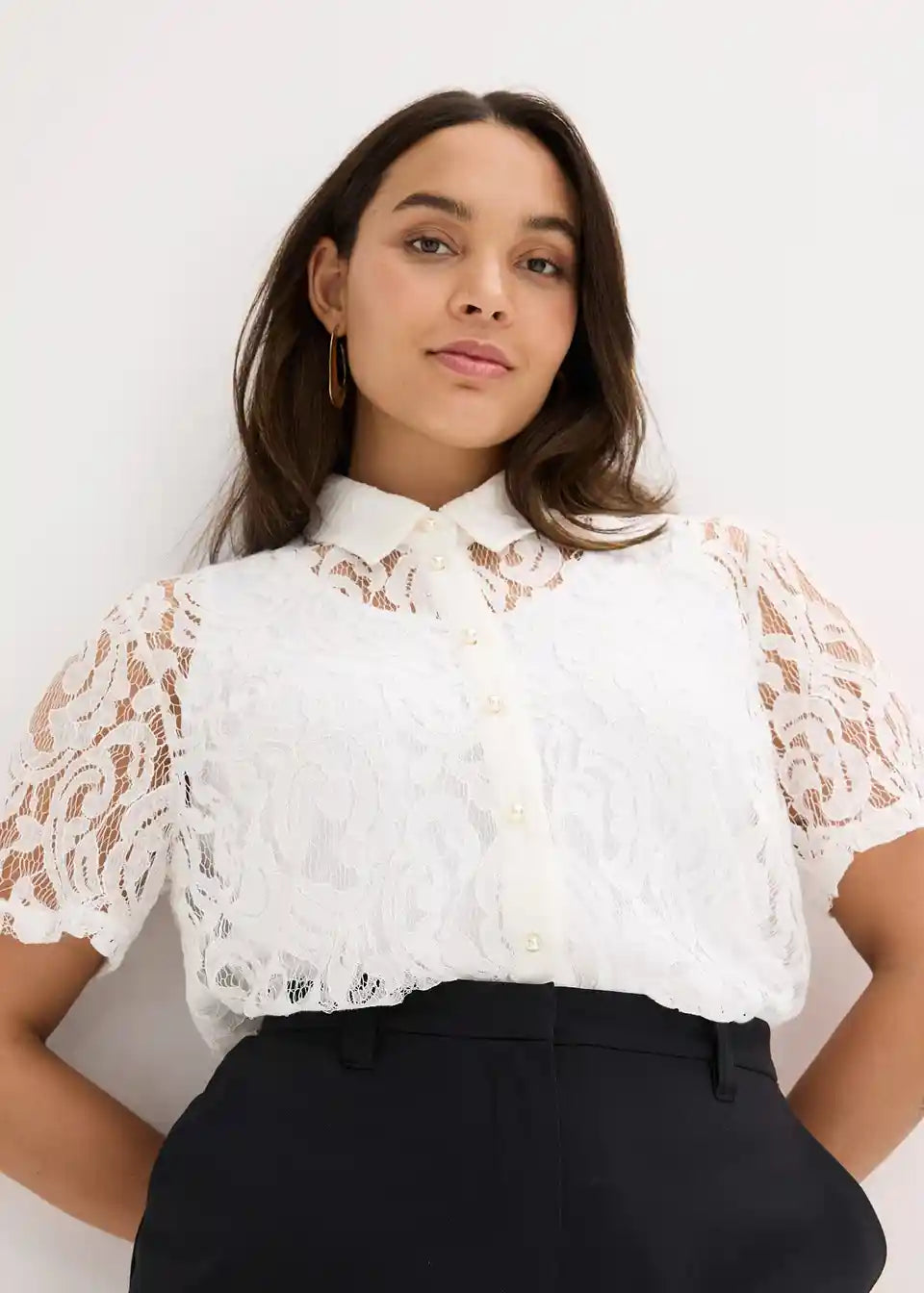 ženstvena čipkasta bluza s ukrasnim gumbima s biserima sprijeda