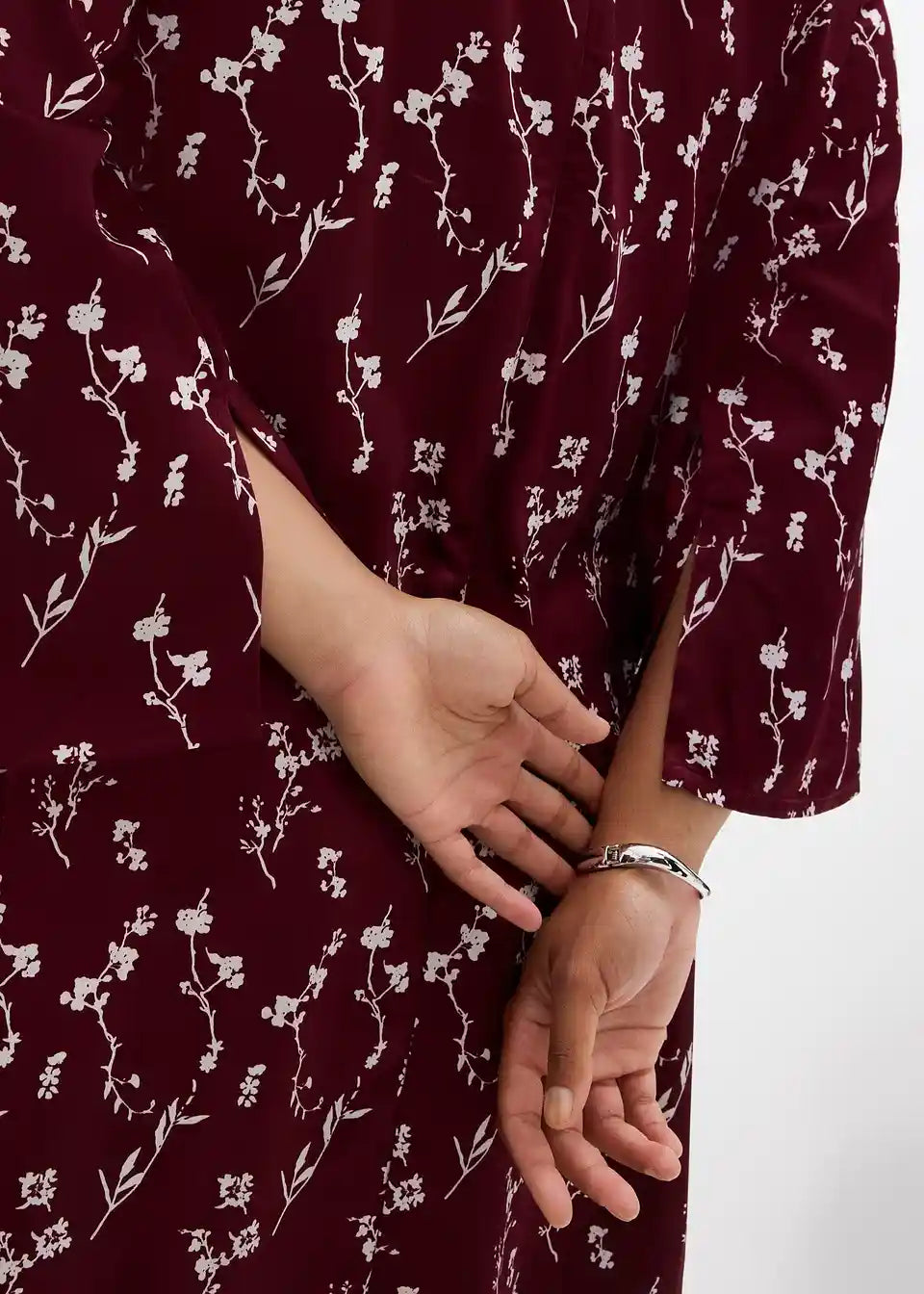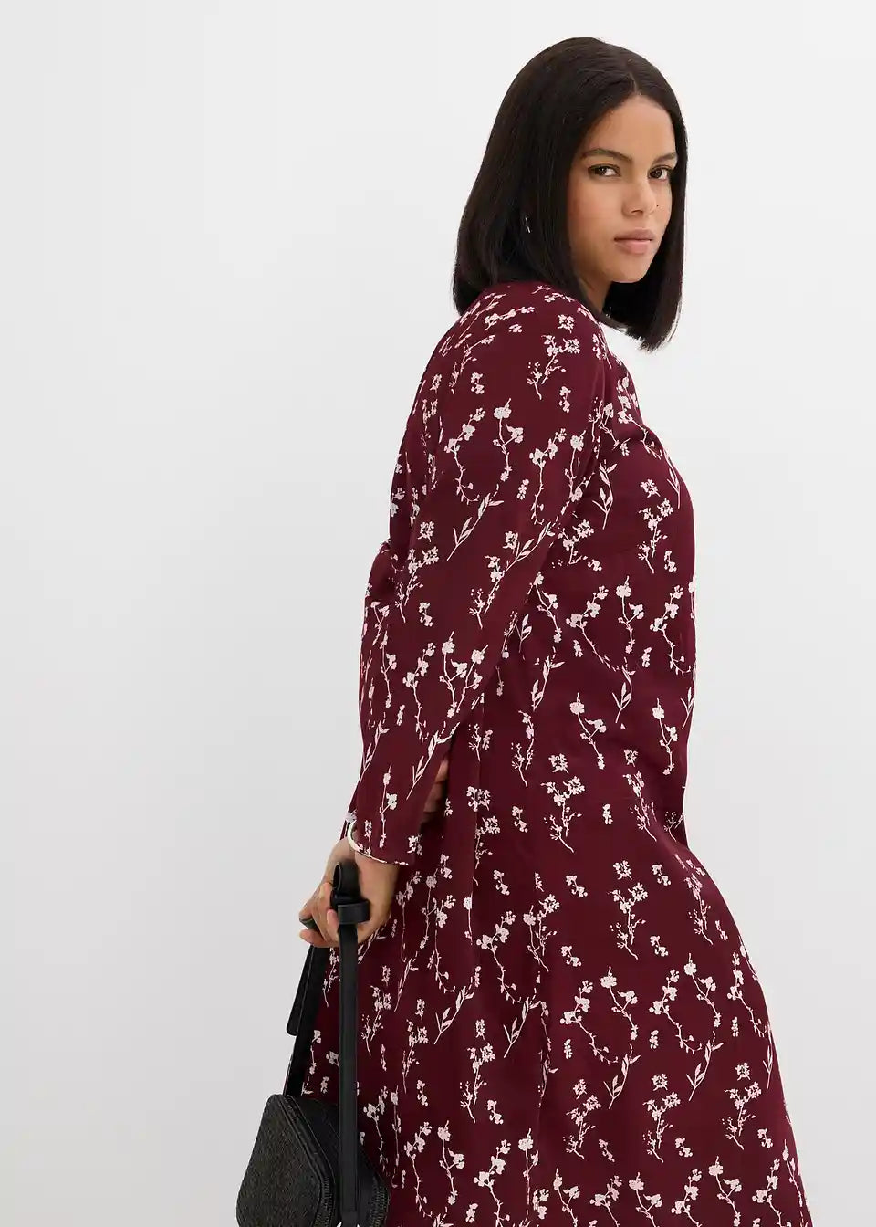 Midihaljina s lepršavim zvonastim rukavima, patentnim zatvaračem na leđima i cvjetnim uzorkom